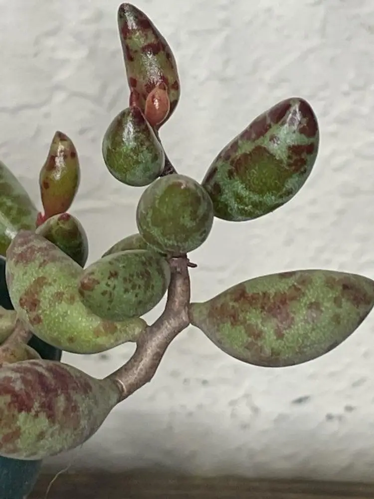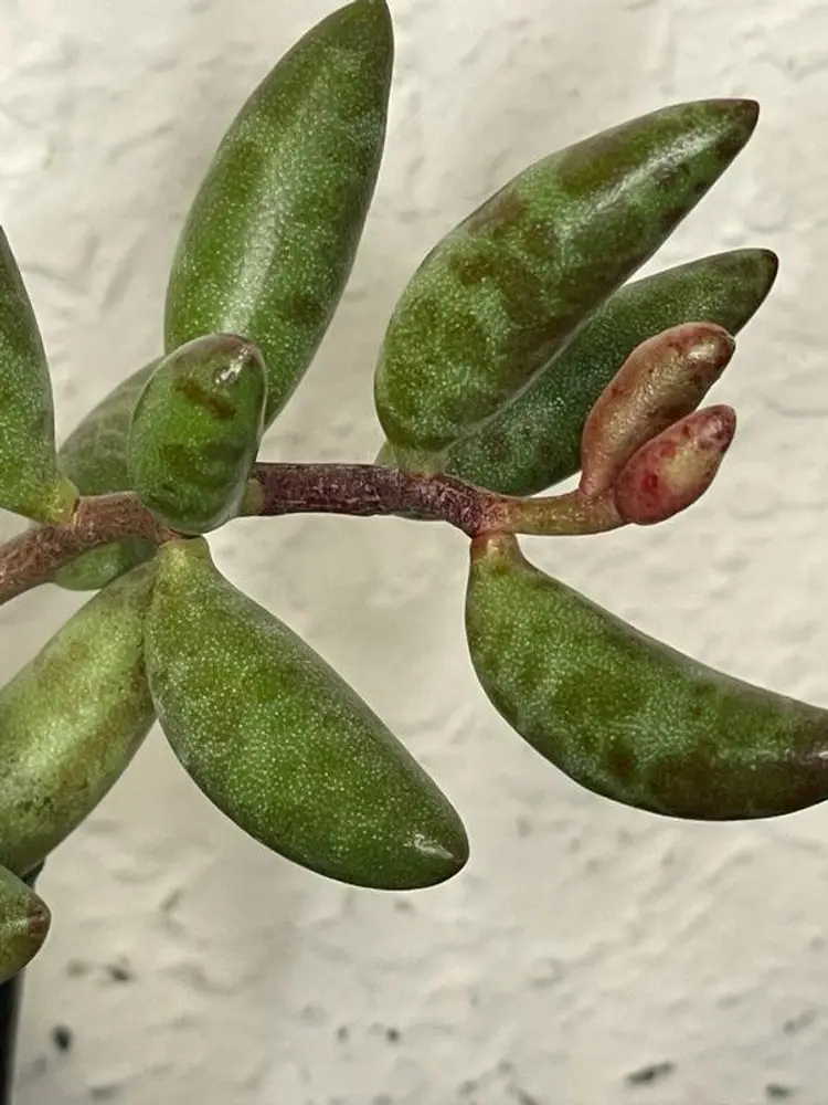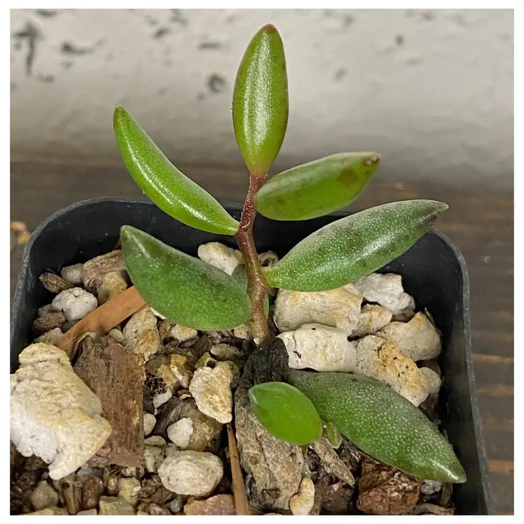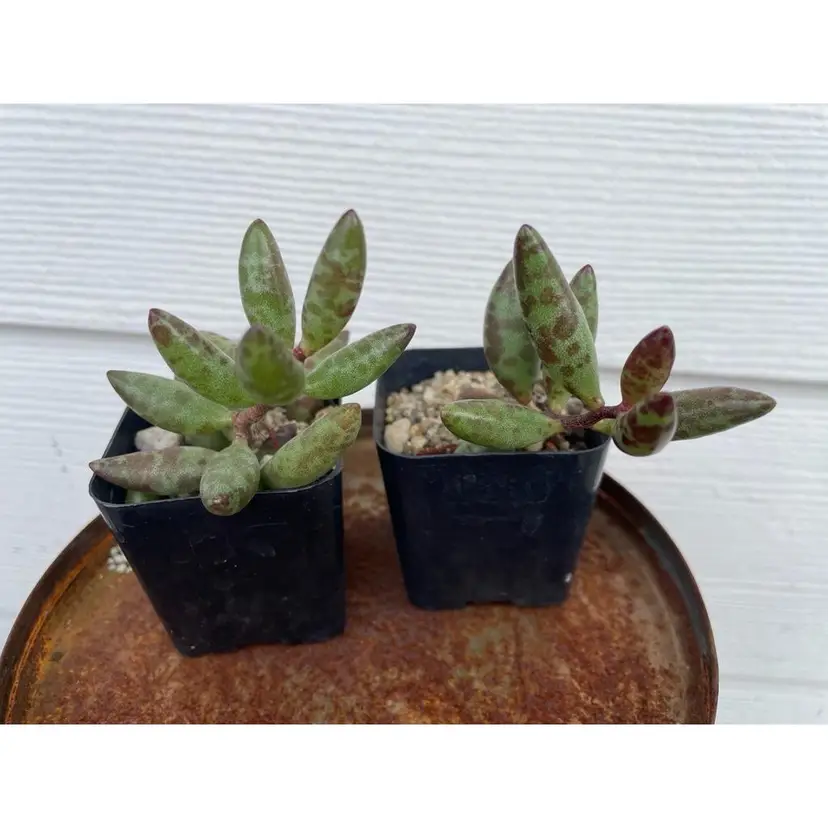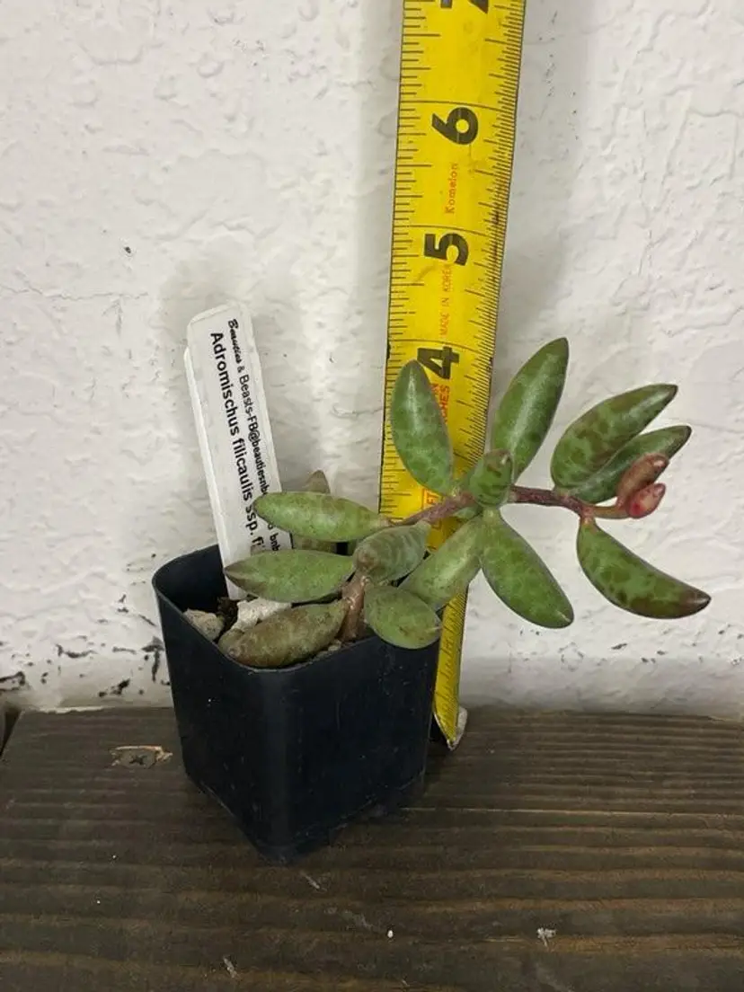 Adromischus filicaulis is a highly variable and very slow growing, usually with shiny grey-green leaves and rust coloured spots and margins.