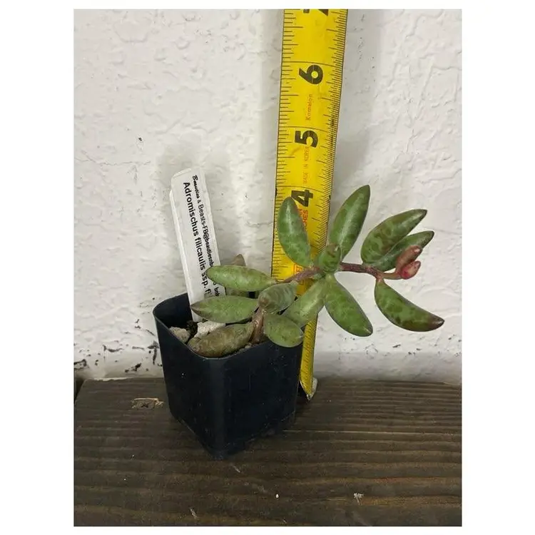 Adromischus filicaulis is a highly variable and very slow growing, usually with shiny grey-green leaves and rust coloured spots and margins.