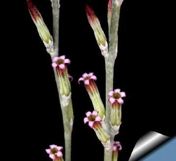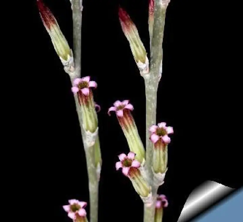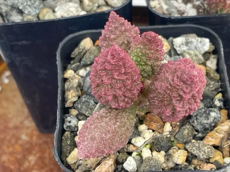Adromischus marianae f. herrei is endemic to South Africa (Little Namaqualand). Grows often filling up cracks on granite hills. It is a small slow-growing succulent shrub constricted at the base, variable in size up to up to 4" tall with many thin and very short branches. It is now believed to be merely a red-brown population of Adromischus marianiae with very rough leaves that looks like dried raisins. This species is variable and every clone is distinct and worth to grow more than one sample. Leaves are green to reddish-brown or purple (depending on clones, growing conditions and seasons), unspotted, becoming grey and waxy as they ages, petiolate, short, almost spherical to elongate lanceolate or oblanceolate, tapered at both ends and roundish in cross section or slightly concave above, very irregularly warty (tubercled) and slightly caniculate (grooved) in the upper part. Margins absent or brownish or white, raised and more or less horny especially near the tip. Flowers are green with pinkish-red tinge about 1/2" long.