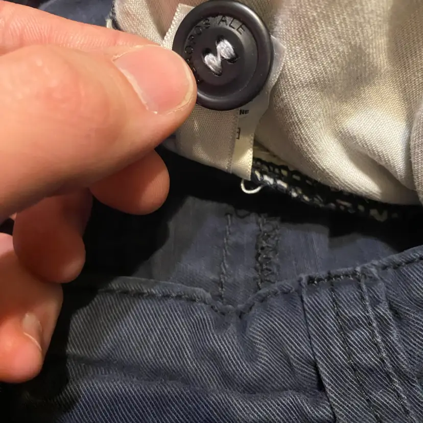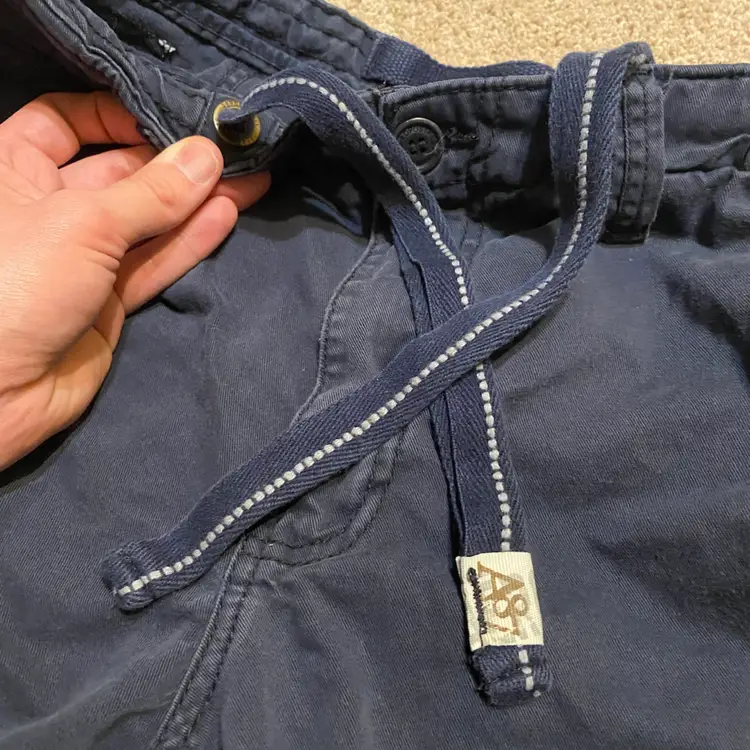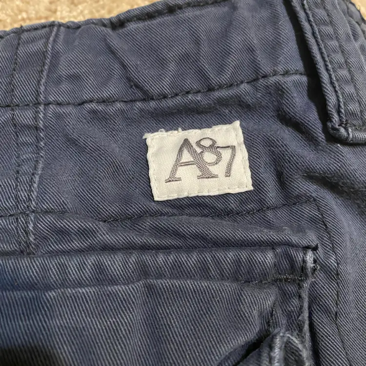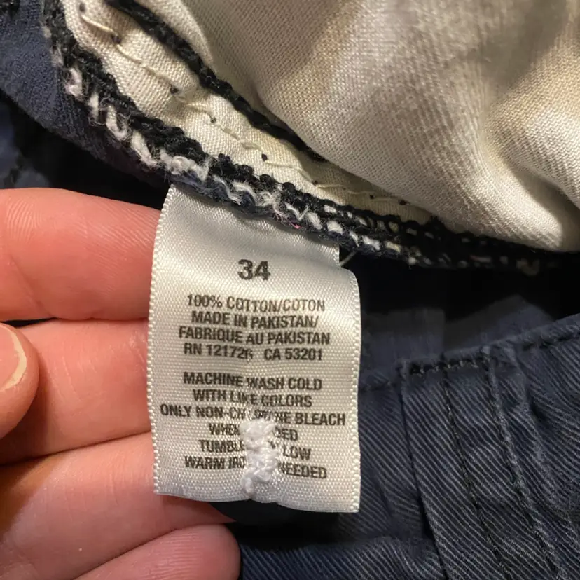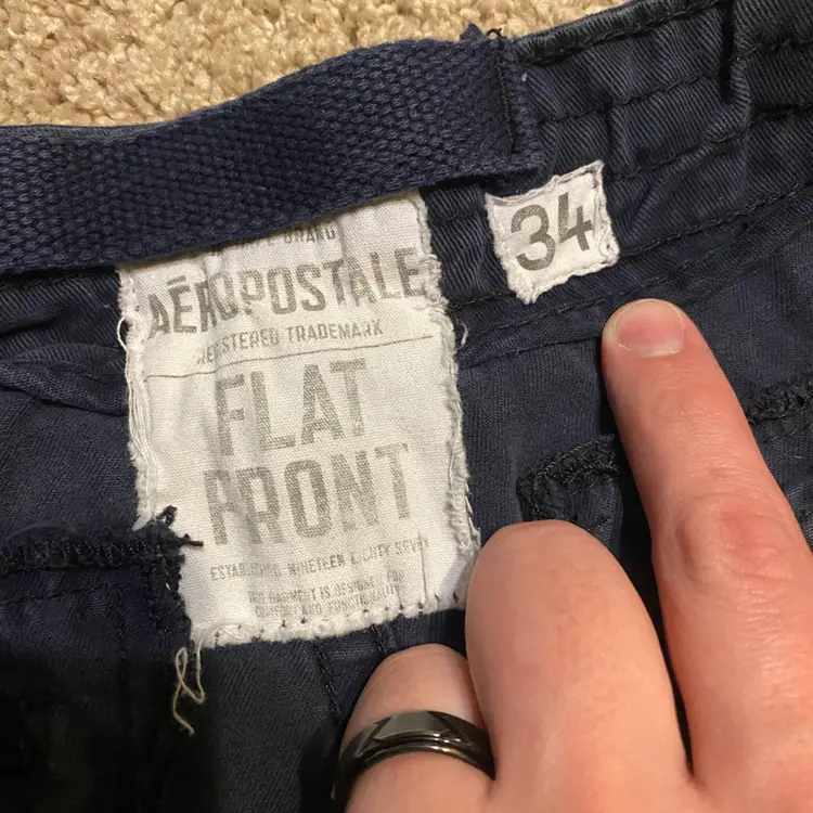 You are purchasing one pair of Men's Size 34 Waist Navy Blue Flat Front Chino Shorts by Aeropostale from 2011. These Shorts have an interior tie-belt built in. These Shorts are in great condition with no rips, stains or holes.