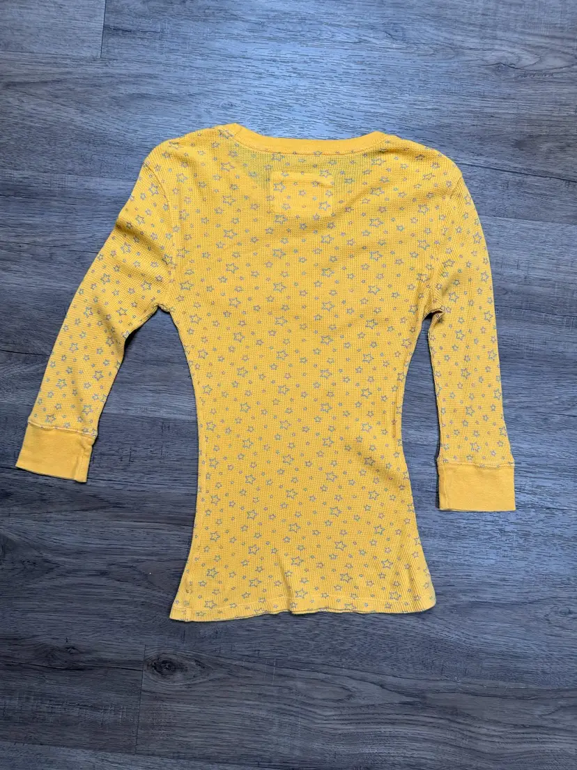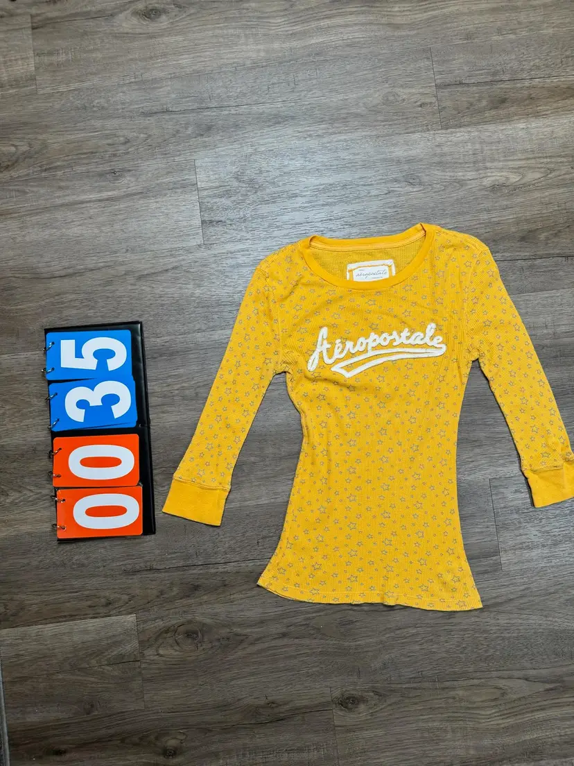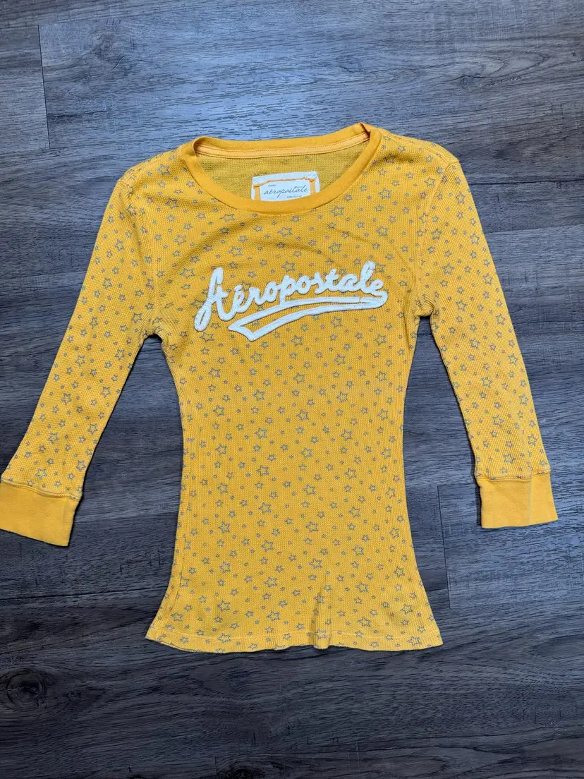 This yellow long-sleeved t-shirt has an original Aeropostale tag. It has an all over graphic of silver gray stars.