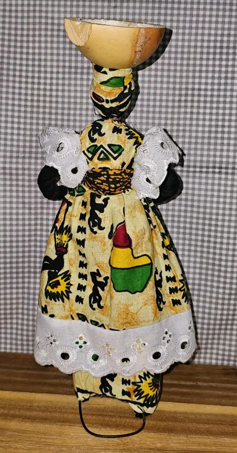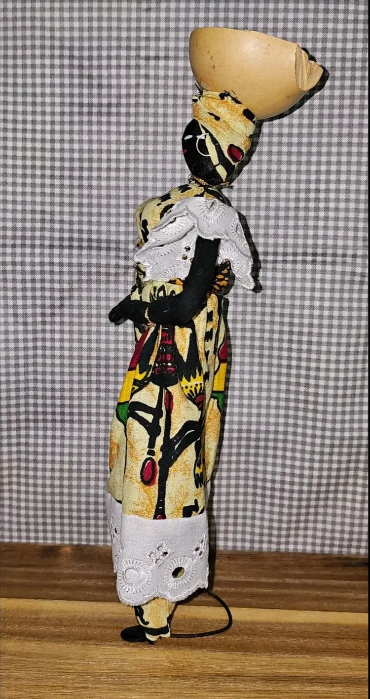 This vibrant African folk art doll features a colorful dress and intricate details. With fruit bowl on top of head. A unique piece for collectors or as a charming decor item.