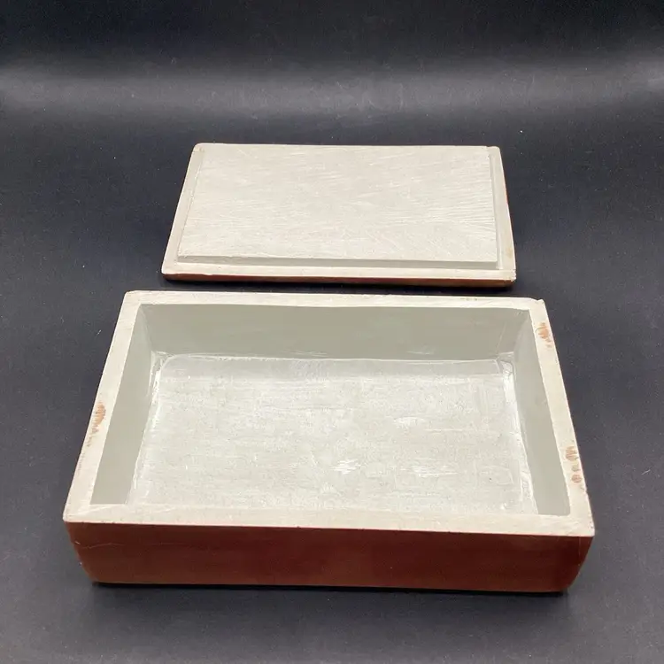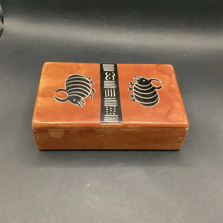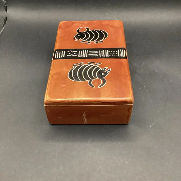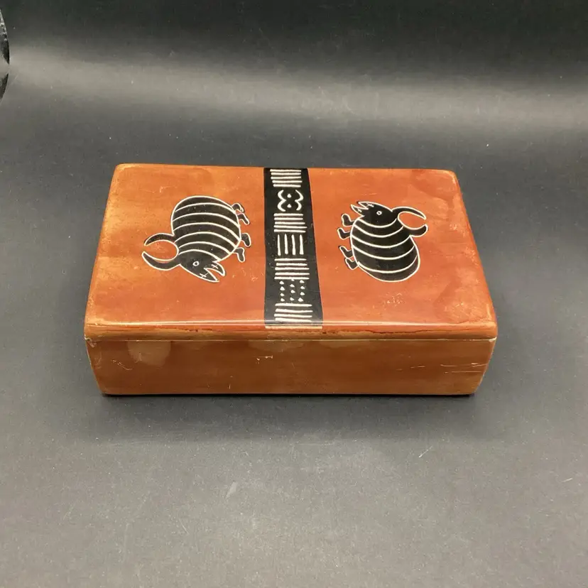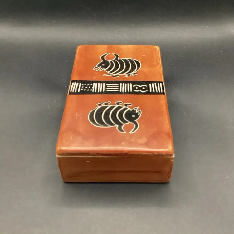This African Small Soapstone Carved Box features a tribal animal design from Kenya, showcasing intricate carvings on a small rectangular box. The beige stone box, measuring 5 inches in length, 3 inches in width, and 1.5 inches in height, is decorated with a matte finish and clean with a damp cloth. With a focus on African themes and animal subjects, this trinket box is a unique and decorative piece that can be displayed on any occasion.