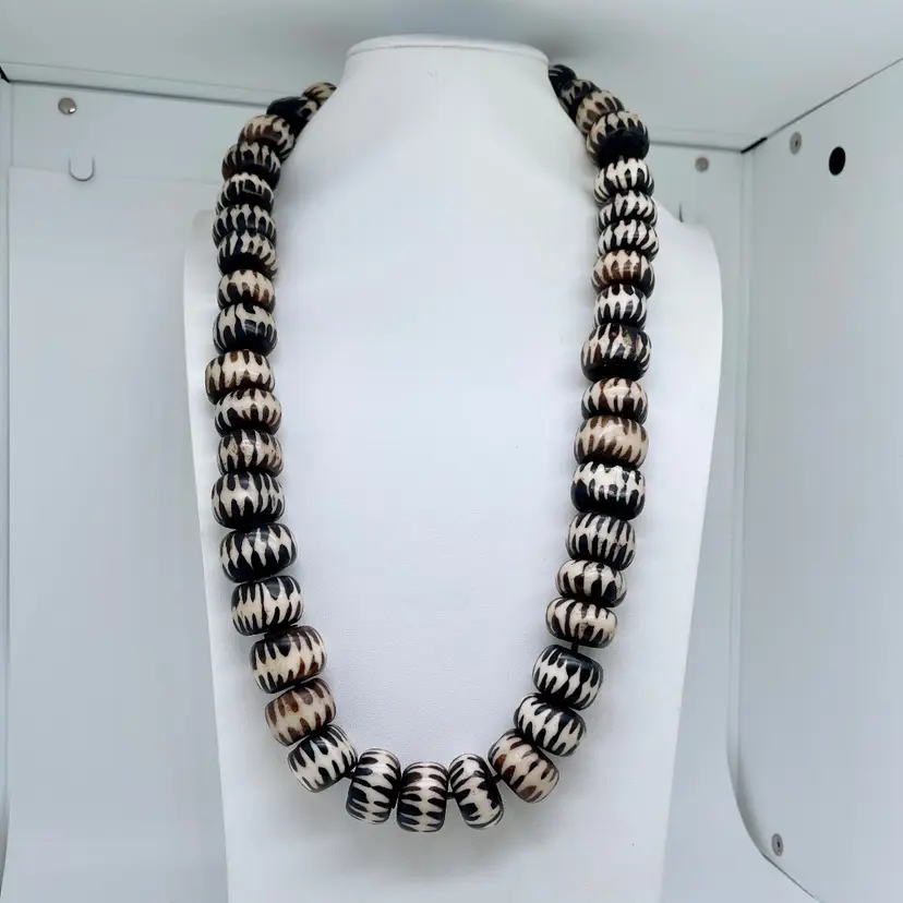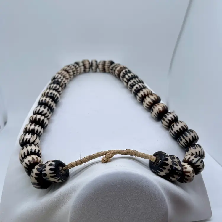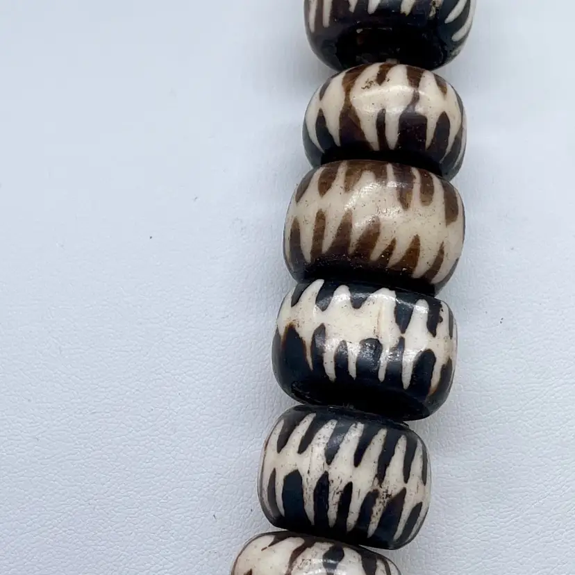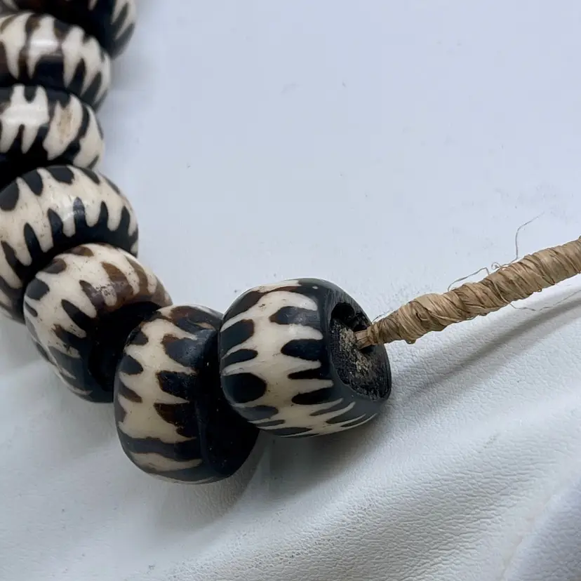 These amazing ceramic beads are vintage tribal trade beads from Africa. They are black and white striped strung on raffia.