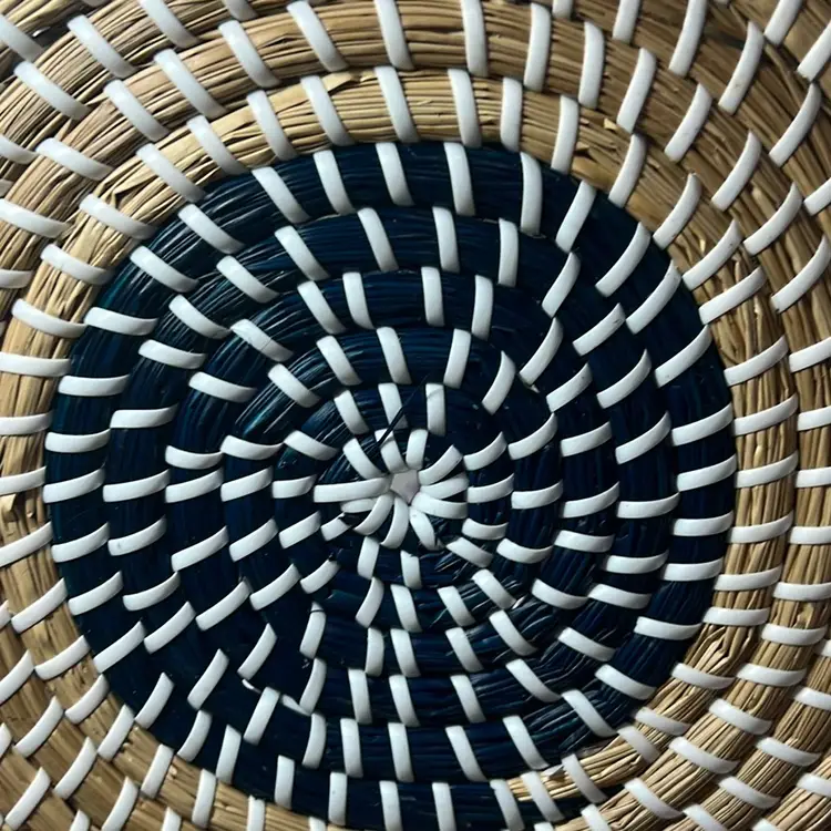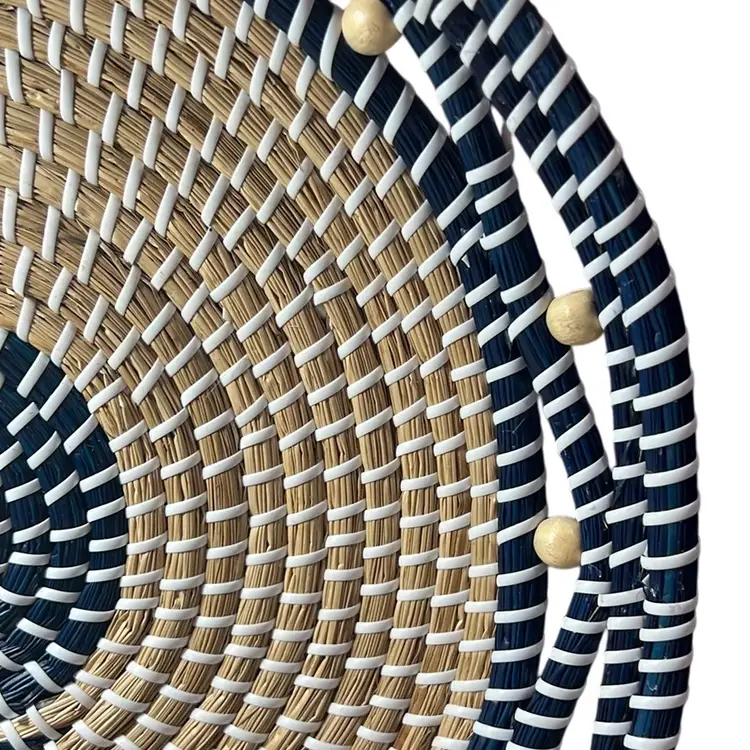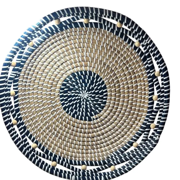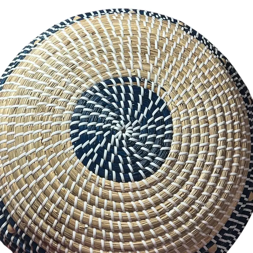 Tan straw, blue straw and white plastic cord. Has tan beads around the rim. Measures 15.5” x 15.5” in perfect shape.