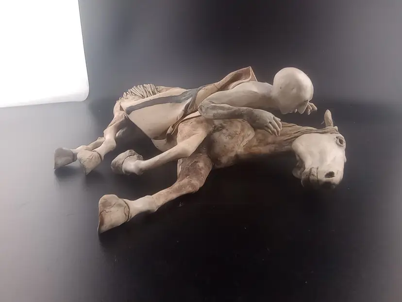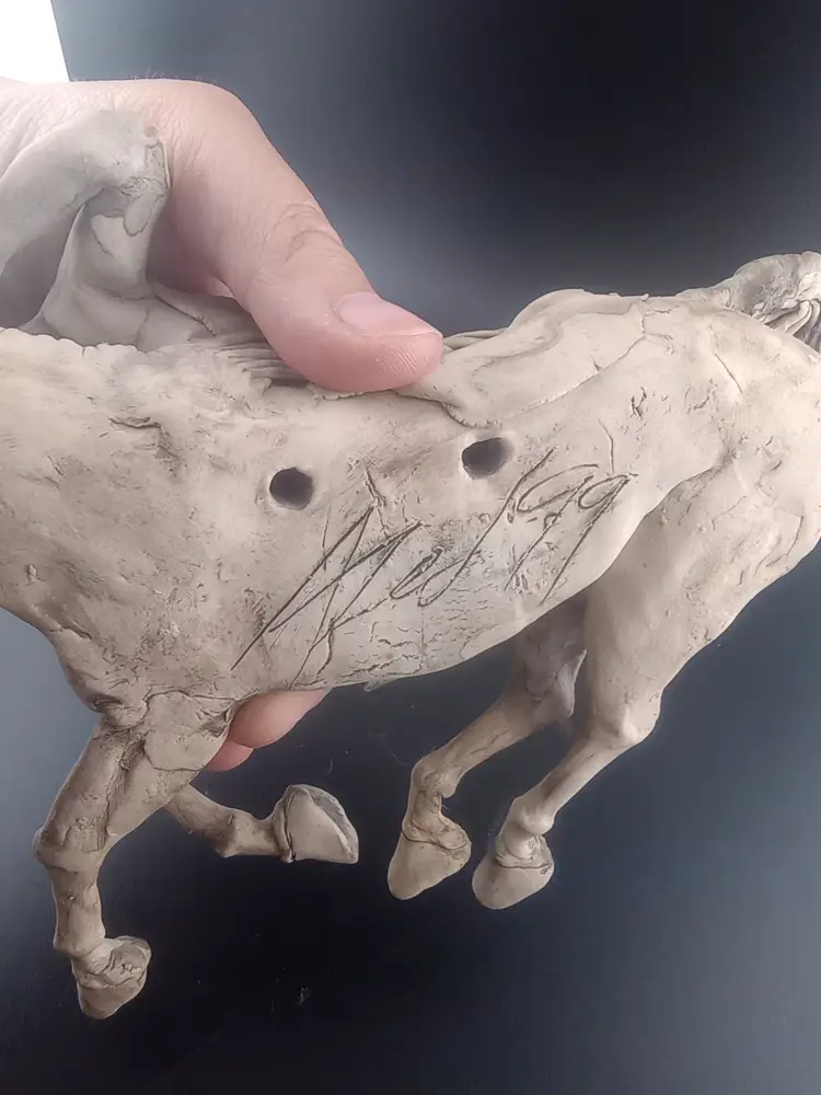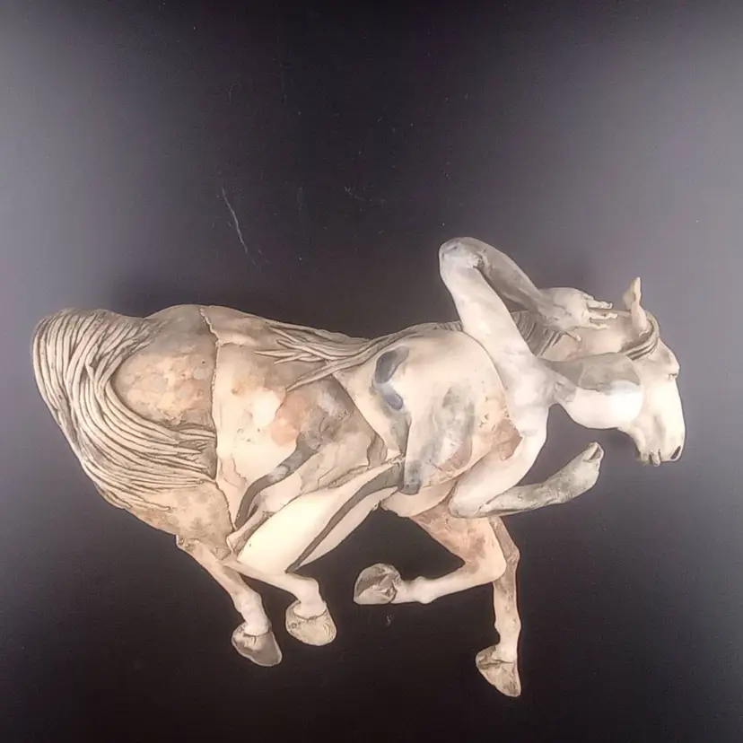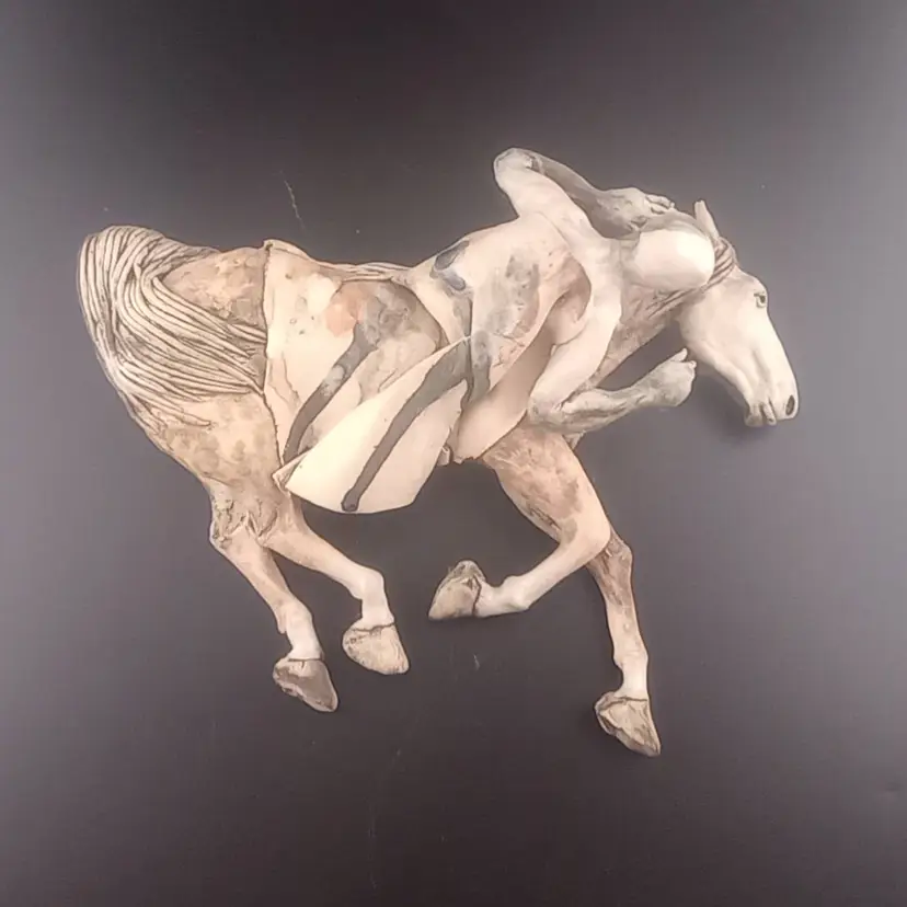 This is a spectacular piece of art by Aggie Zed. The horse and rider are fashioned in exquisite and delicate detail--the photos don't do it justice. The piece is just over 8" long and has holes in the back for hanging on the wall. It's in excellent condition with no noted damage.
