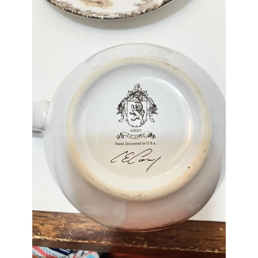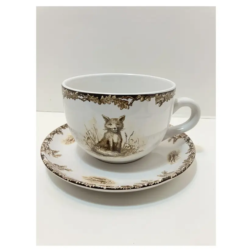 This unique fox hunt pattern cup and saucer plate weighs 2 lbs and the very large cup is 5 in around and 3 in deep. The saucer is 7.5 in around.