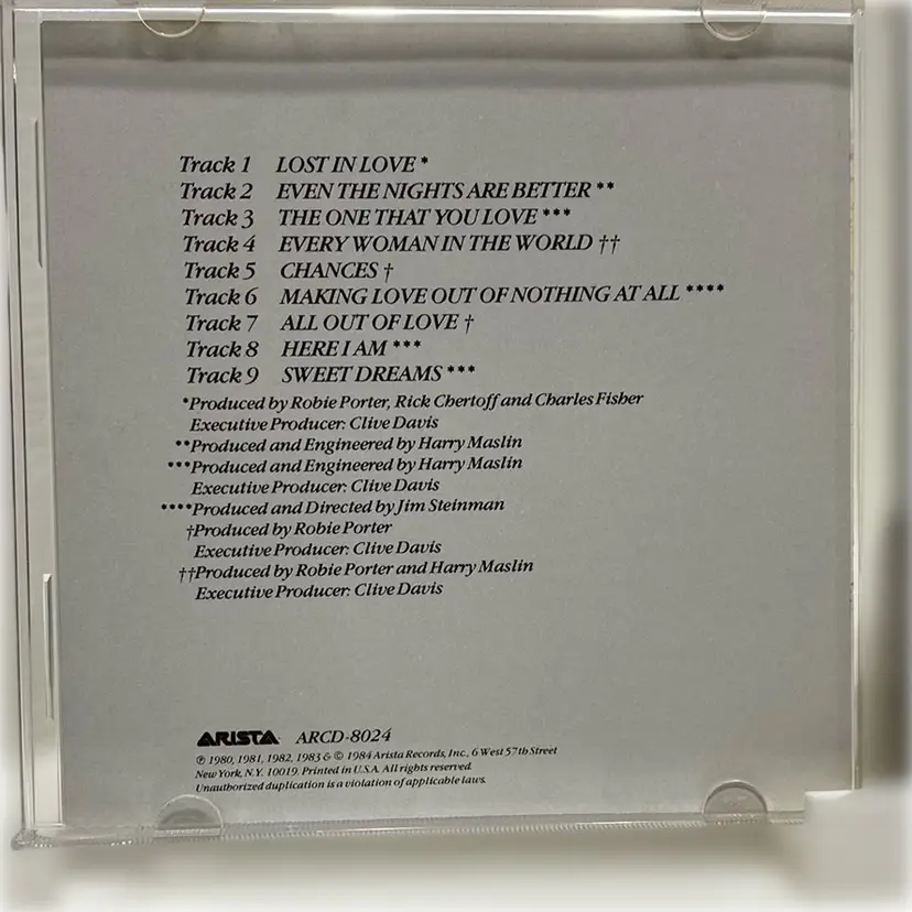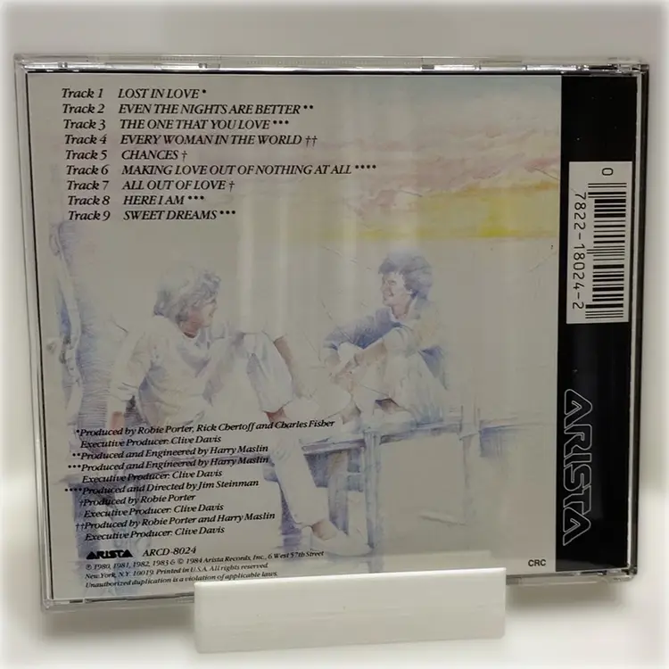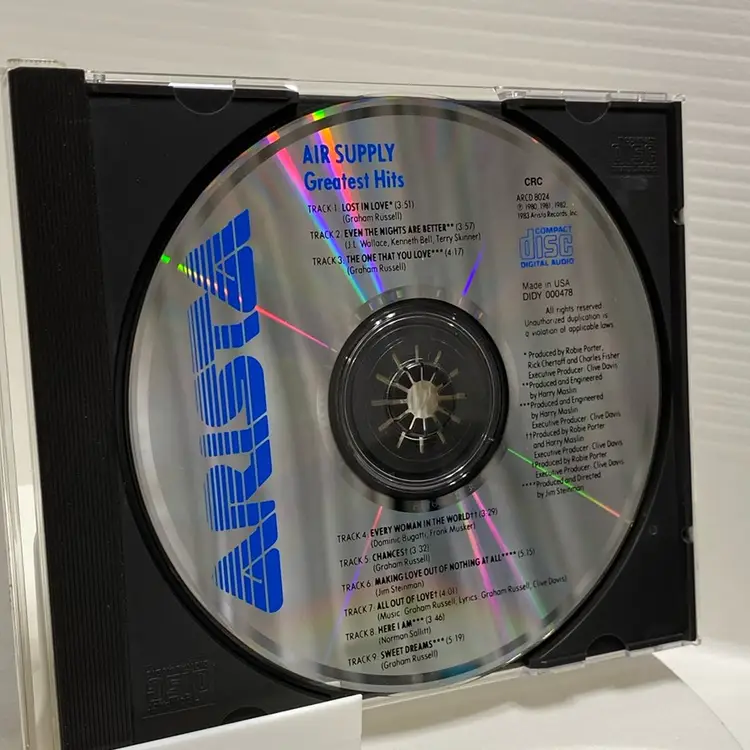 Artist: Air Supply. Album Title: Greatest Hits. Genre: Pop rock, soft rock. Release Date: The album was initially released in August 1983, with the CD edition released in 1988 by Arista Records. Notable Tracks: The album features many of Air Supply's well-known hits, including "Lost in Love," "All Out of Love," "Even the Nights Are Better," "The One That You Love," "Every Woman in the World," "Chances," and "Making Love Out of Nothing at All". Commercial Success: It reached number one on the Australian album chart and number seven on the Billboard 200 in the US. It was certified 5x platinum in the US in 1993, indicating shipments of five million copies