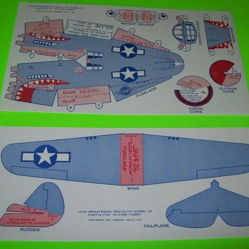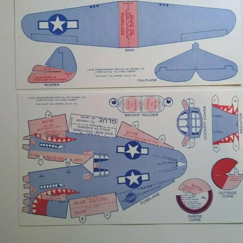 New old stock General Mills cereal premium paper cutout airplane. Comes in two parts as shown. The section with wings is a bit thicker. Copyright date is 1944. One sheet is 6" x 10.25". The other is 4" x 6".