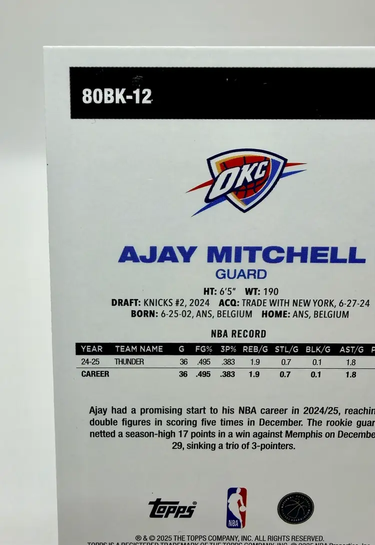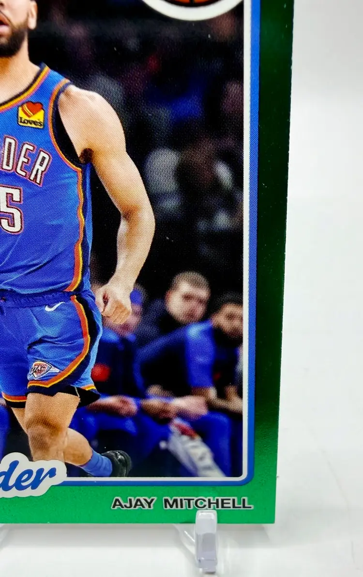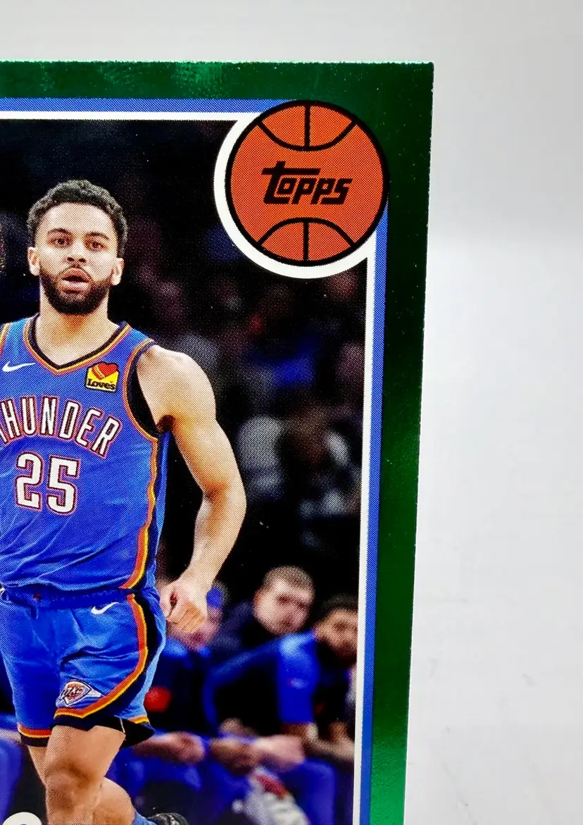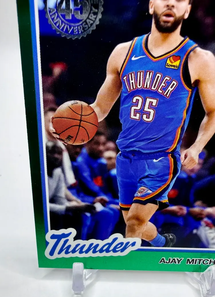 2025-26 Topps Basketball 45th Anniversary trading card featuring Ajay Mitchell of the Oklahoma City Thunder. This limited edition card is part of a print run of only 99 and comes in a Green parallel variety. Made of card stock with a thickness of 20 Pt., this original insert card celebrates the 45th anniversary of the 1980 Topps set.