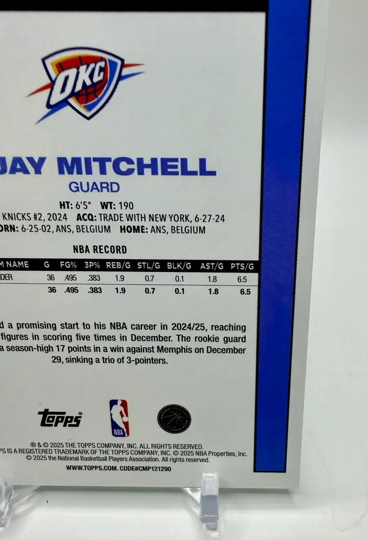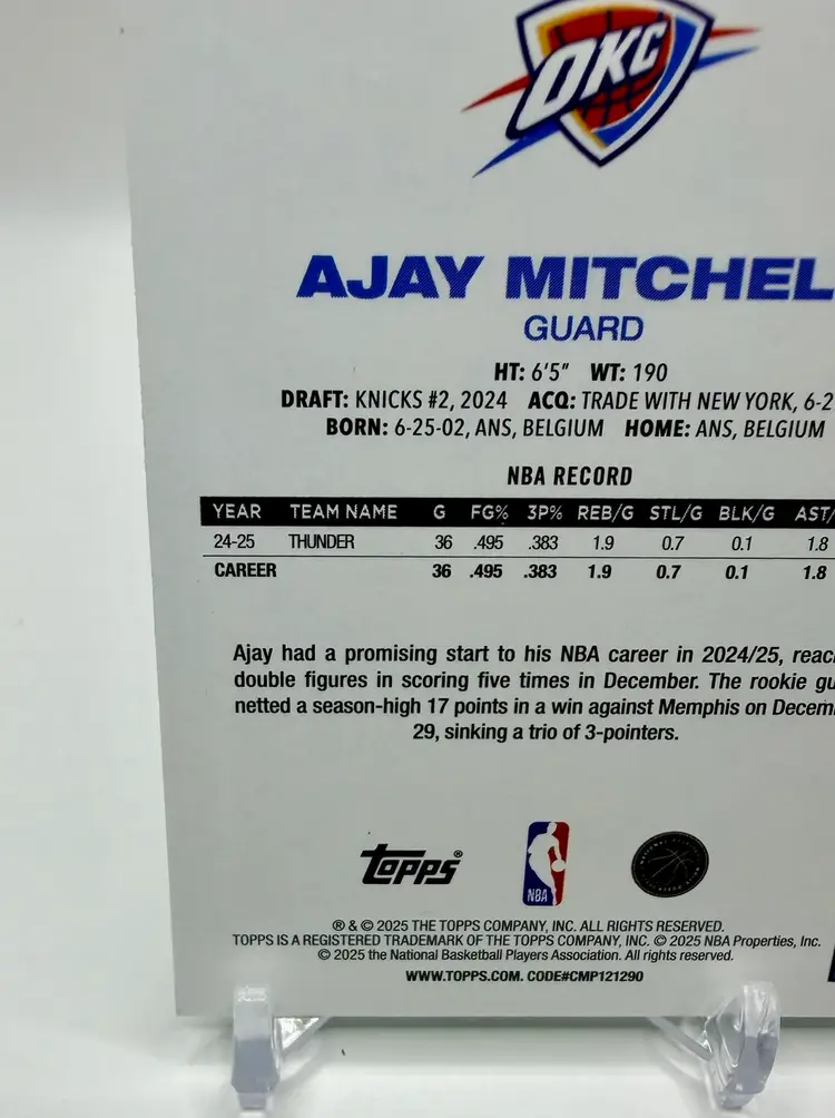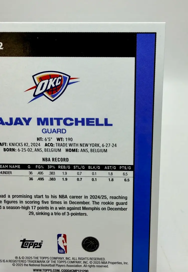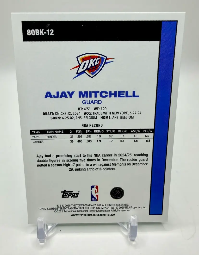 2025-26 Topps Basketball 45th Anniversary trading card featuring Ajay Mitchell of the Oklahoma City Thunder. This limited edition card is part of a print run of only 99 and comes in a Green parallel variety. Made of card stock with a thickness of 20 Pt., this original insert card celebrates the 45th anniversary of the 1980 Topps set.