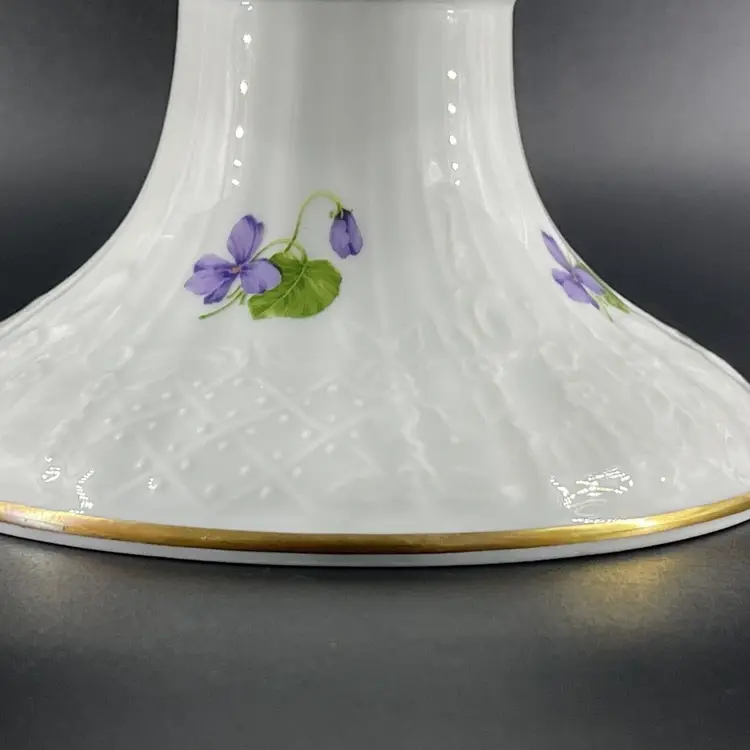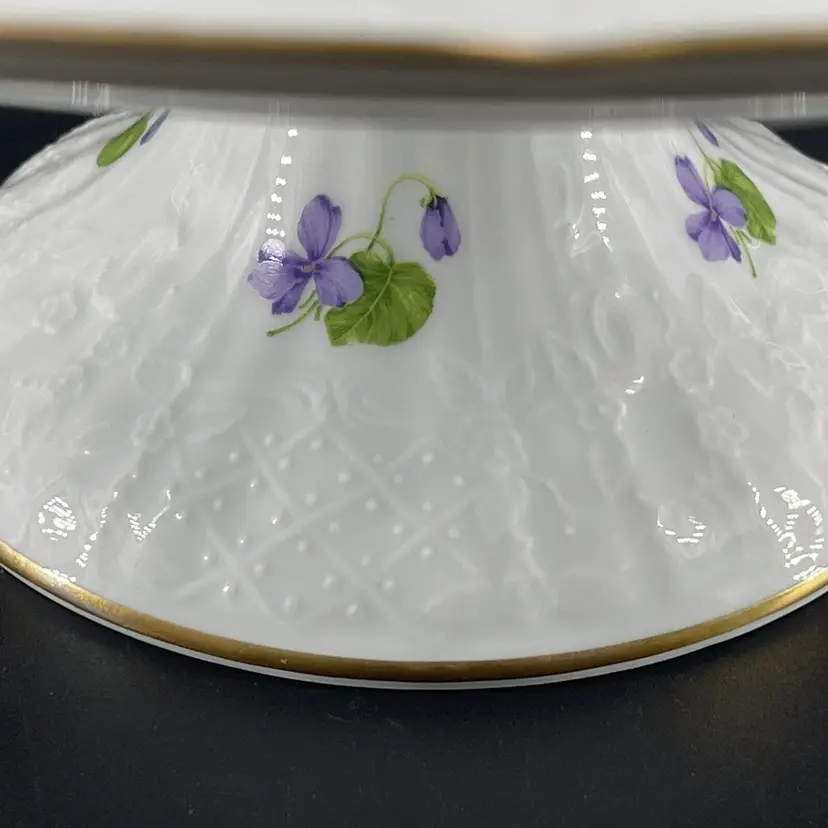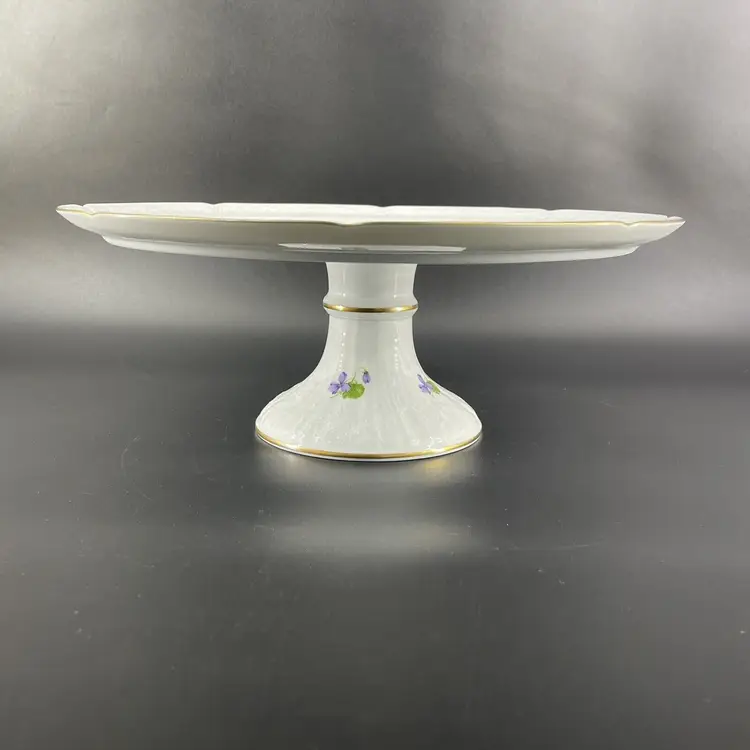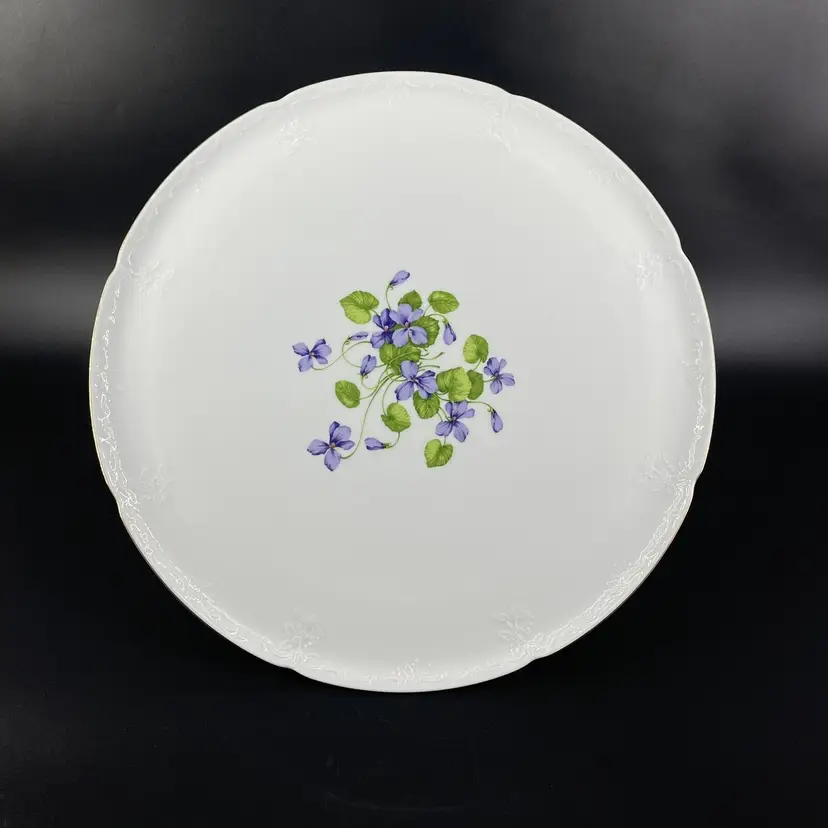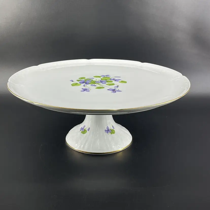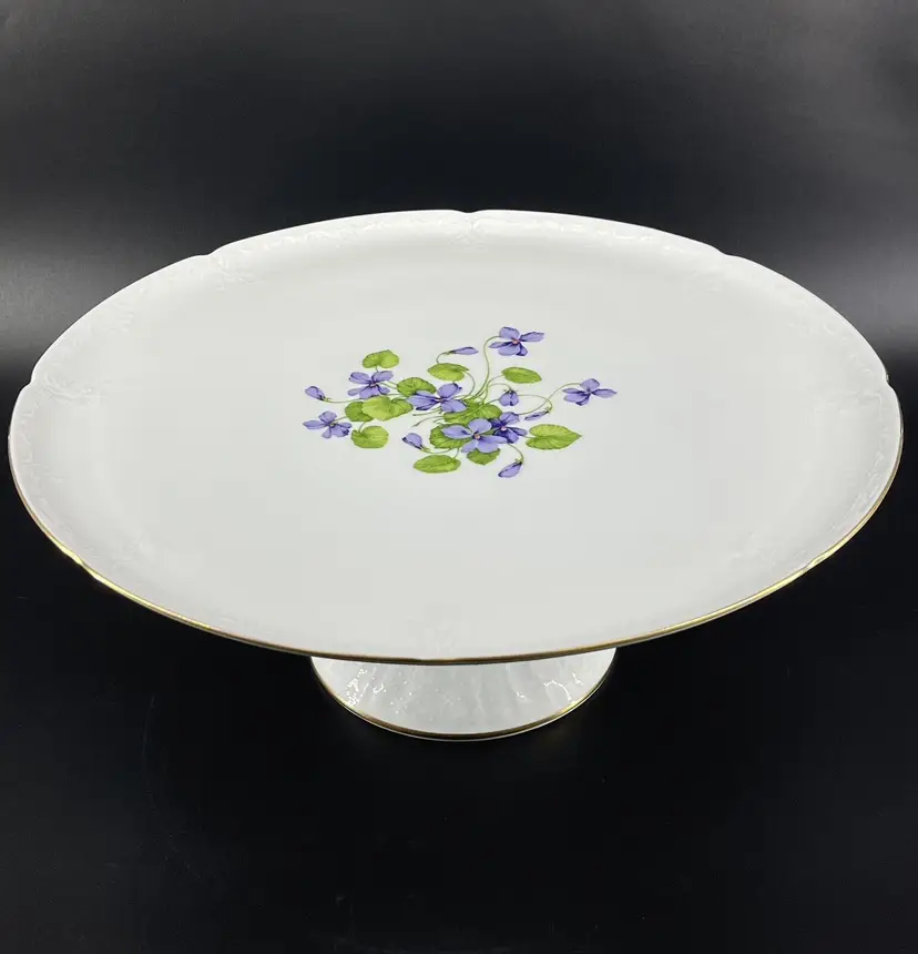 This stunning pedestal cake stand was made in West Germany by AK Kaiser, designed by Futtmann and is part of their Viola collection. I cannot find another listing or sale of the cake stand. Based on research of the back stamp, it was made between 1979-1990. It features an applied violet pattern with coordinating green foliage. The edges of the plate and the base of the pedestal have a textured floral and scroll pattern. It is 5" tall and 13" in diameter. It is in excellent condition. There are no cracks, breaks, chips or repairs. (See photos).