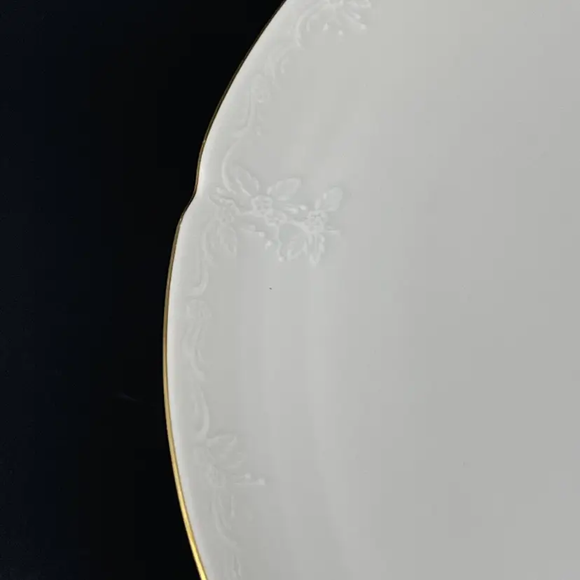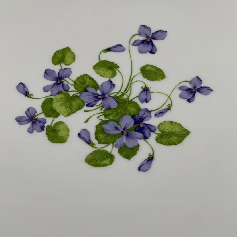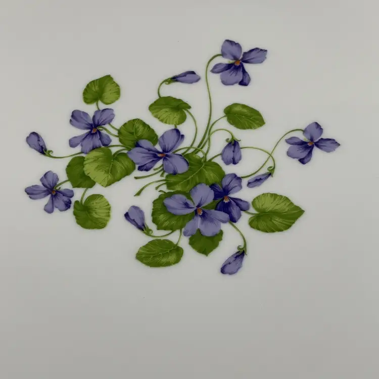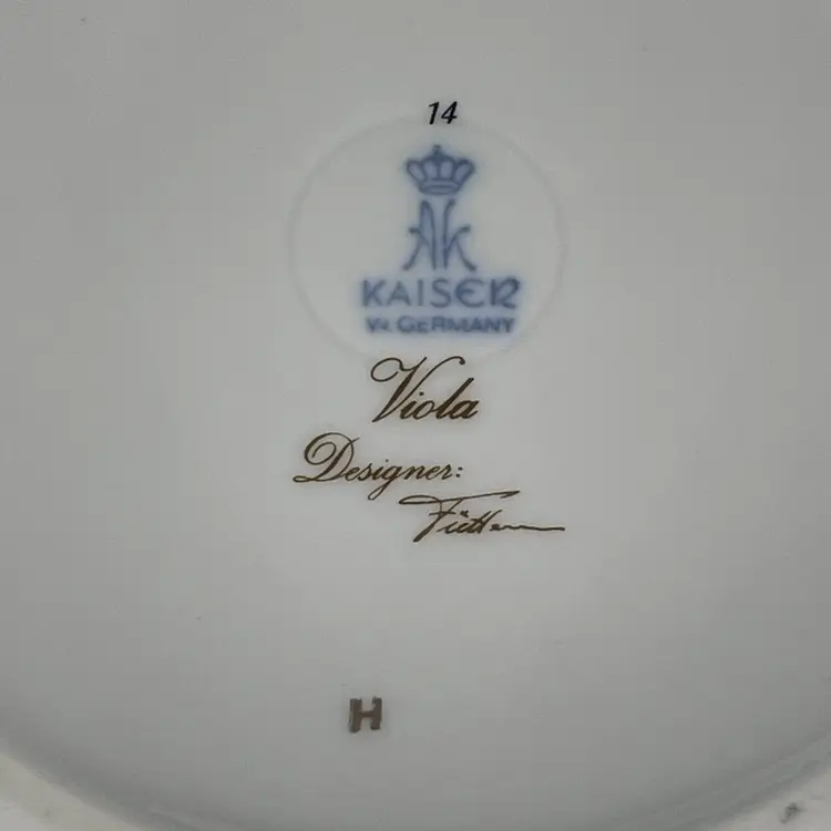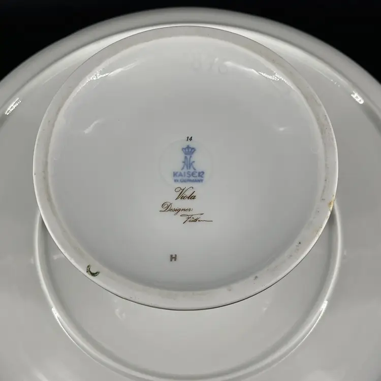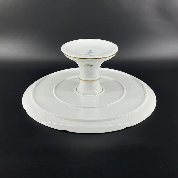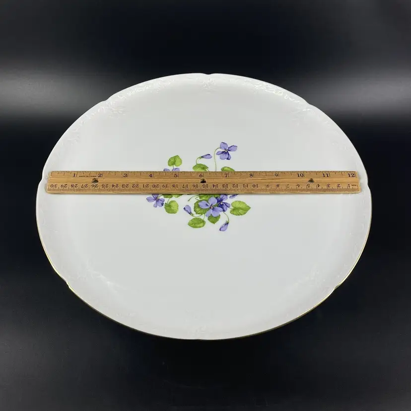 This stunning pedestal cake stand was made in West Germany by AK Kaiser, designed by Futtmann and is part of their Viola collection. I cannot find another listing or sale of the cake stand. Based on research of the back stamp, it was made between 1979-1990. It features an applied violet pattern with coordinating green foliage. The edges of the plate and the base of the pedestal have a textured floral and scroll pattern. It is 5" tall and 13" in diameter. It is in excellent condition. There are no cracks, breaks, chips or repairs. (See photos).