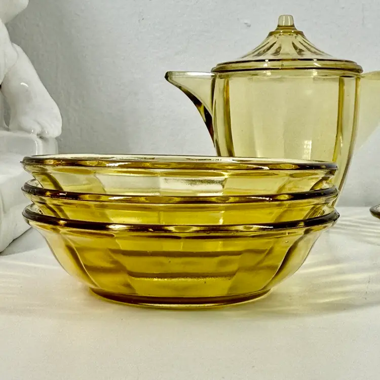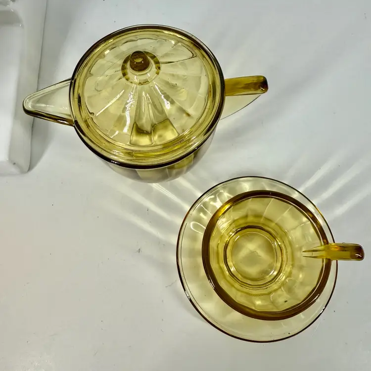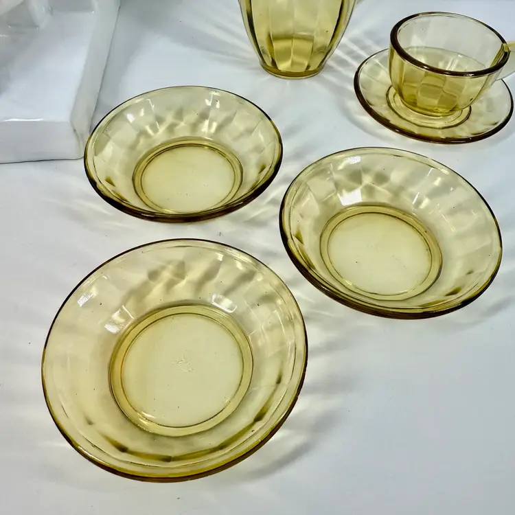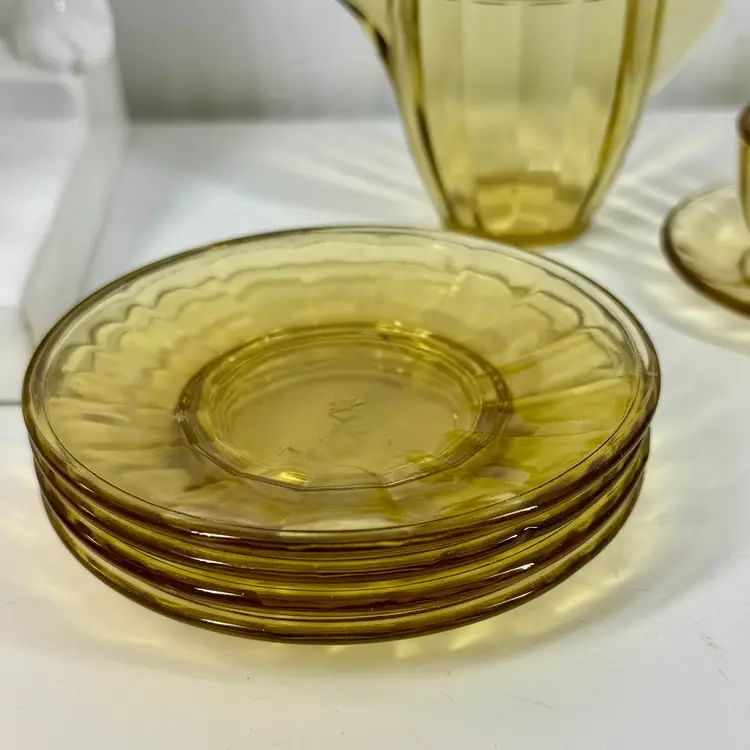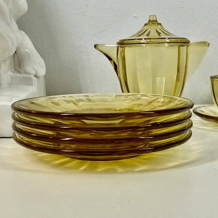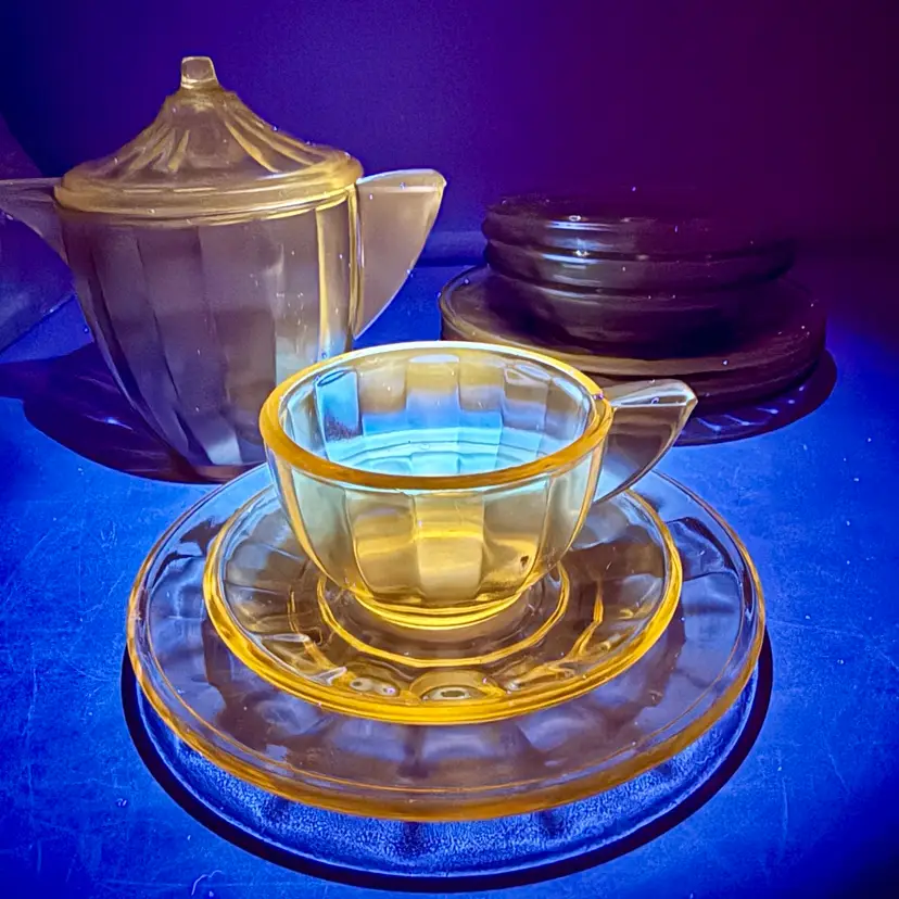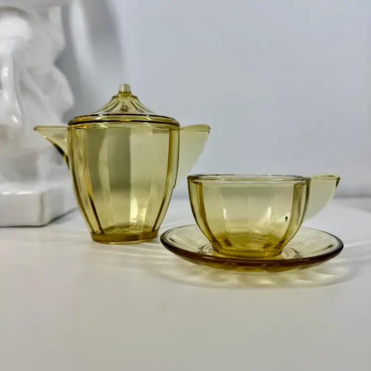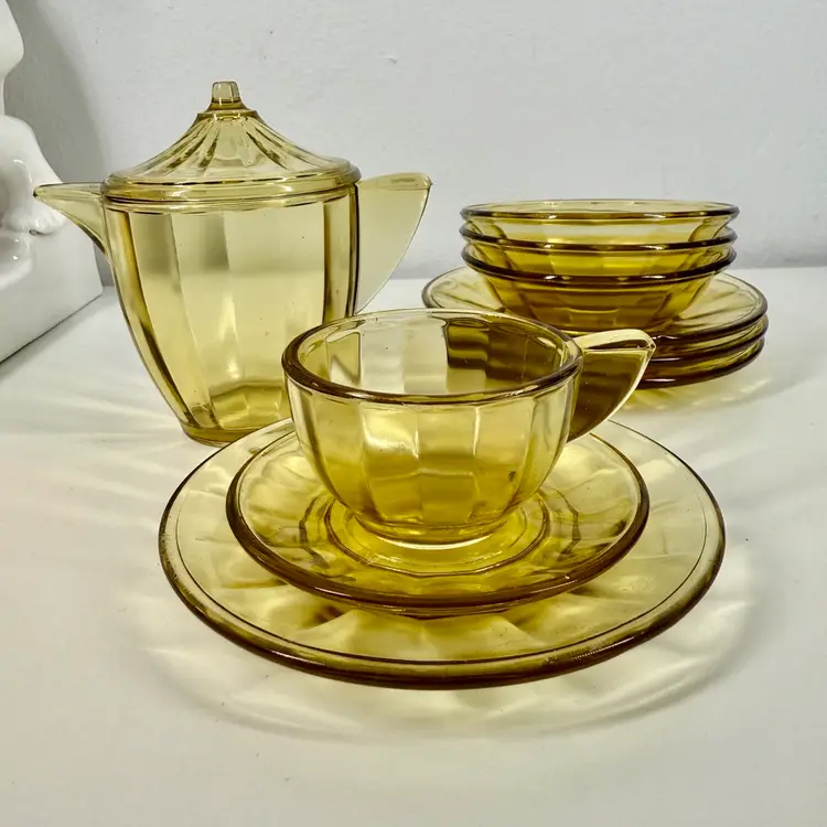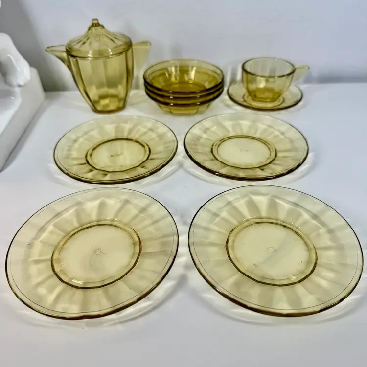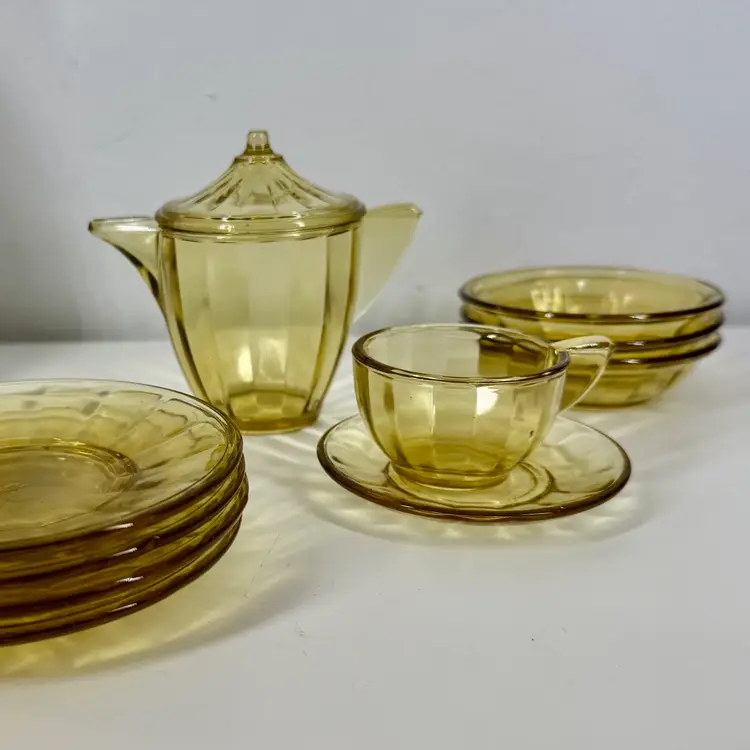 Hi... Crafted during the vibrant Art Deco era, this 11-piece children's tea set by AKRO AGATE captures the essence of a bygone era. The set is a delightful find for collectors, featuring the rare Topaz Amber glass that exhibits a captivating glow under UV light, adding a mysterious twist to its vintage charm. Proudly made in the United States in the 1930s, each piece reflects the craftsmanship and design of the period, with a playful style that nods to the Great Depression era. This set is not only a nostalgic nod to the past but also a unique piece that will spark conversation and admiration in any collection.