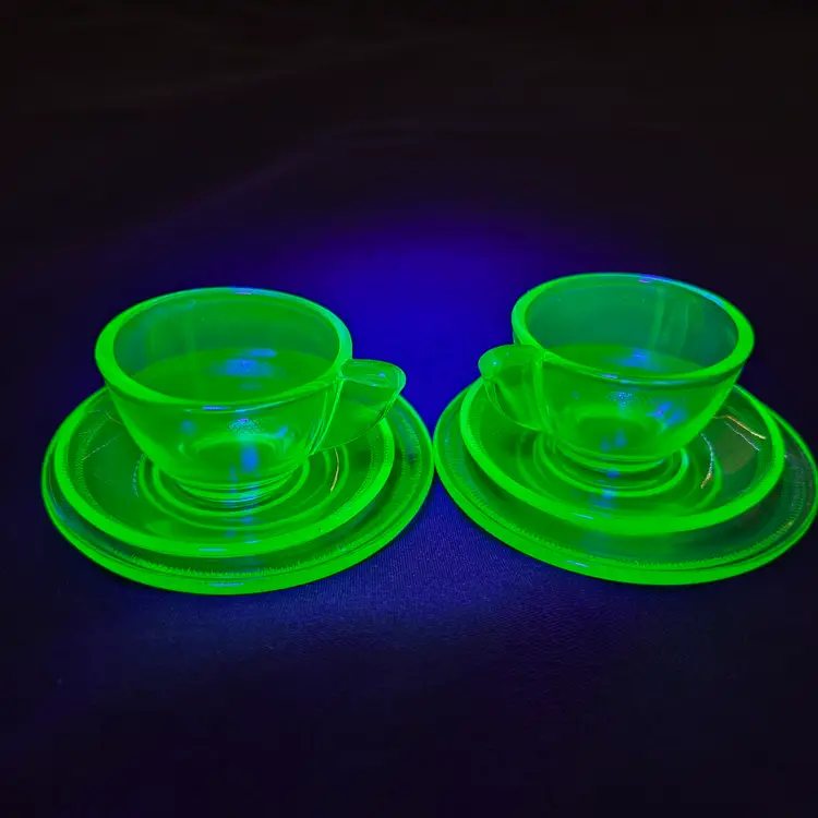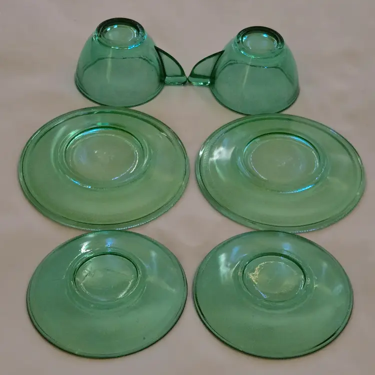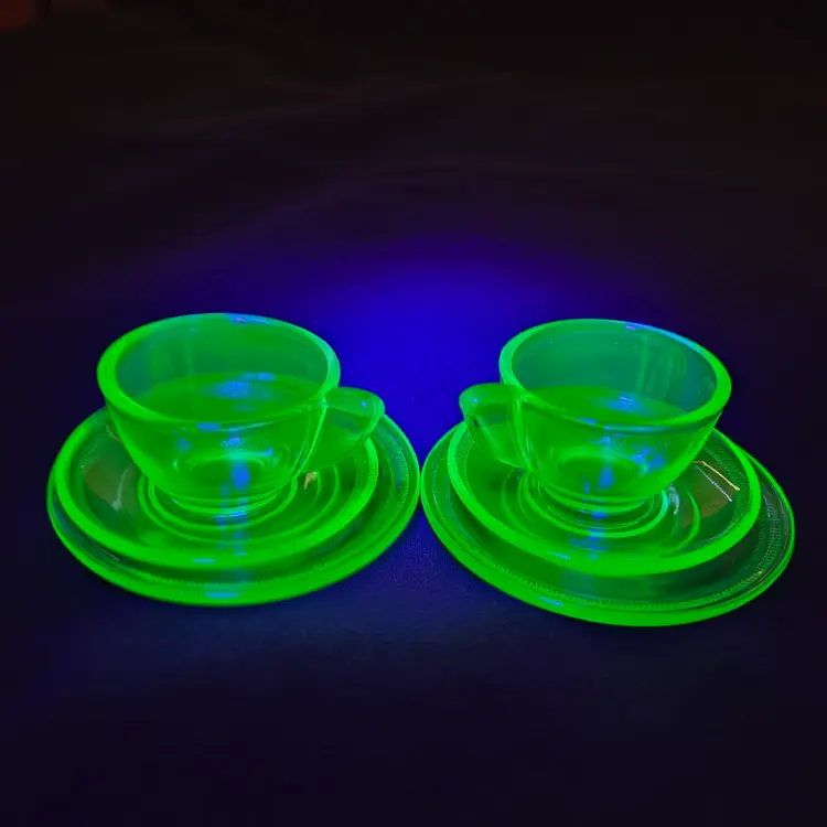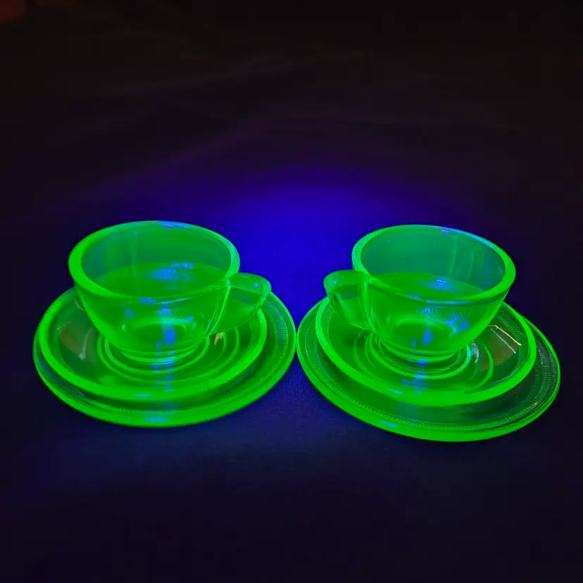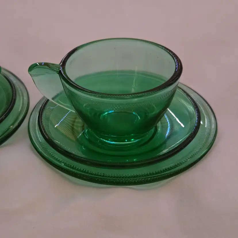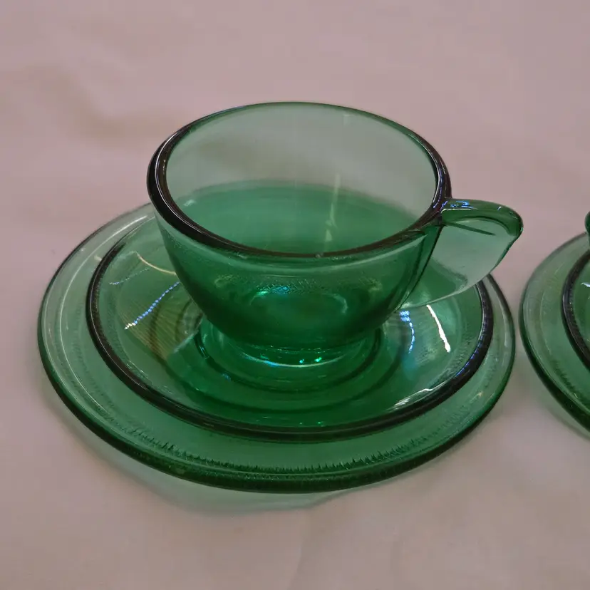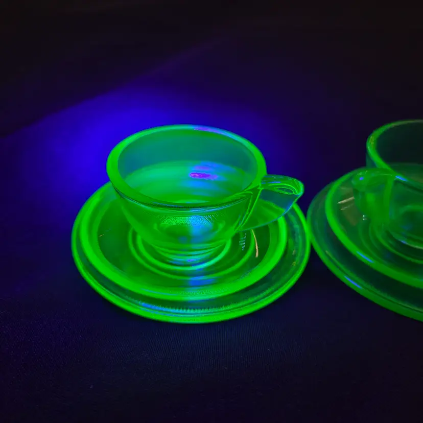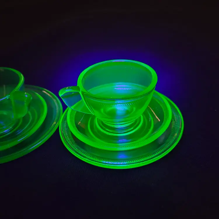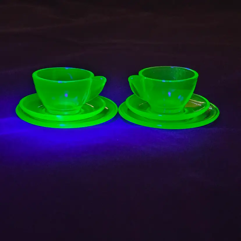 Akro Agate Uranium Green Child’s Stippled Band Pattern Cup Saucer & Plate Glowy. Used condition with manufacturer flaws including bubbles, dirt, straw marks otherwise looks good for its age. Please view all the photos and please ask any questions prior to purchase when possible.