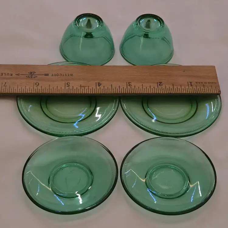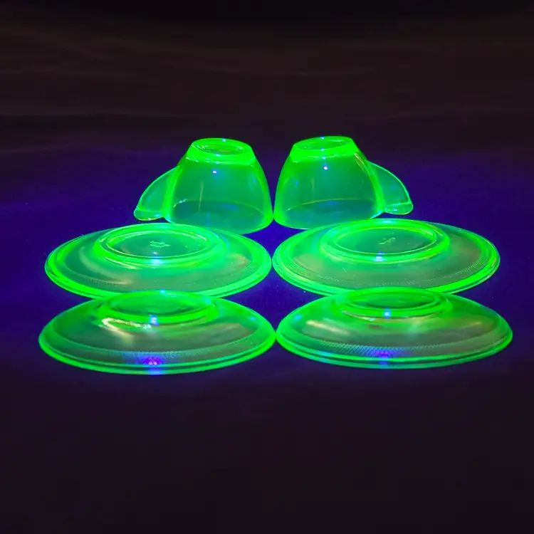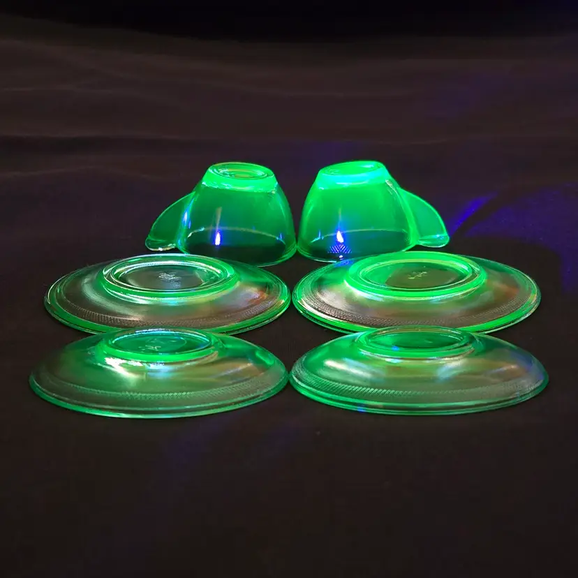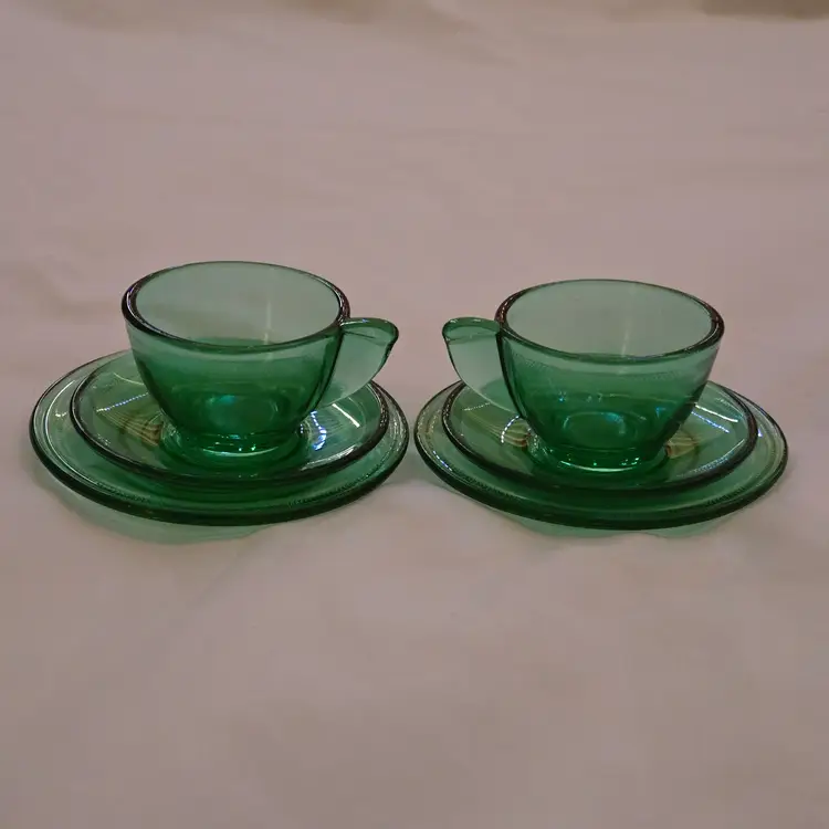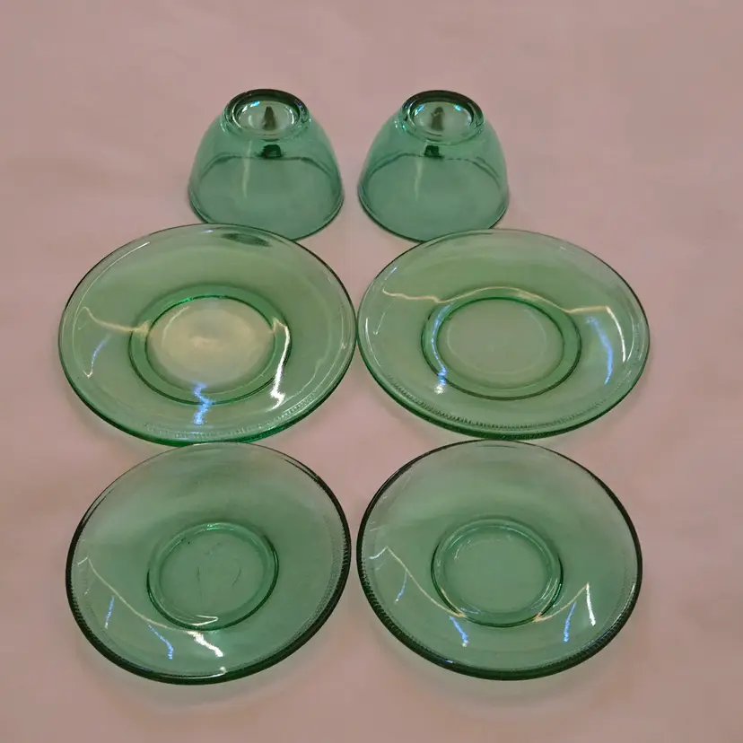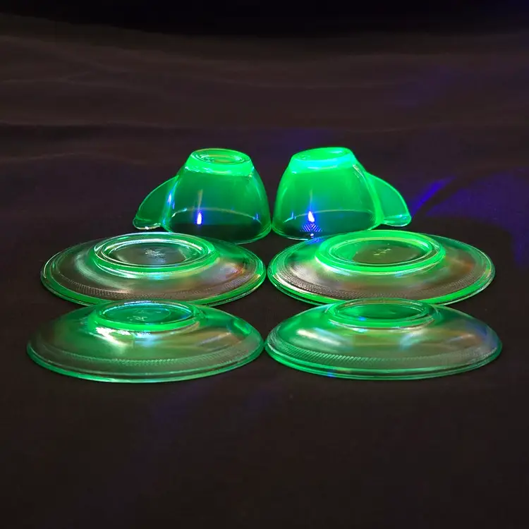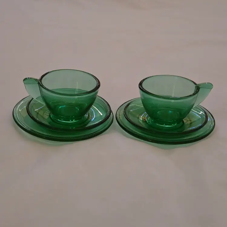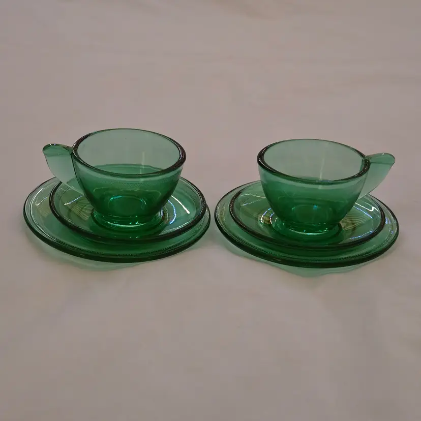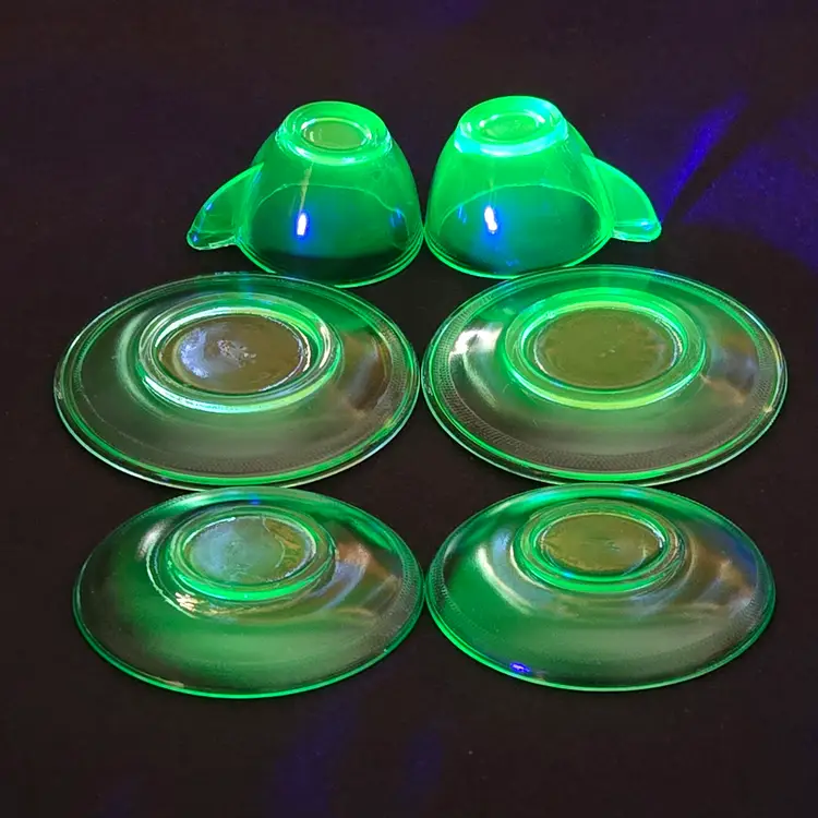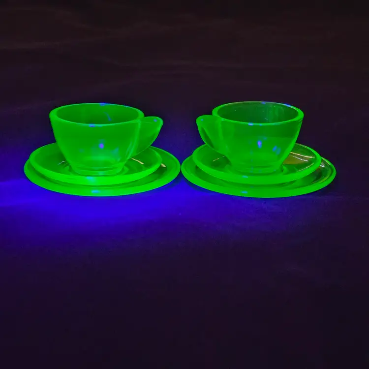 Akro Agate Uranium Green Child’s Stippled Band Pattern Cup Saucer & Plate Glowy. Used condition with manufacturer flaws including bubbles, dirt, straw marks otherwise looks good for its age. Please view all the photos and please ask any questions prior to purchase when possible.