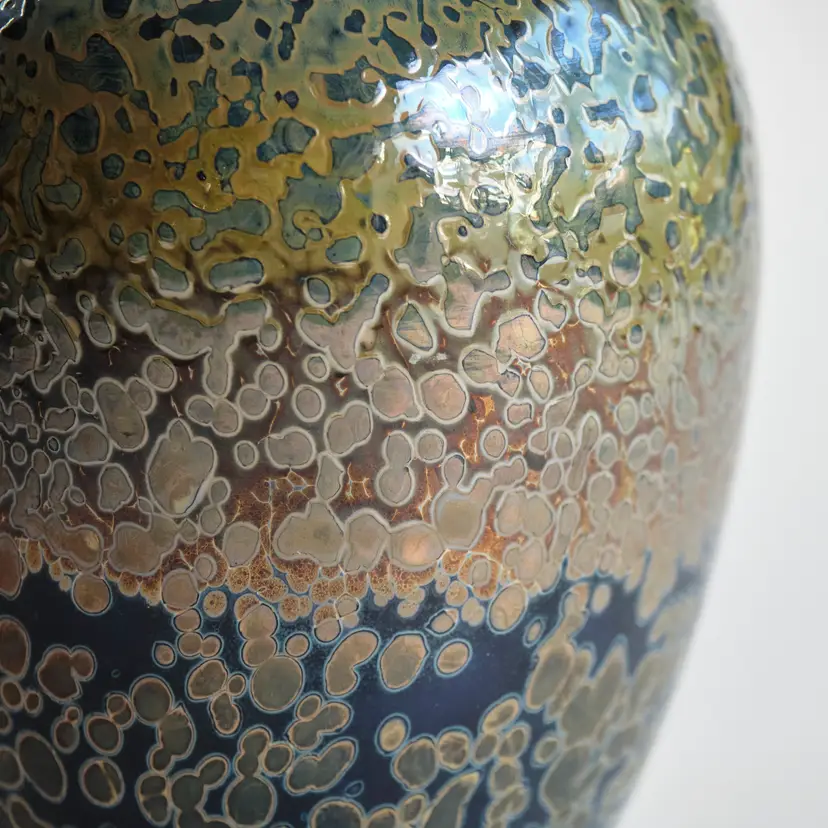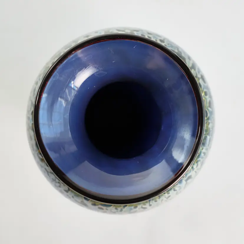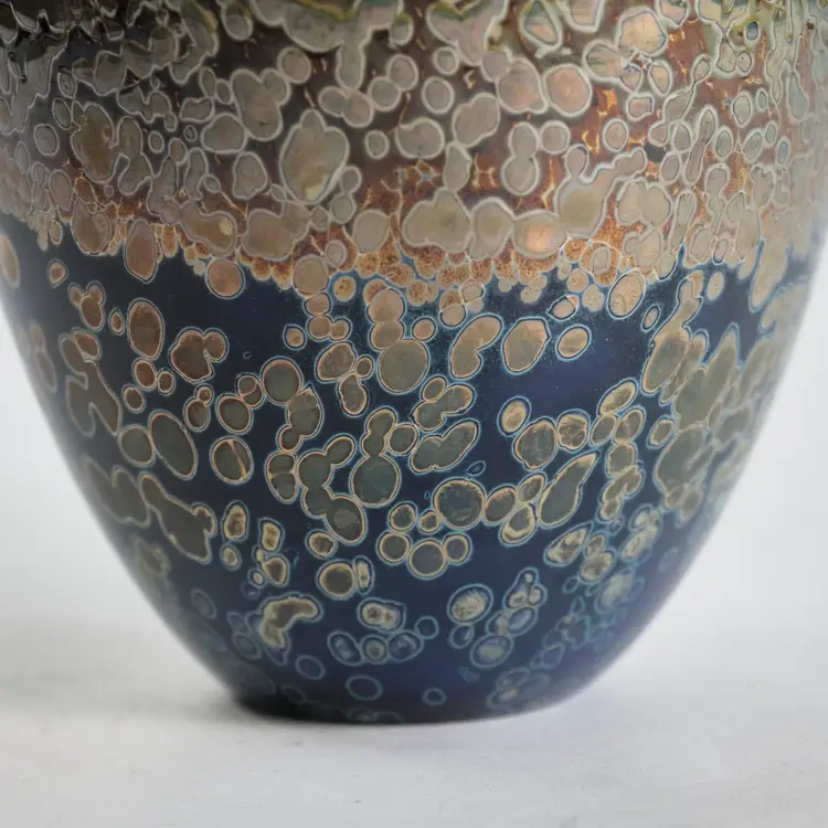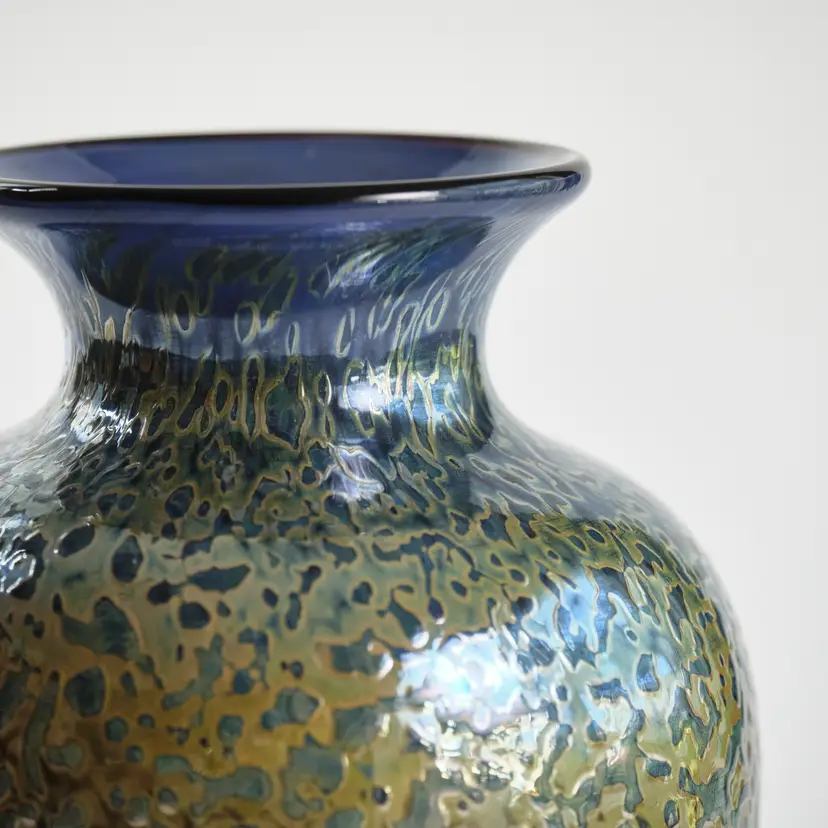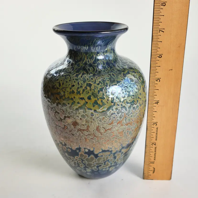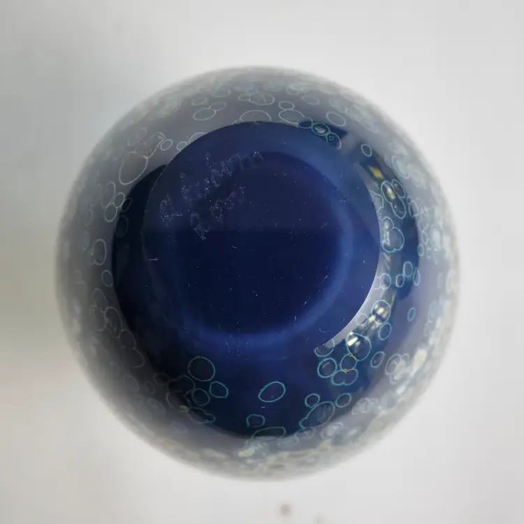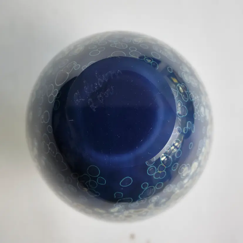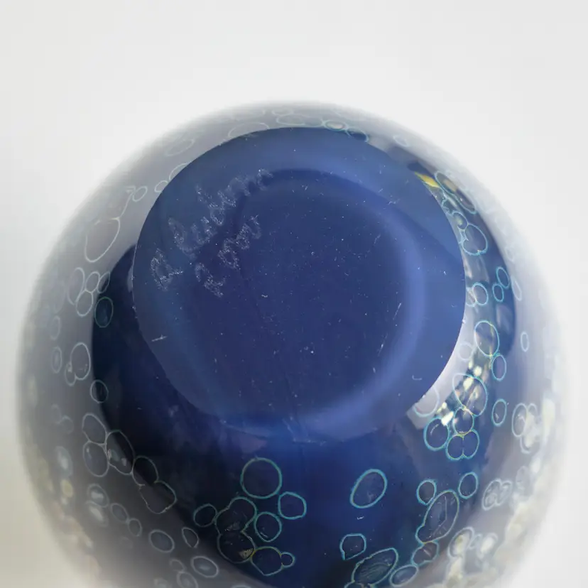 Striking art glass by Al Leedom featuring a deep blue glass vase encased with an abstract pattern like a constellation of stars or ocean life. A beautiful and tactile handblown piece. Polished base - signed and dated 2000.