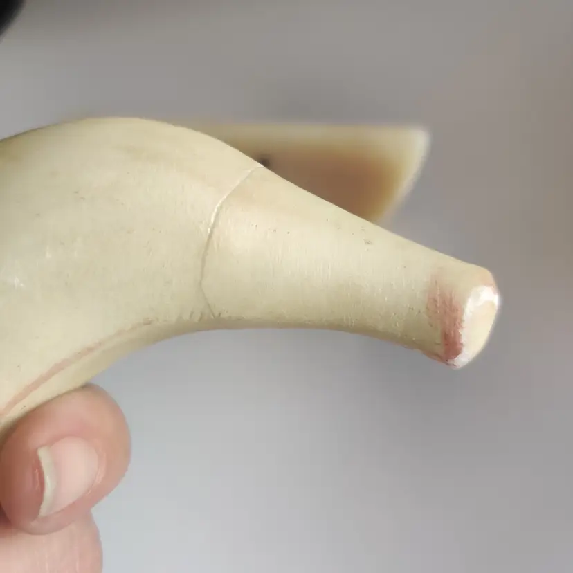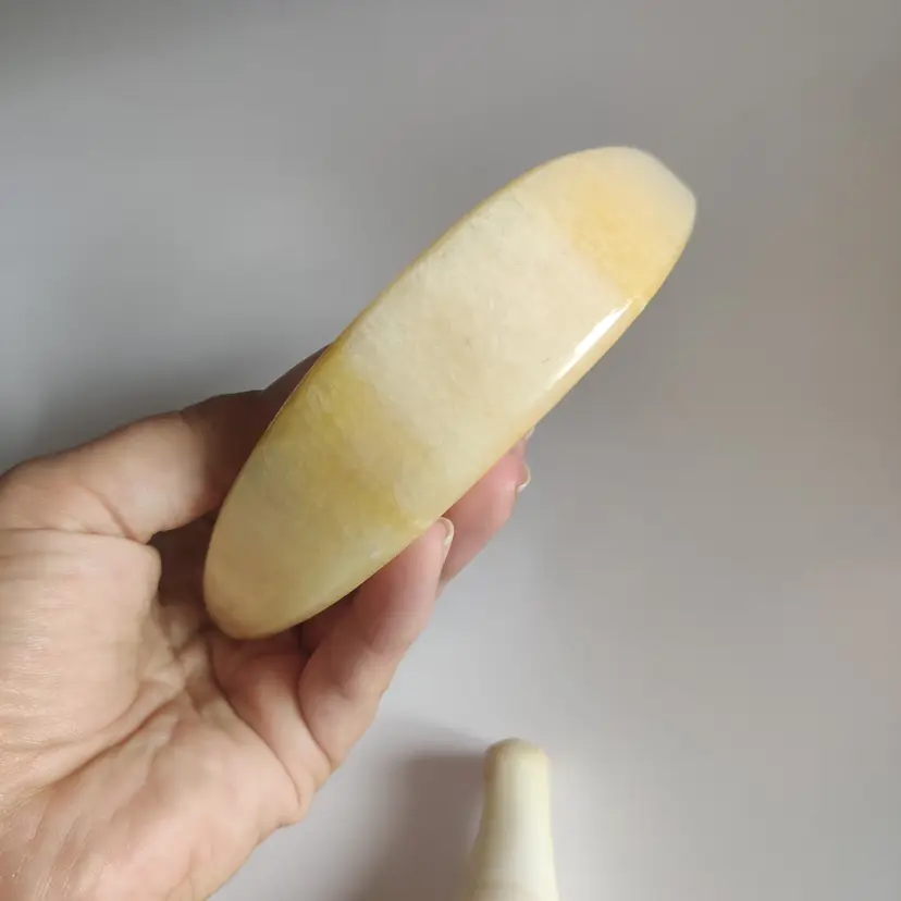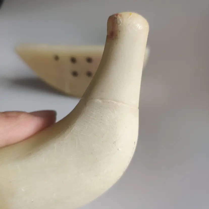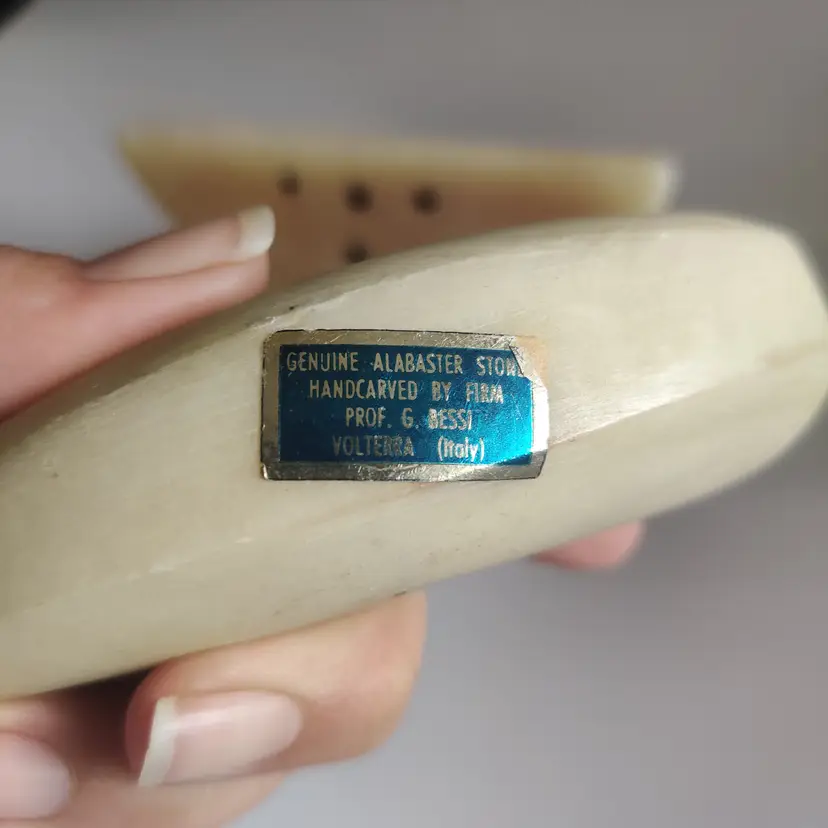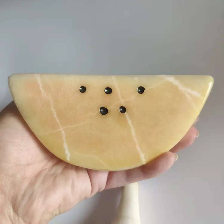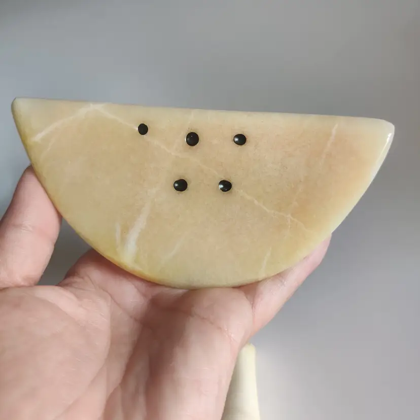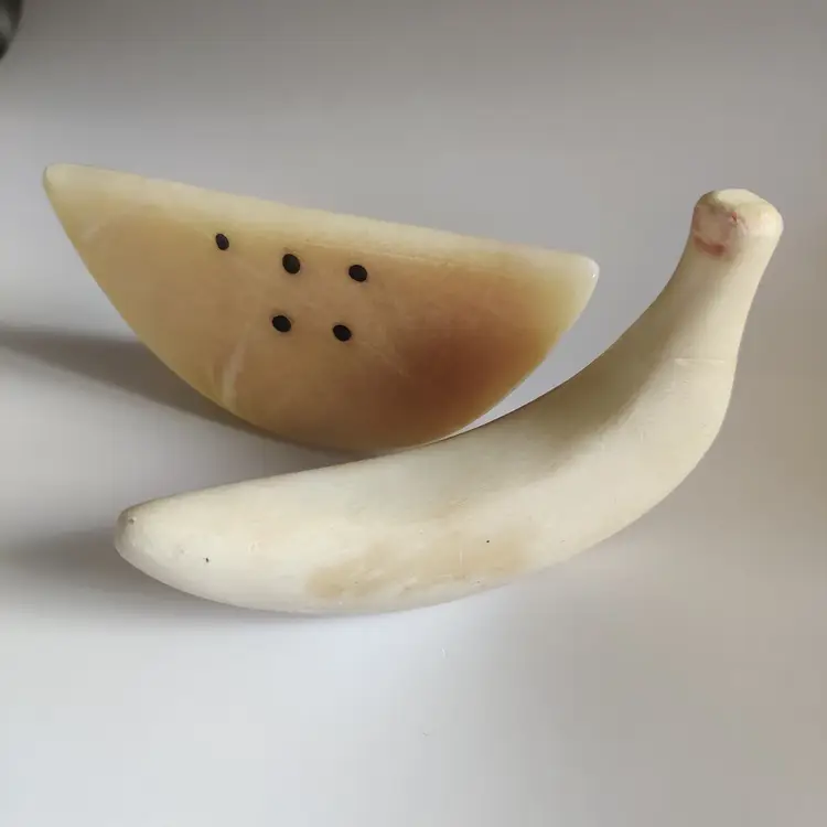 Watermelon slice is 5 in wide, 2.5 in tall and 11.7 oz. Banana is repaired - see pics, and is 5.25 in long. Has original sticker “Genuine Alabaster Stone Handcrafted by Firm Prof. G. Bessi Volterra (Italy)” 7.3 oz