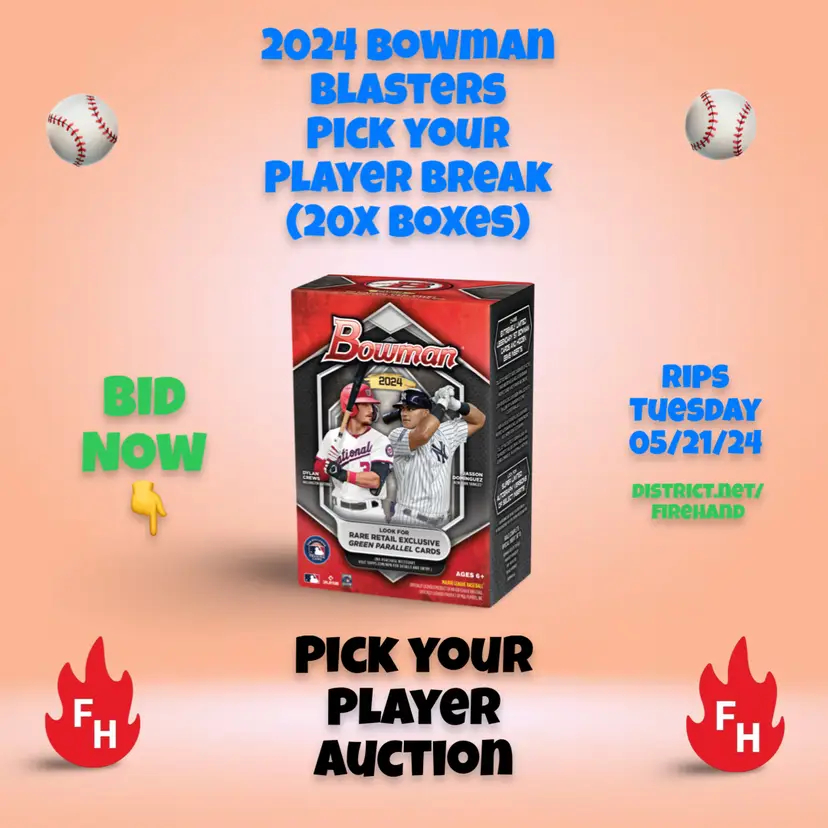 You are bidding on the cards of the team listed in the title in this 20x Blaster Break of 2024 Bowman Baseball Cards. Auctions end Monday and Tuesday evening; Cases will be opened LIVE immediately following auctions ending on Tuesday May 21 (apx. 9 PM EST / 6 PM PST) with notifications to go out across the Firehand Cards community when live on District and simulcast to our YouTube channel (https://www.youtube.com/channel/UCETc4FyfADGzg3vTTww-Qew). US Shipping is $5 for your first auction spot won and only $.25 per each additional spot you win! Any spot won where no cards of the player are found in the box will receive a bonus card or pack from Firehand Cards. Any hits pulled (Cut Signatures, Hidden Gems etc.) of a player who is NOT listed in the auction will be assigned by draw between all participants. Any dual or multi-auto cards featuring multiple players will be randomized live between the spots depicted on the card. NOTE - team names are provided for search purposes only - it could be possible that the player listed now plays for a different team or has a different team on the card, you will still get ALL the cards associated with this player.