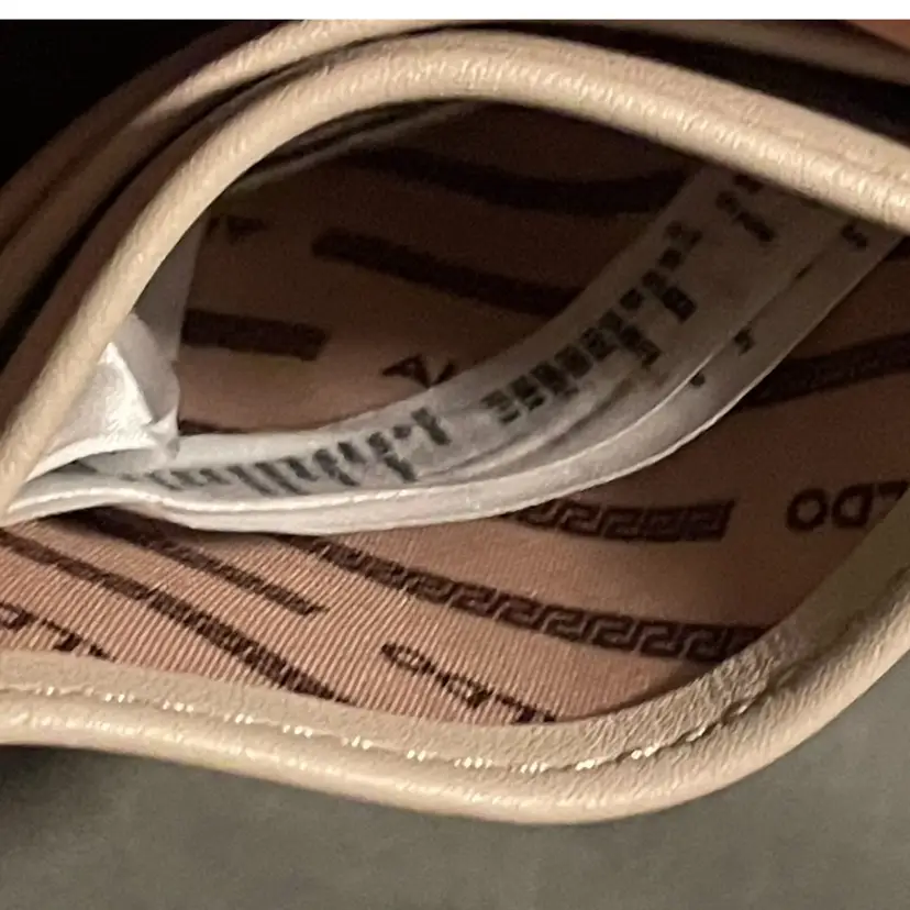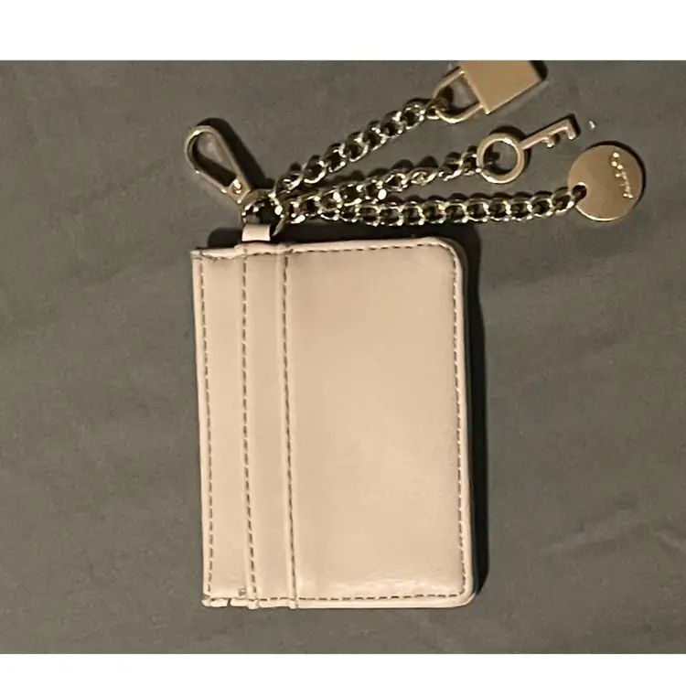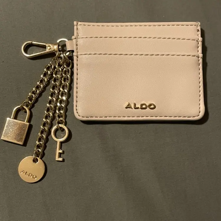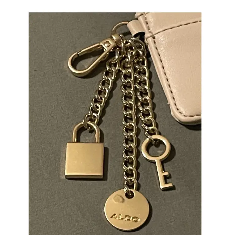 Chic Aldo card holder in light tan Includes gold keychain with lock and key charms. Perfect for organizing your essentials with ease.
