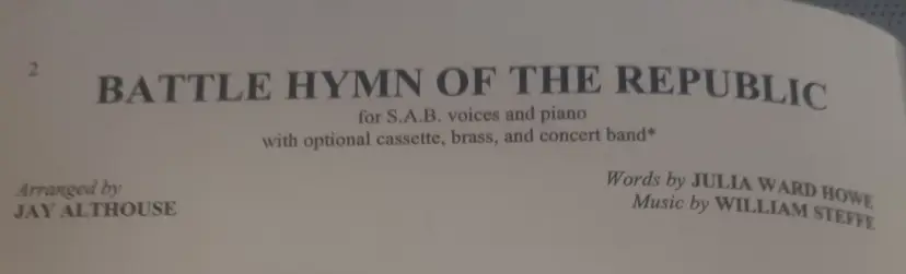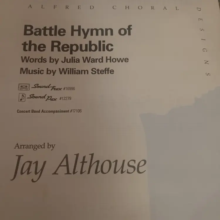 11 pp vocal score Level Three SAB with Piano Words Julia Ward Howe Music William Steffee Arranged by Jay Althouse