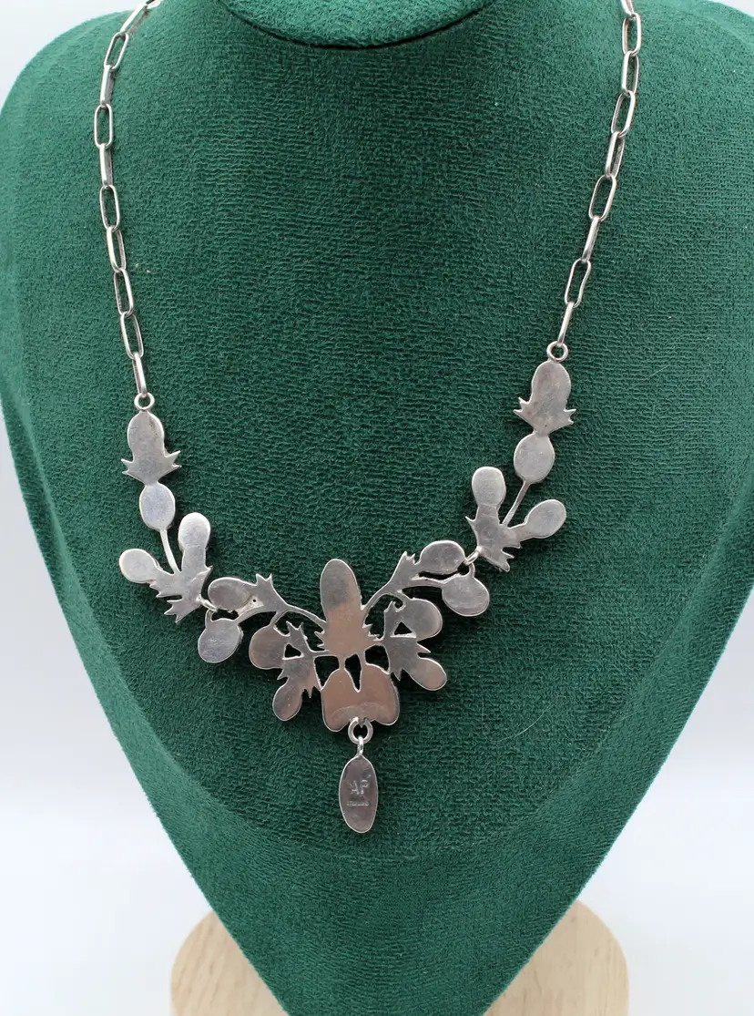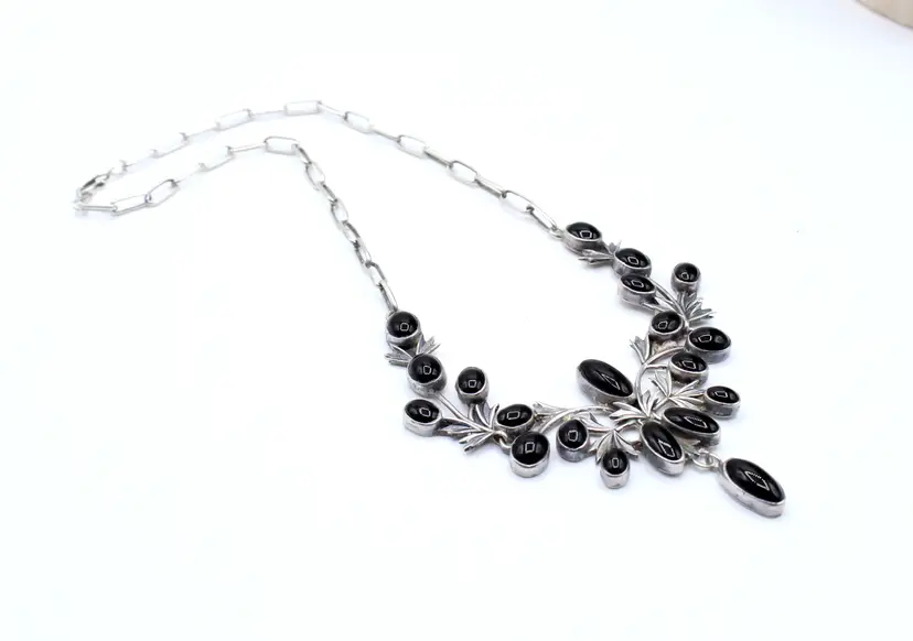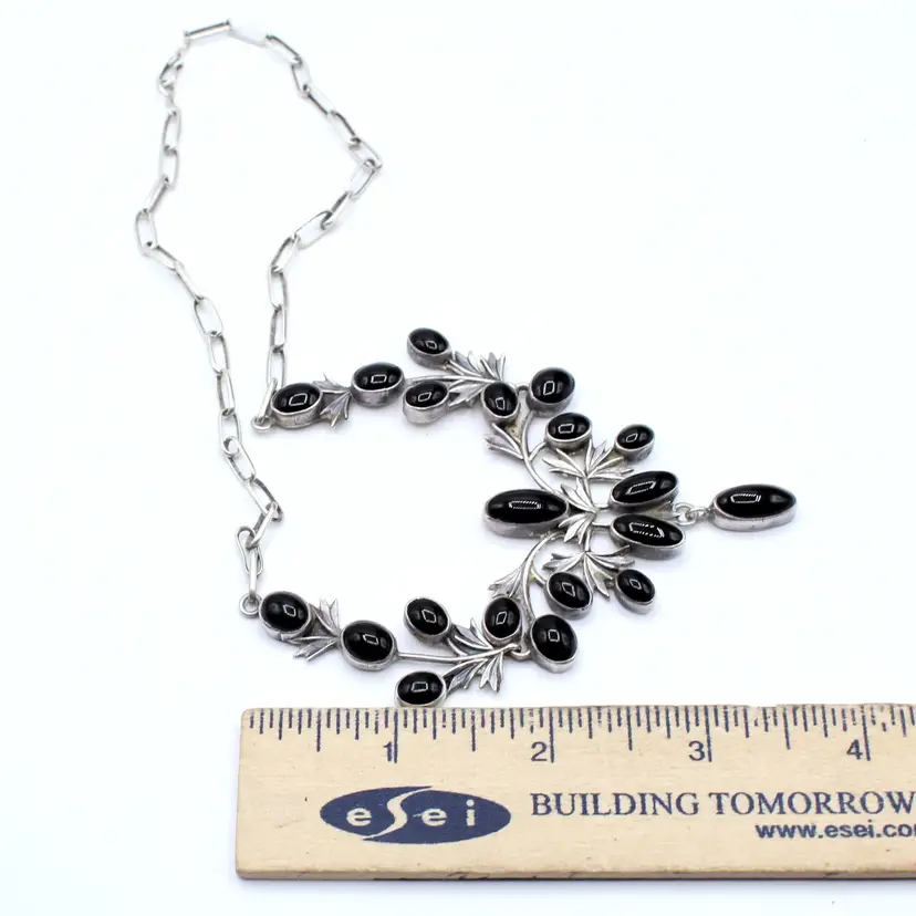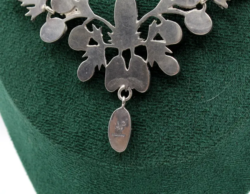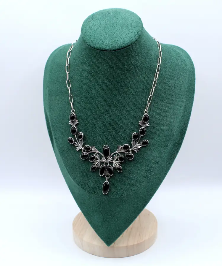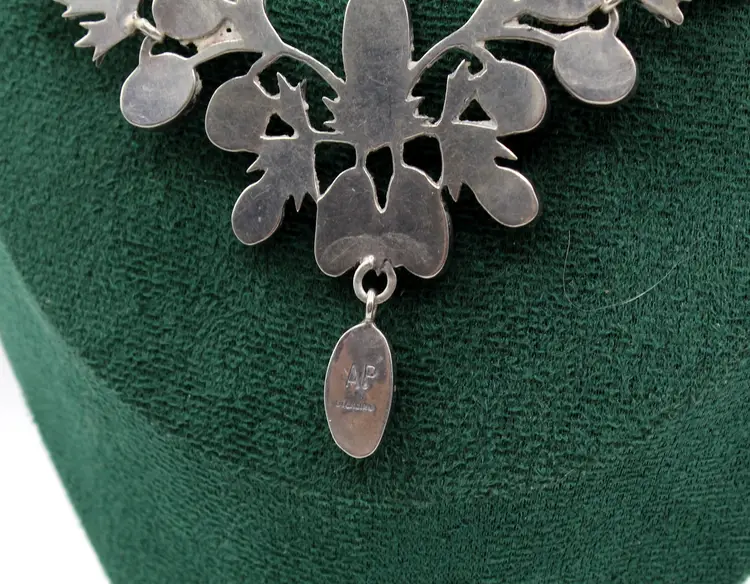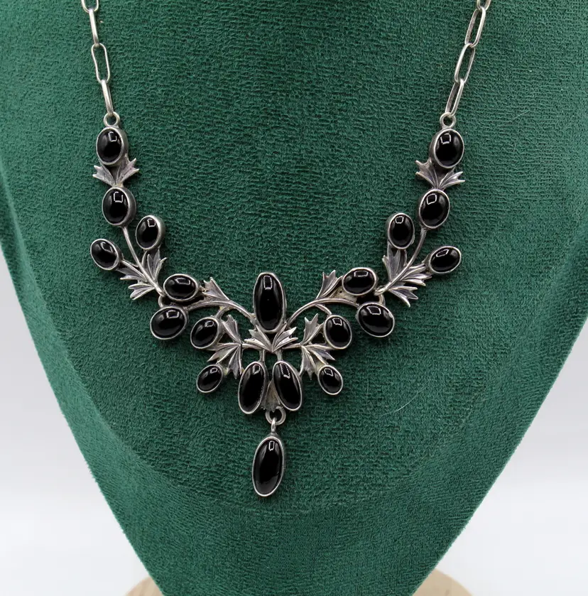 Beautiful signed AP sterling necklace. Research suggestion shows this could be a Alice Platero, Amos Platero or Antoninette Platero (Laguna). The necklace has onyx stones set in a smooth bezel adorned with leaves. On a paperclip chain, this peace looks fairly modern.