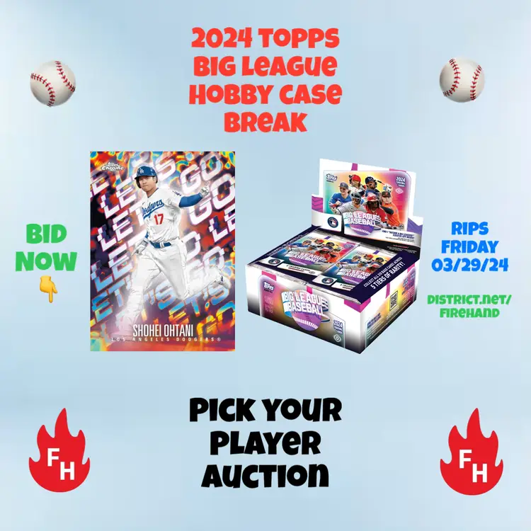 You are bidding on the cards of the player listed in the title in this Hobby Case of 2024 Topps Big League Baseball. Case will be opened LIVE after auctions end (apx. 8 PM PST) on Friday, 03/29/2024 on our YouTube channel (https://www.youtube.com/channel/UCETc4FyfADGzg3vTTww-Qew). US Shipping is $5 for your first auction spot won and only $.25 per each additional spot you win! Any spot won where no cards of the player are found in the box will receive a bonus card or pack from Firehand Cards. Any hits pulled (Cut Signatures, Hidden Gems etc.) of a player who is NOT listed in the auction will be assigned by draw between all participants. Any dual or multi-auto cards featuring multiple players will be randomized live between the spots depicted on the card. NOTE - team names are provided for search purposes only - it could be possible that the player listed now plays for a different team or has a different team on the card, you will still get ALL the cards associated with this player.