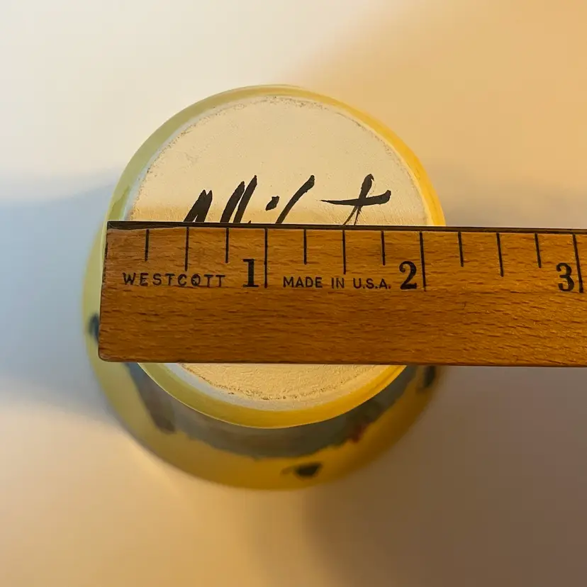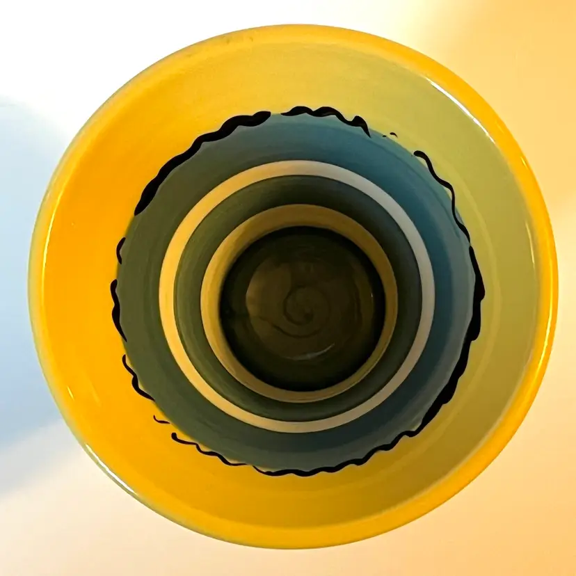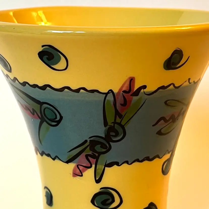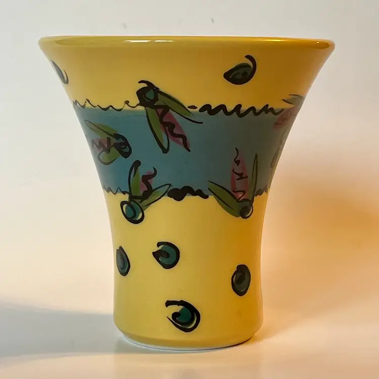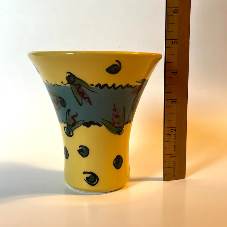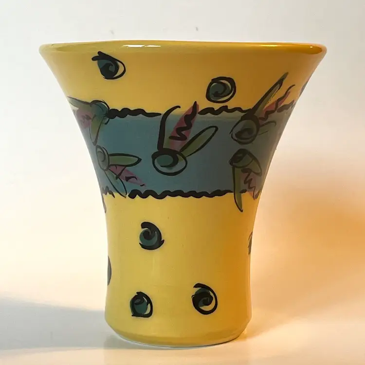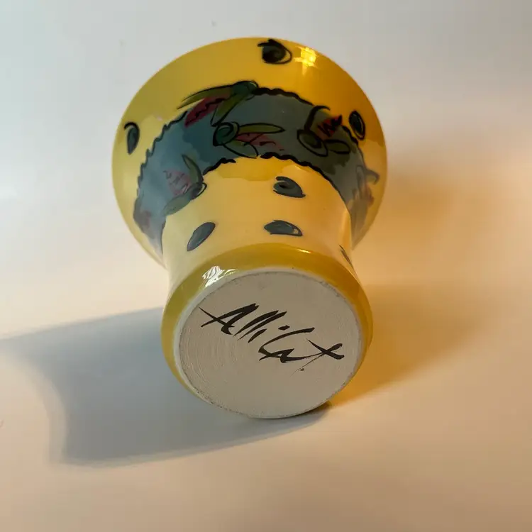This fun and whimsical pottery vase is a creation of renowned New England potter Allison Arnold (1958-2010).This Lake Fly themed vase is a beautifully crafted piece of art pottery featuring colorful design work inside and out. This 4.5" H vase has a flared top and a painted signature on bottom. Produced in Canaan, ME during the late 20th - early 21st century. EXCELLENT pre-owned piece. No chips, cracks or damage. SEE PHOTOS.