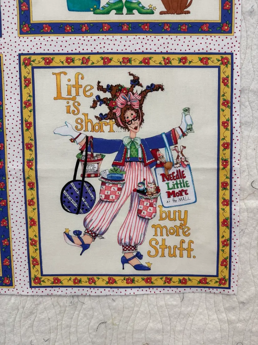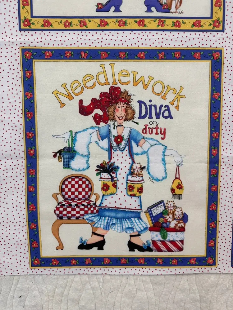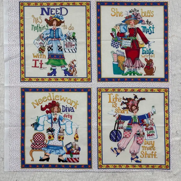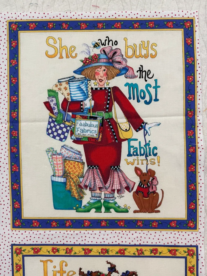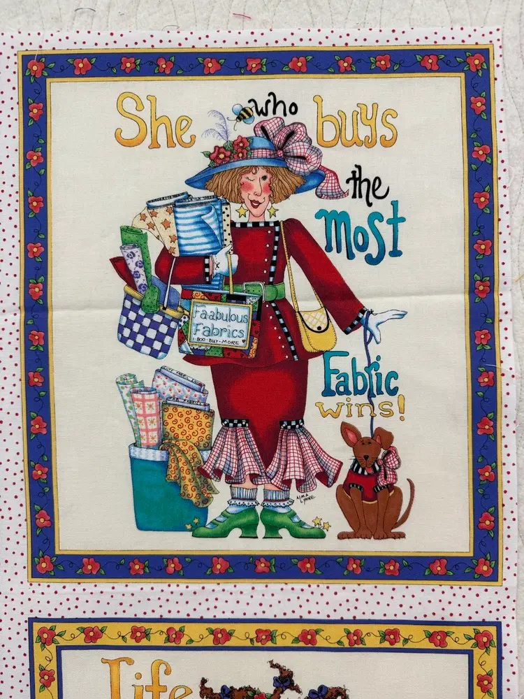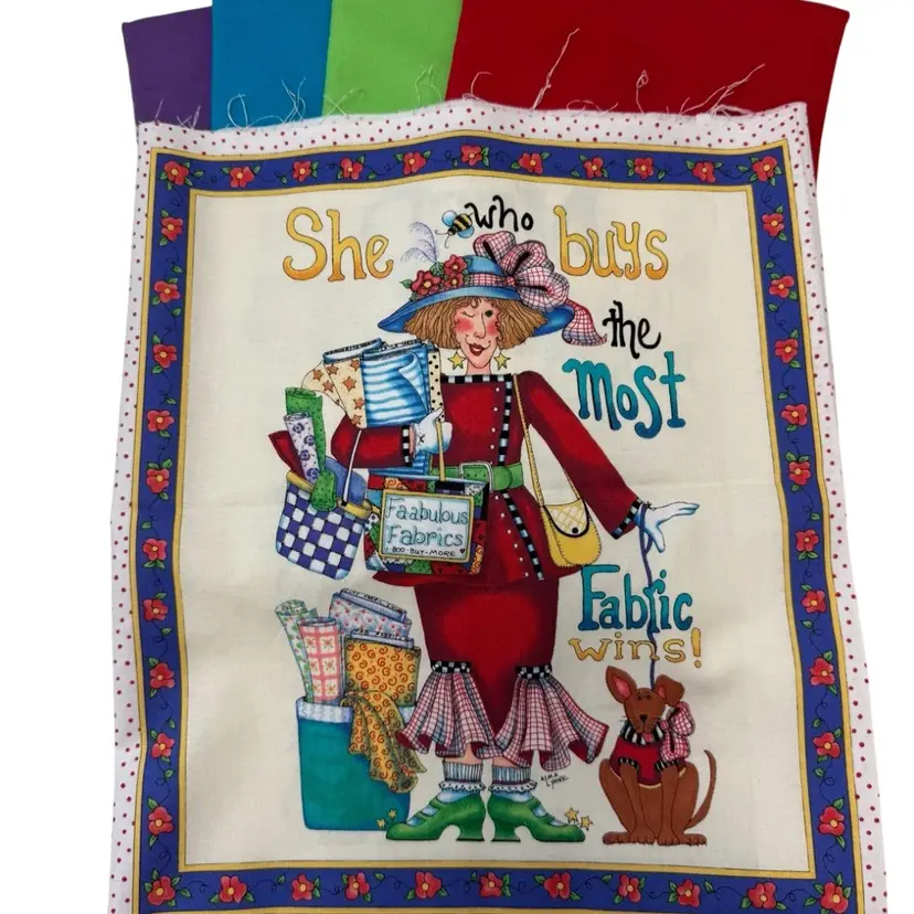 Out of print “She who has the most fabric wins” fabric panel and 4 matching solids. Each solid is 1/2 yard, for a total of 2 yards plus the panel