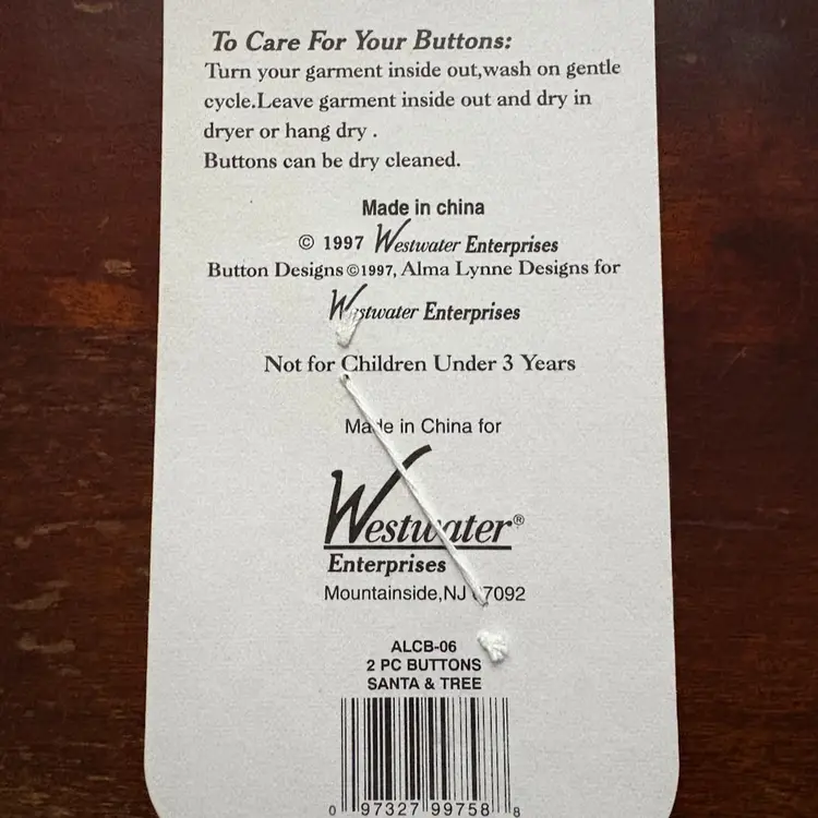 Alma Lynne Ceramic Christmas Buttons Set of 2 buttons Featuring Santa and tree Sizes are approximately1 1/2 inches by 3/4 inches 1997