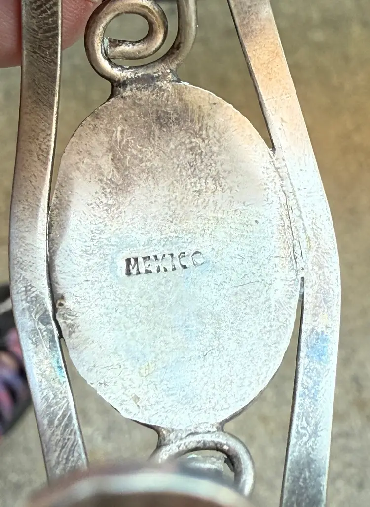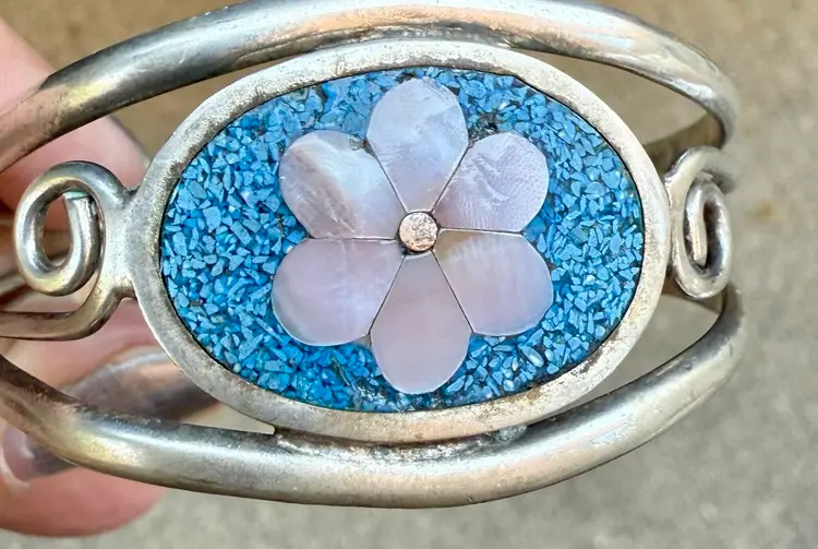 This uniquely crafted vintage cuff features and simple yet beautiful inlay of a abalone e shell flower.