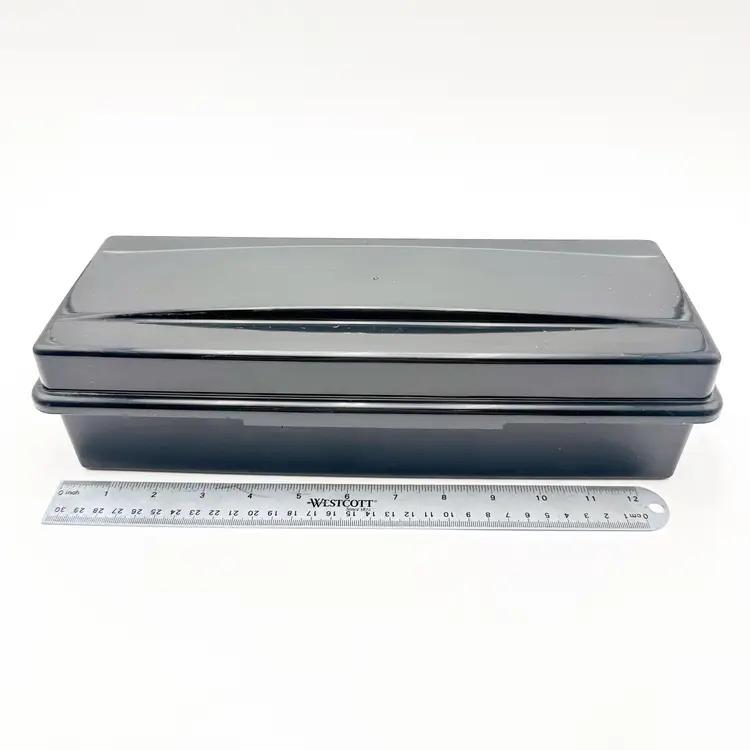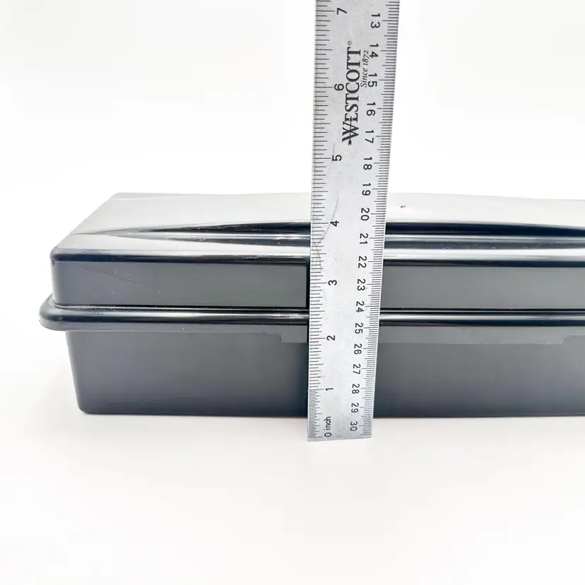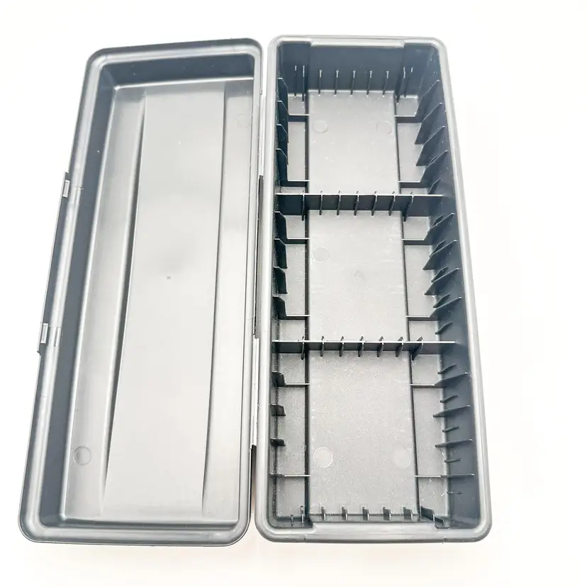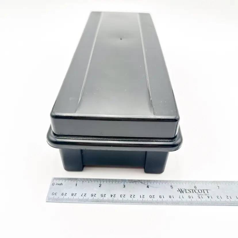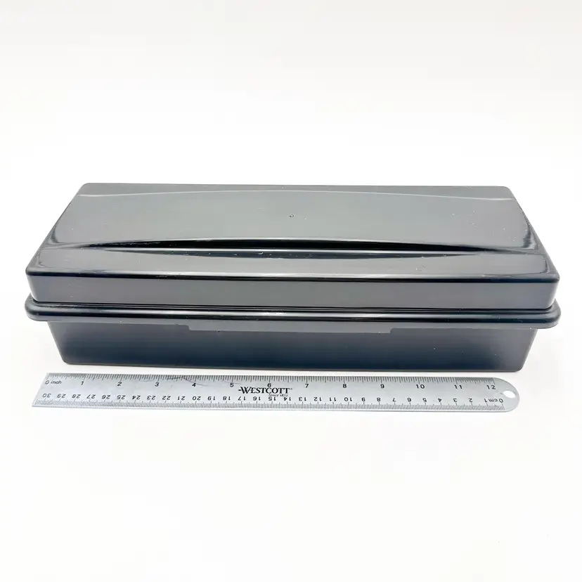 Black plastic storage box for cassette tapes by ALPHA Compartments for cased and loose cassettes Very good condition, some surface wear, see all photos Approximately 14" L x 5'5" W x 3.5" H