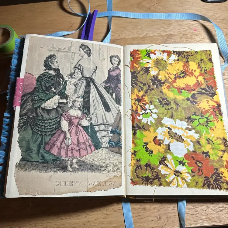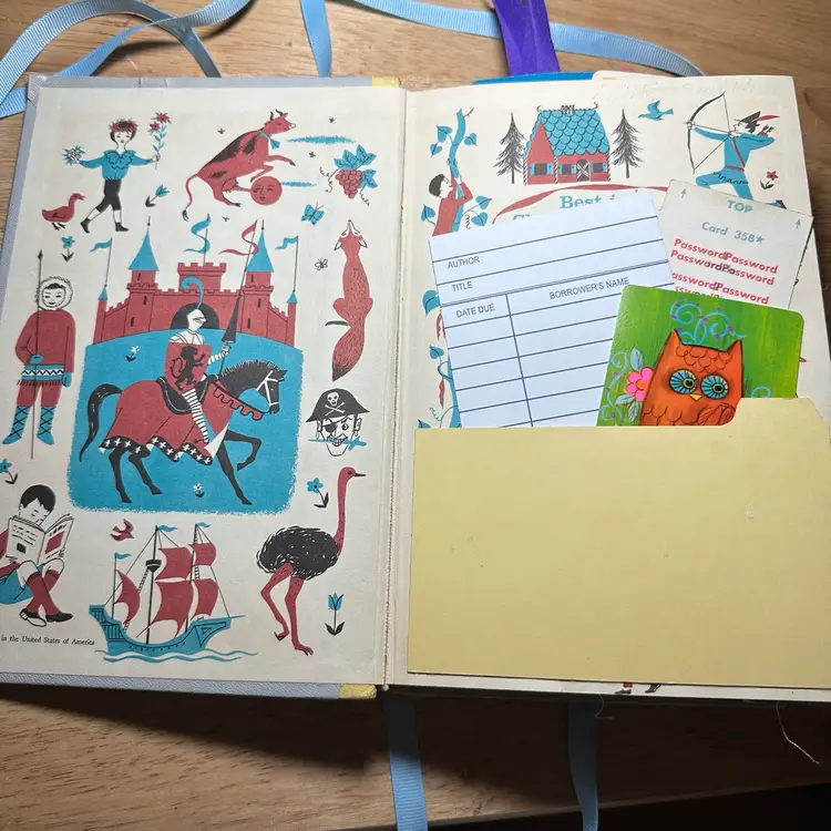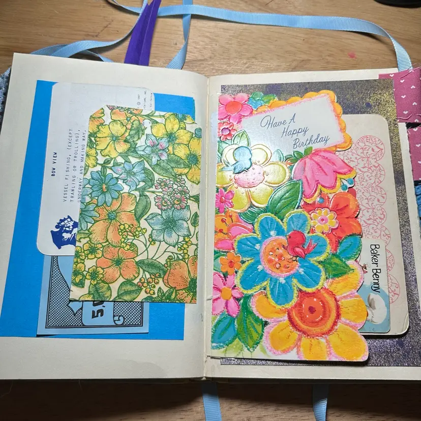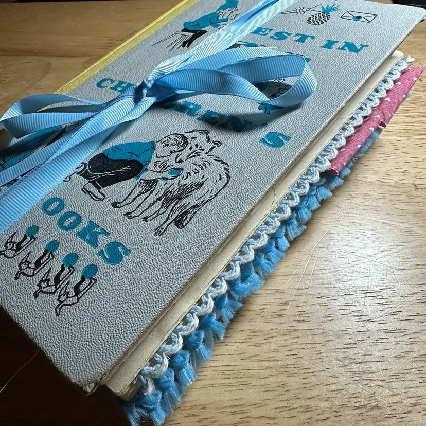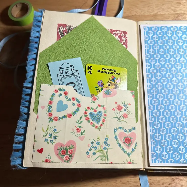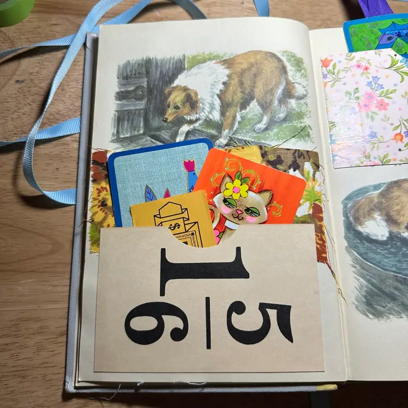 This is an interactive art piece that starts with a vintage “Best In Children’s Books” and is altered to provide space for journal, adding your own photos, or filling with ephemera. It includes vintage playing cards converted into journaling cards, game score sheets, vintage advertising and one magazine plate from the 1800s.
