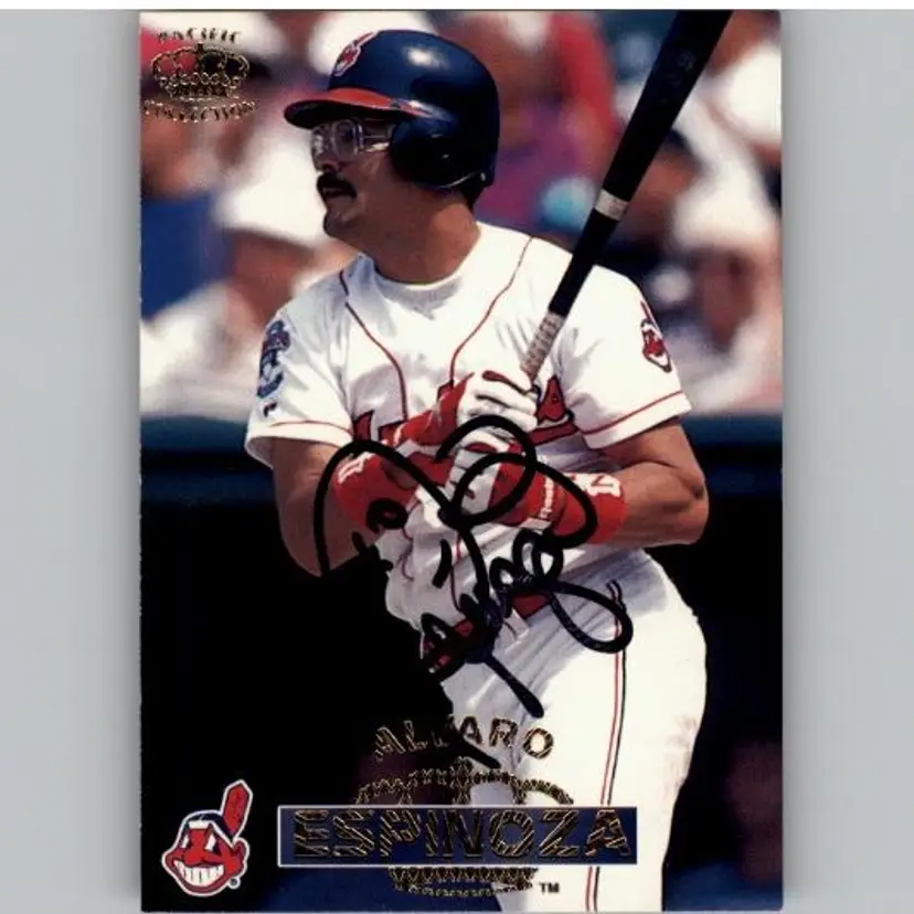 Authentic 1996 Pinnacle baseball card featuring Alvaro Espinoza of the Cleveland Indians, signed boldly in black Sharpie. A great addition for Indians fans and autograph collectors. Your purchase supports Signatures For Soldiers in helping homeless and disabled veterans.