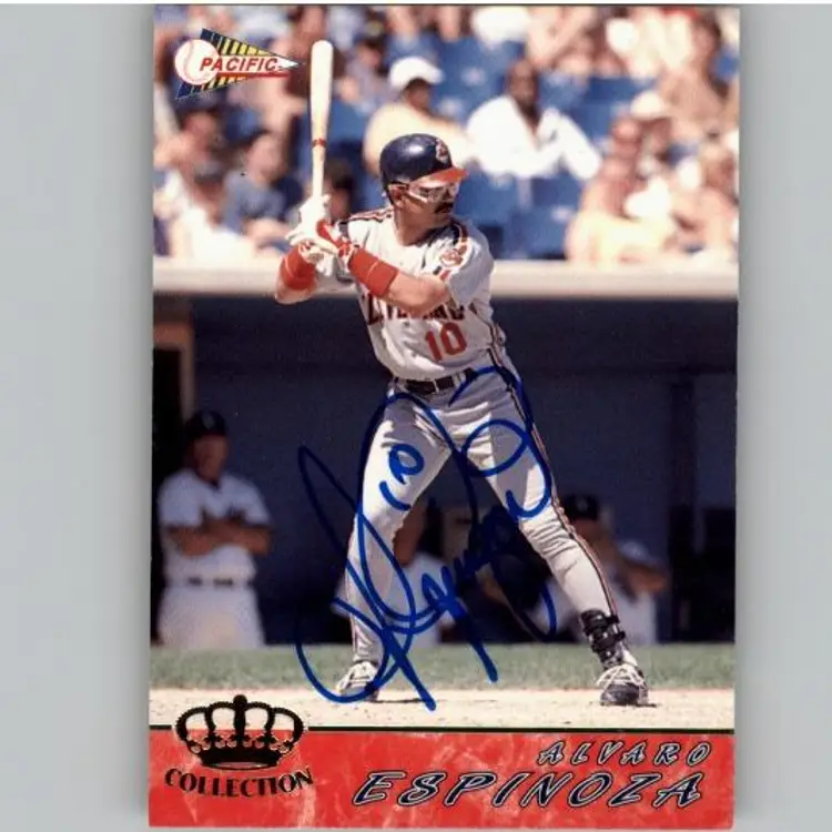 Authentic Pacific Collection baseball card featuring Alvaro Espinoza of the Cleveland Indians, signed boldly in blue Sharpie. A great addition for Indians fans and autograph collectors. Your purchase supports Signatures For Soldiers in helping homeless and disabled veterans.