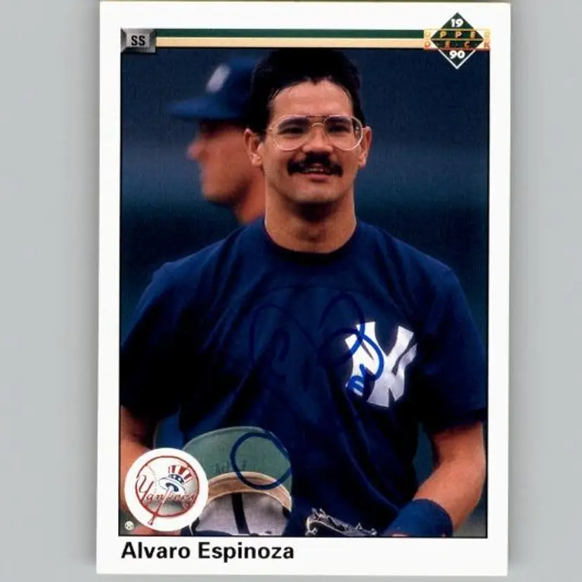 Authentic 1990 Upper Deck baseball card featuring Alvaro Espinoza of the New York Yankees, signed in blue Sharpie. A great addition for Yankees fans and autograph card collectors. Your purchase supports Signatures For Soldiers in helping homeless and disabled veterans.