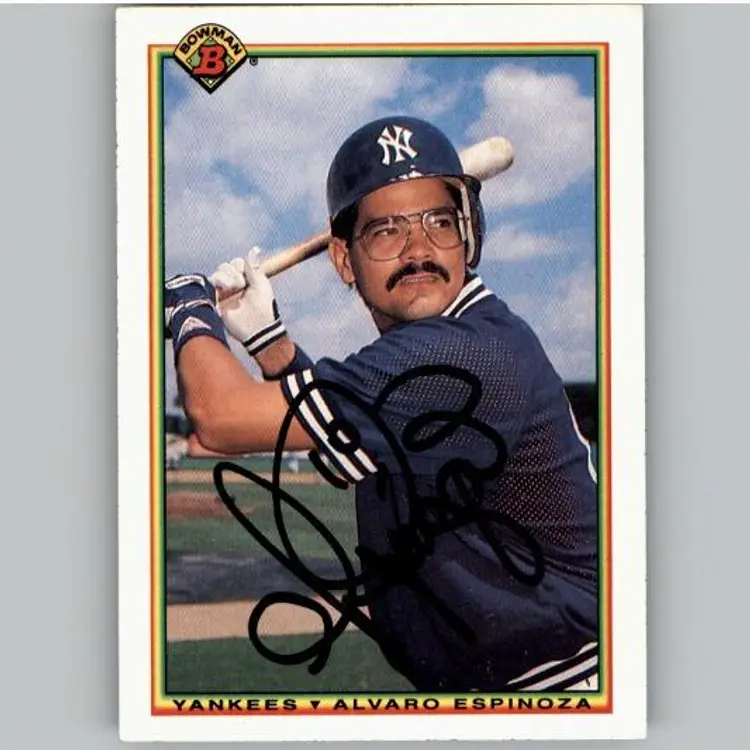 Authentic 1990 Bowman baseball card featuring Alvaro Espinoza of the New York Yankees, signed boldly in black Sharpie. A great addition for Yankees fans and autograph collectors. Your purchase supports Signatures For Soldiers in helping homeless and disabled veterans.