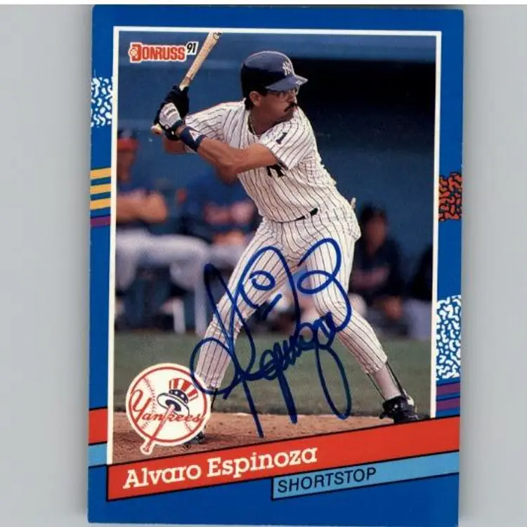Authentic 1991 Donruss baseball card featuring Alvaro Espinoza of the New York Yankees, signed boldly in blue Sharpie. A great addition for Yankees fans and autograph collectors. Your purchase supports Signatures For Soldiers in helping homeless and disabled veterans.