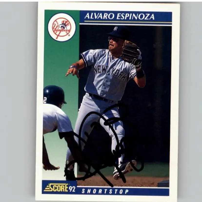 Authentic 1992 Score baseball card featuring Alvaro Espinoza of the New York Yankees, signed boldly in black Sharpie. A great addition for Yankees fans and autograph collectors. Your purchase supports Signatures For Soldiers in helping homeless and disabled veterans.