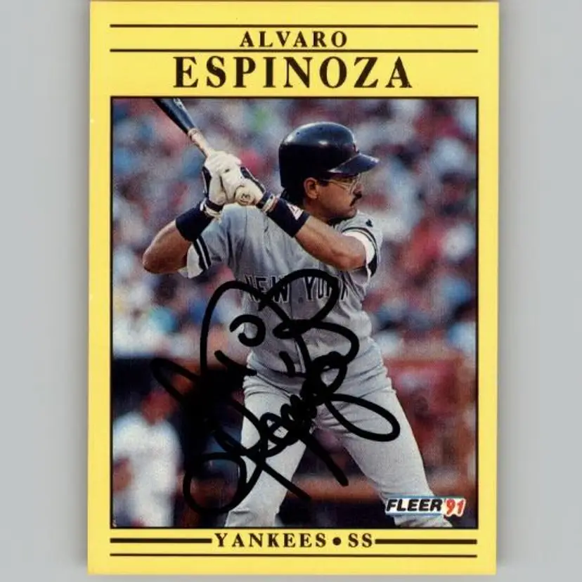 Authentic 1991 Fleer baseball card featuring Alvaro Espinoza of the New York Yankees, signed boldly in black Sharpie. A great addition for Yankees fans and autograph collectors. Your purchase supports Signatures For Soldiers in helping homeless and disabled veterans.