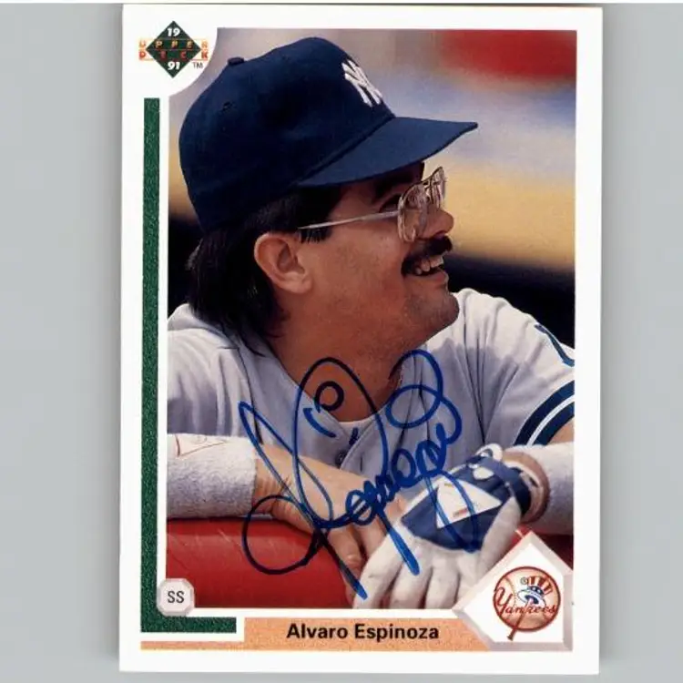 Authentic 1991 Upper Deck baseball card featuring Alvaro Espinoza of the New York Yankees, signed boldly in blue Sharpie. A must-have for Yankees fans and autograph collectors. Your purchase supports Signatures For Soldiers in aiding homeless and disabled veterans.