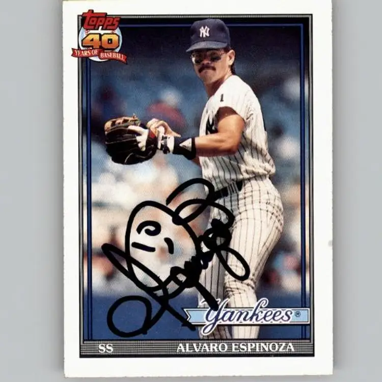 Authentic 1991 Topps baseball card featuring Alvaro Espinoza of the New York Yankees, signed boldly in black Sharpie. A great addition for Yankees fans and autograph collectors. Your purchase supports Signatures For Soldiers in helping homeless and disabled veterans.