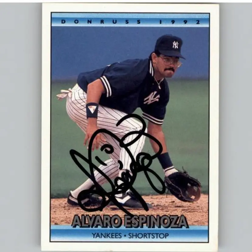 Authentic 1992 Donruss baseball card featuring Alvaro Espinoza of the New York Yankees, signed boldly in black Sharpie. A must-have for Yankees fans and autograph collectors. Your purchase supports Signatures For Soldiers in aiding homeless and disabled veterans.