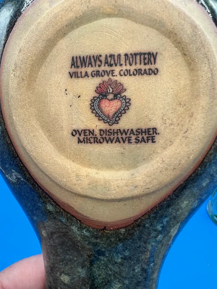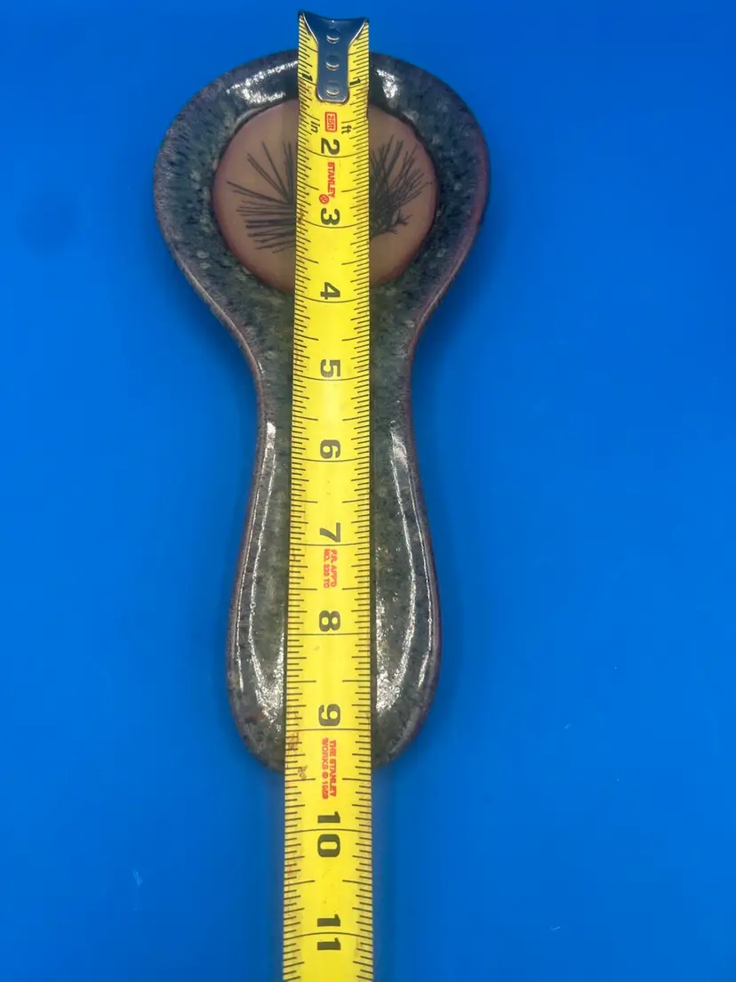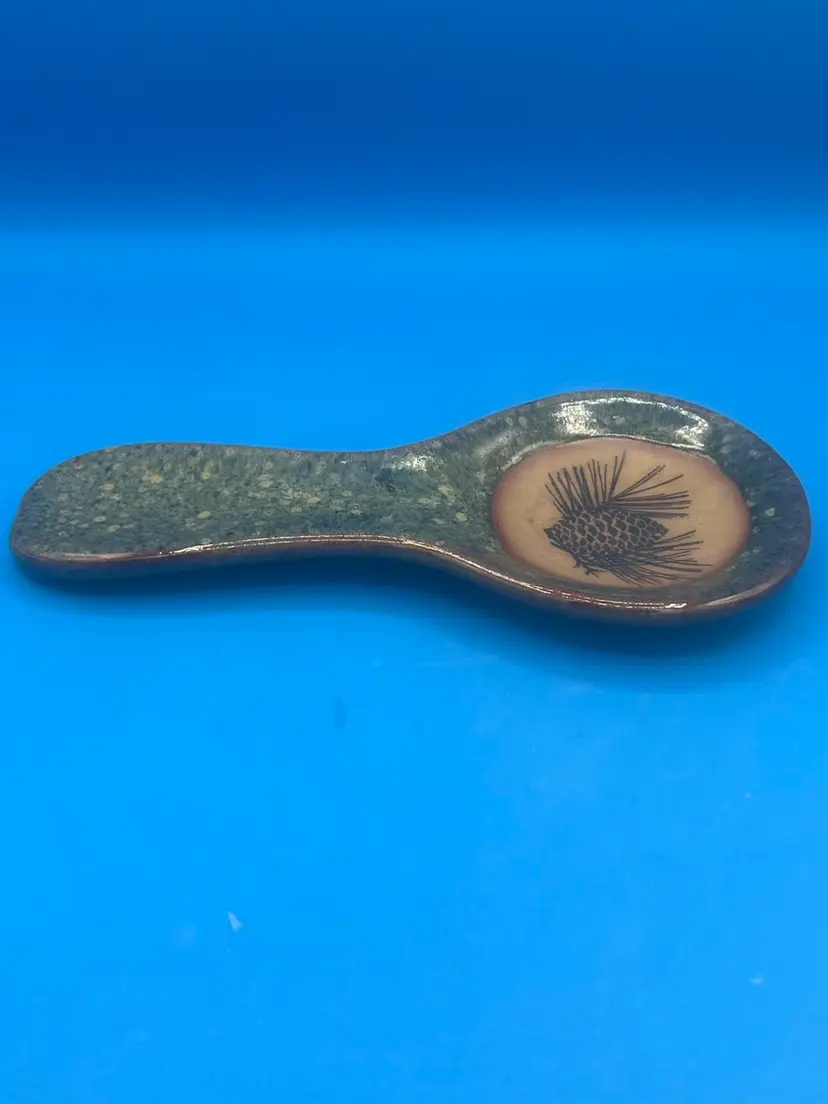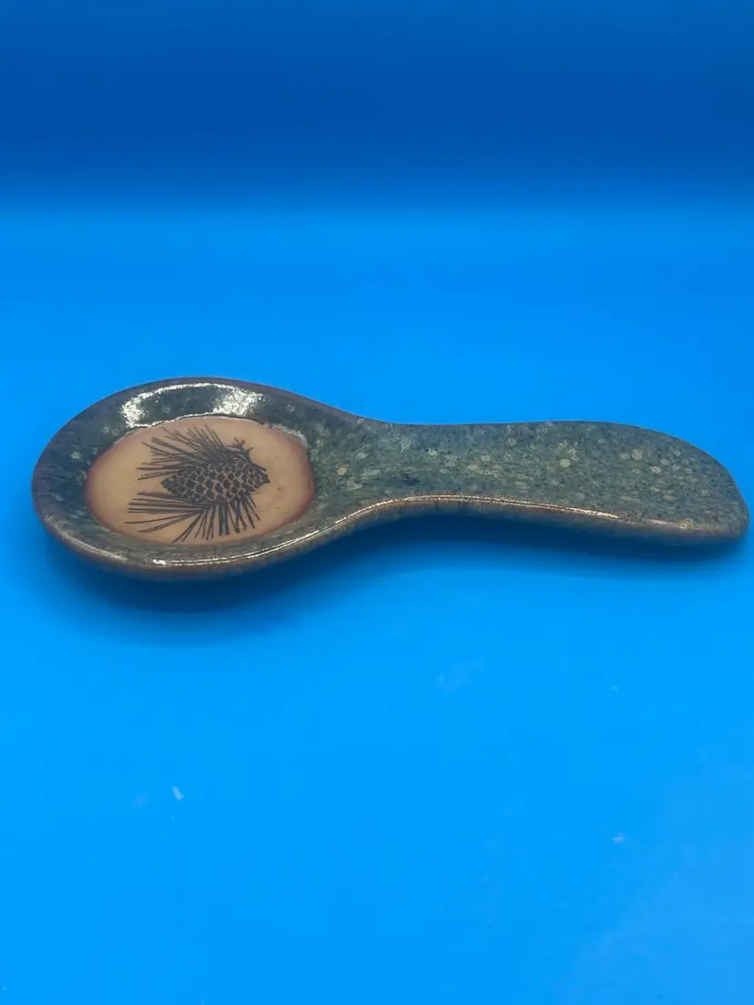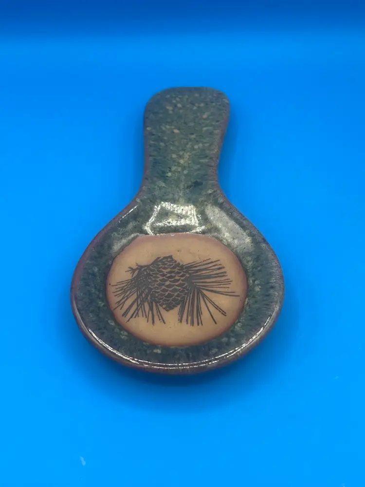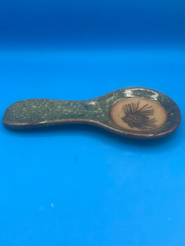 This is a handmade Always Azul pottery spoon rest with a pinecone design. It was hand-crafted to be both functional and decorative. It's a rustic green and tan color measuring 9 1/2 inches.