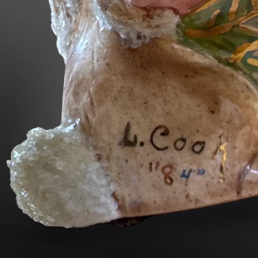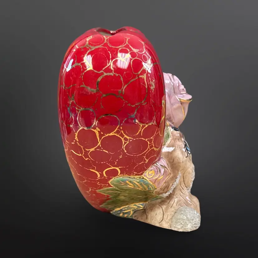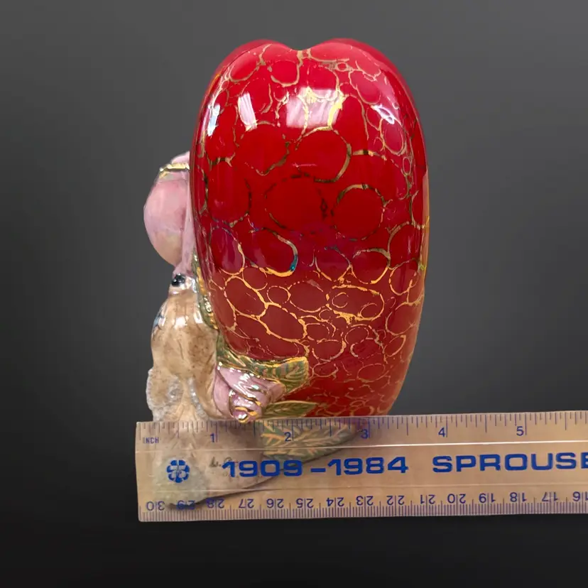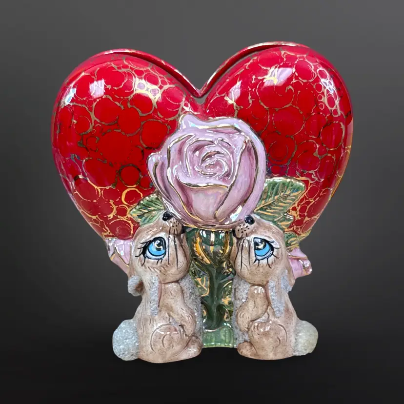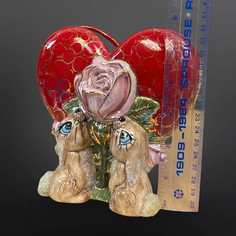 This piece is so well done! It features two bunnies with sugar detailing with a pink rose on a red heart with gold accents. It is signed L. Cook ‘84. In great condition with no chips or cracks. Measures approximately 5.5” L x 3.5” W x 5.5” H