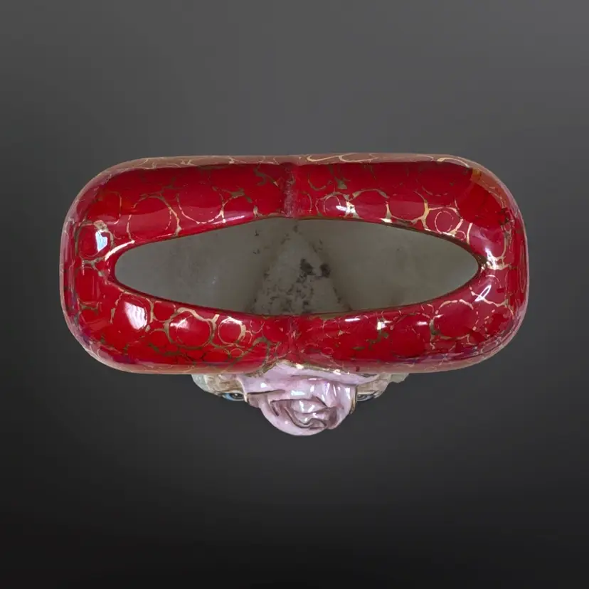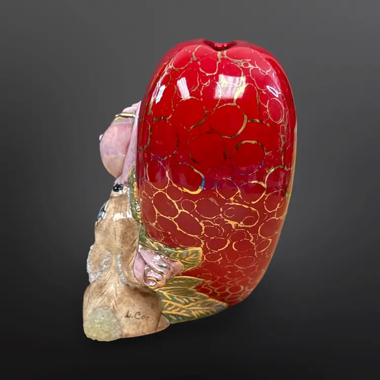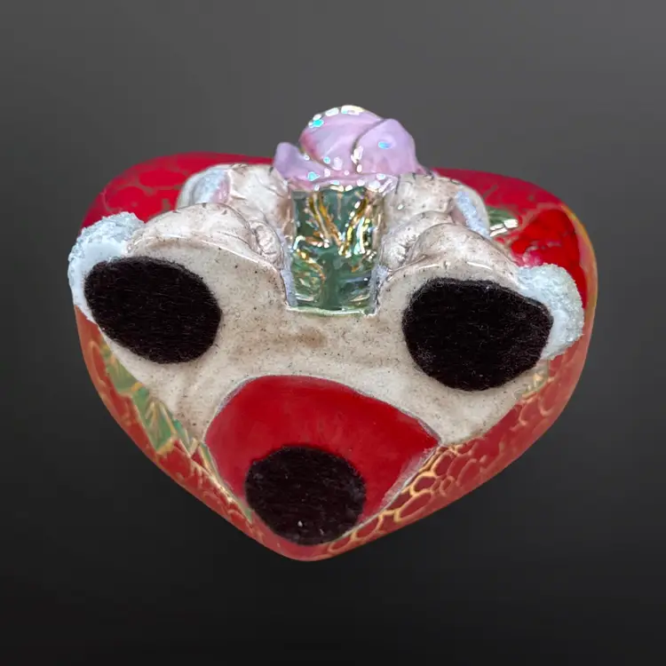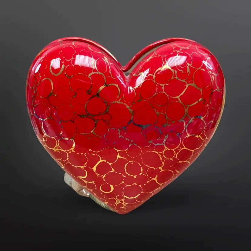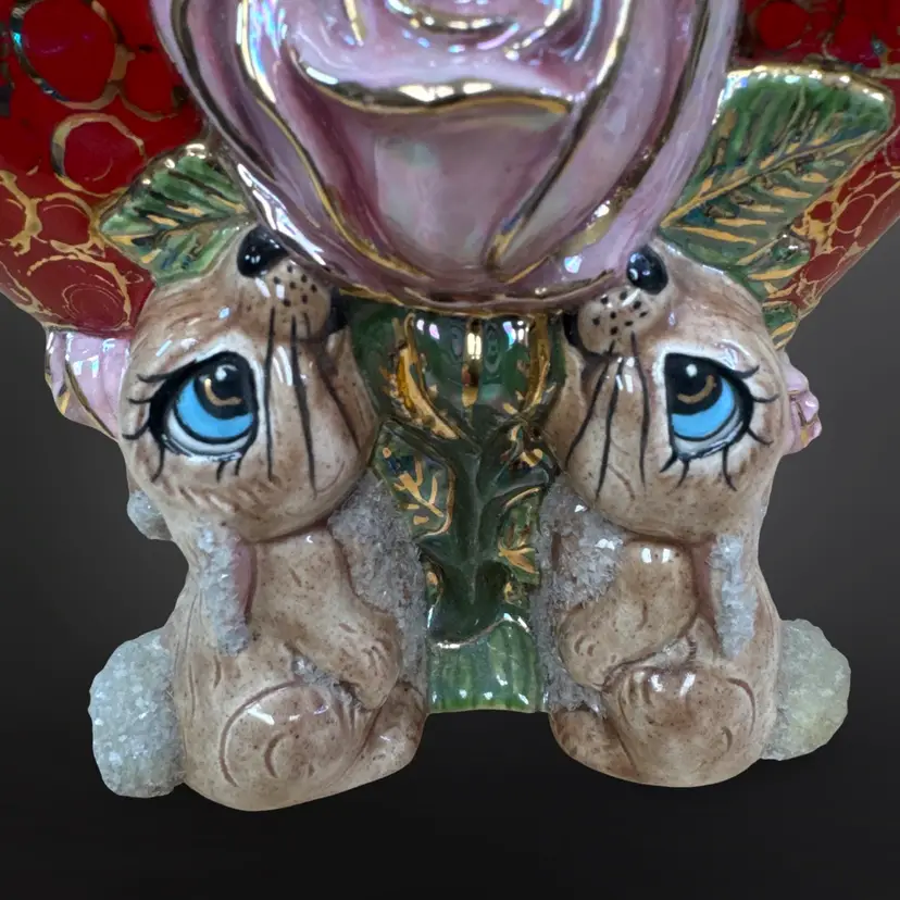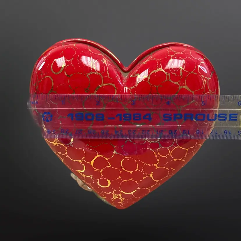 This piece is so well done! It features two bunnies with sugar detailing with a pink rose on a red heart with gold accents. It is signed L. Cook ‘84. In great condition with no chips or cracks. Measures approximately 5.5” L x 3.5” W x 5.5” H
