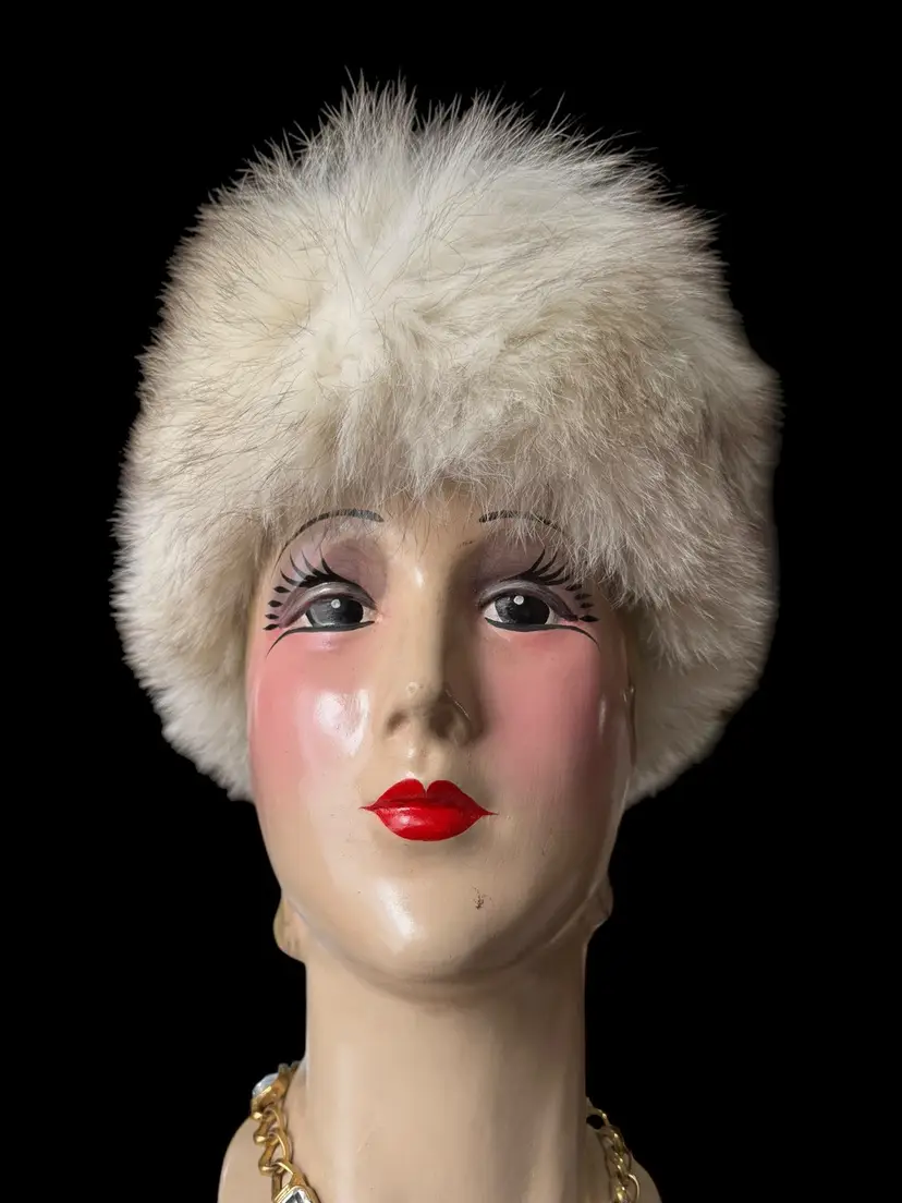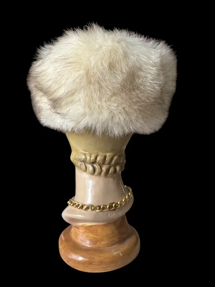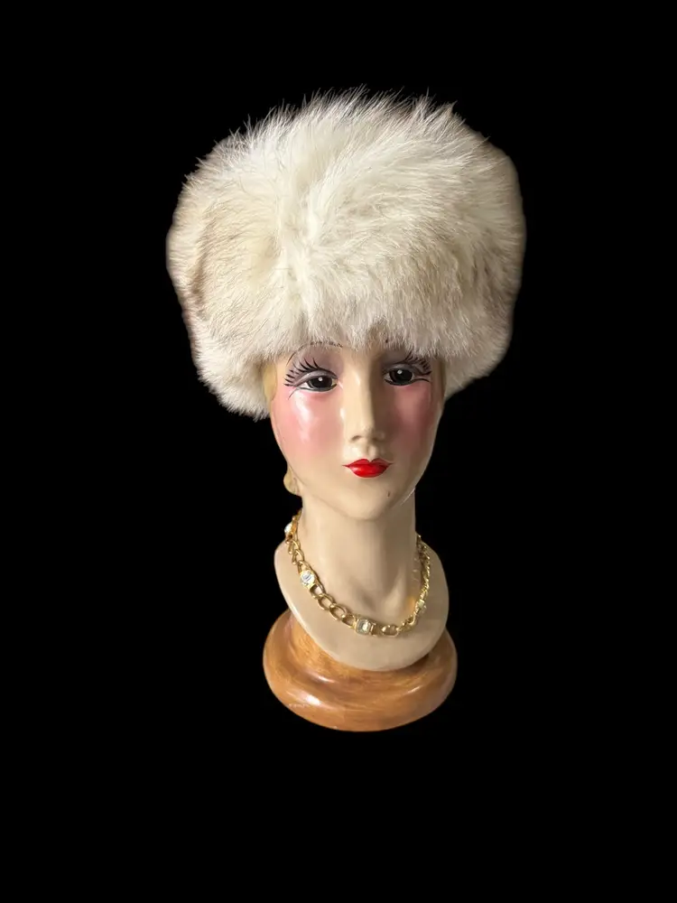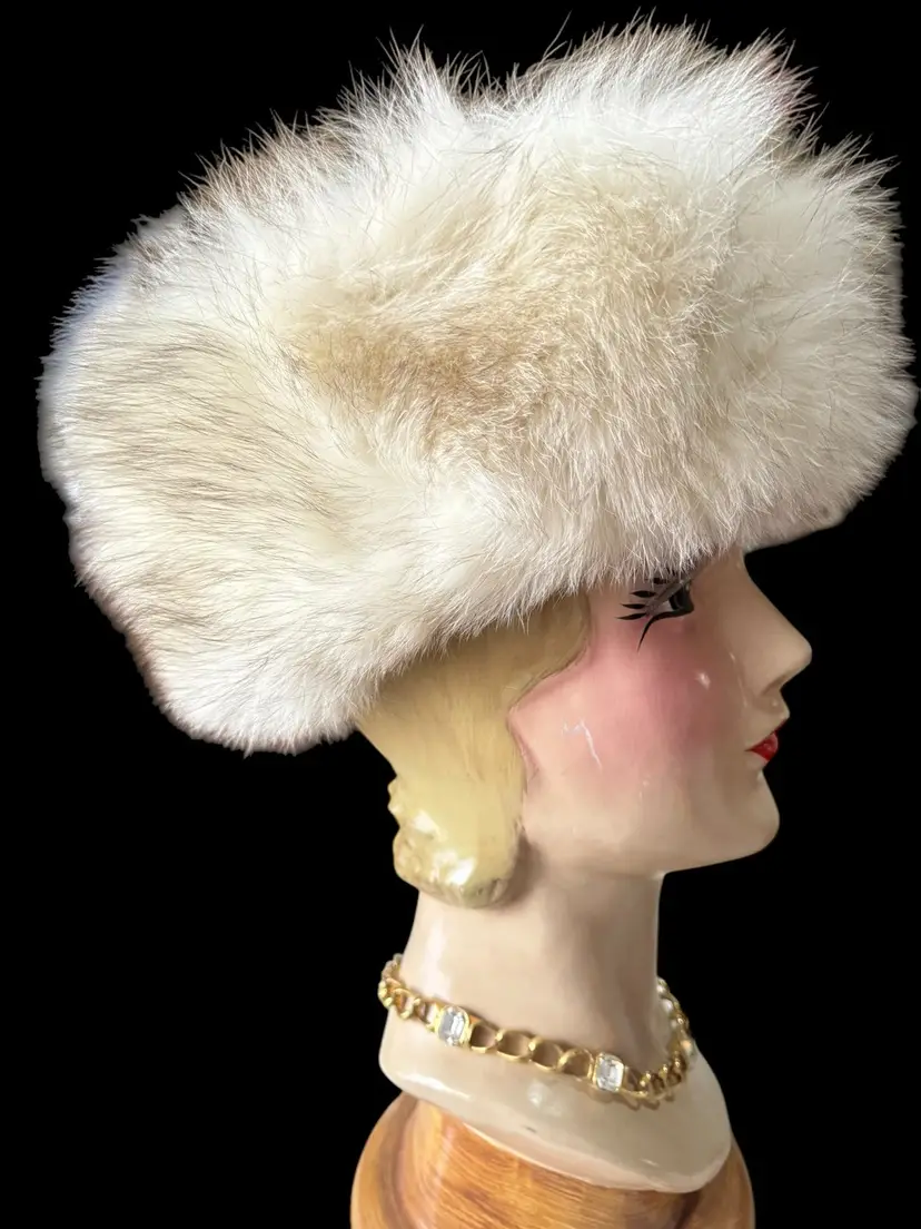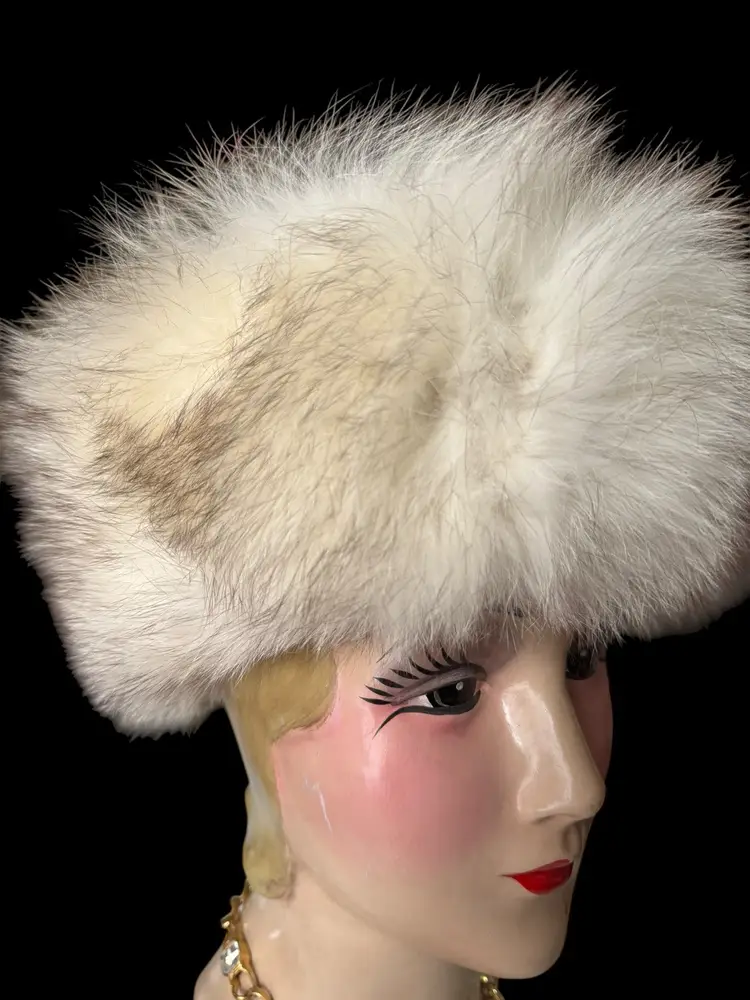 This is a beautiful vintage 90’s blue fox fur hat. The hat is very classy super soft, long fox fur hairs. It has a soft gray interior lining that’s marked with some foreign symbol that says 93 .. very classy fur hat that will get lots of compliments ! Super warm .. the hat stand 7 inches tall, including the fur and 12 inches wide. The opening for the head is 9 inches and 5 inches deep.smoke and pet free