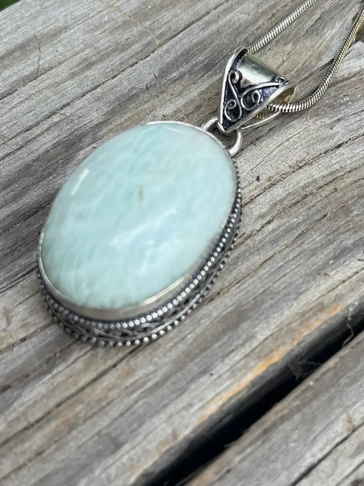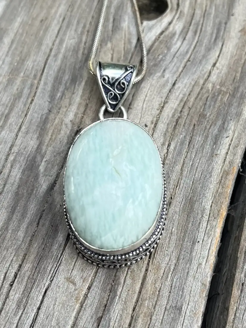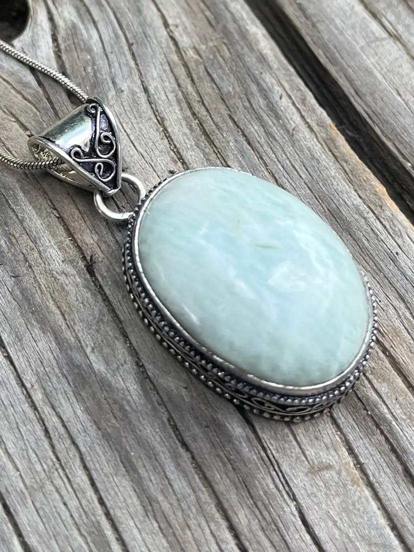 An Amazonite 925 sterling silver pendant. It measures approximately 1 7/8 inches long and 7/8 inches wide.