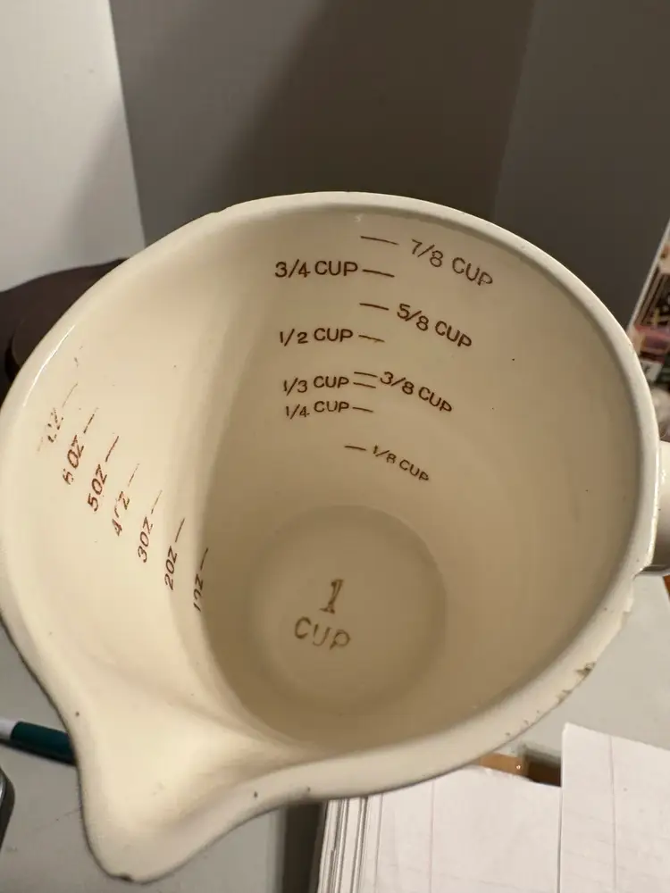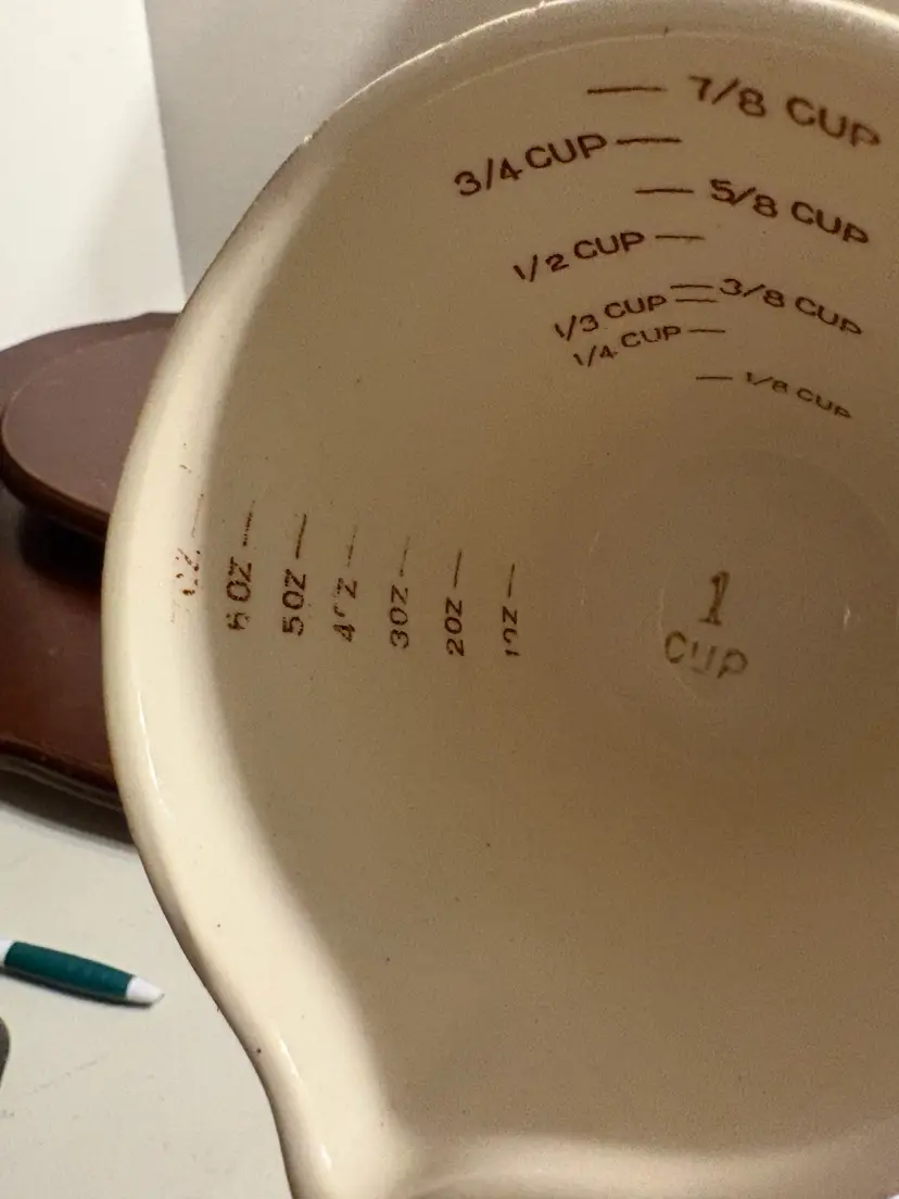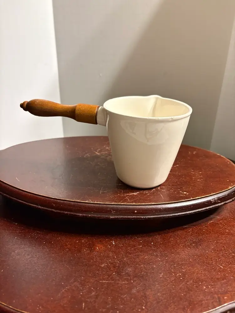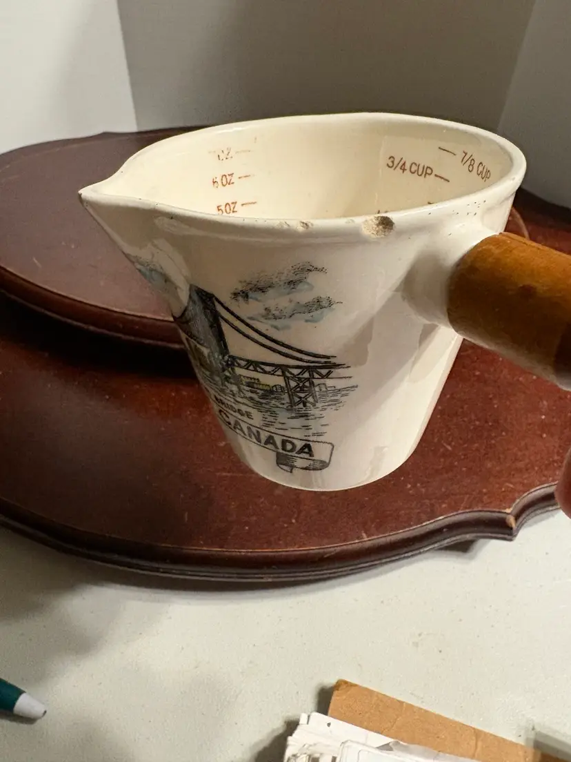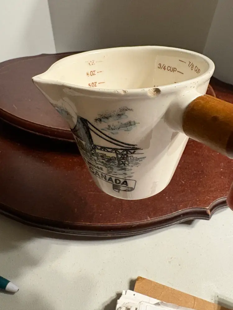 Ceramic and wood, 1 cup, several chips (see pics). Great crafting piece or for display, NOT recommended for use