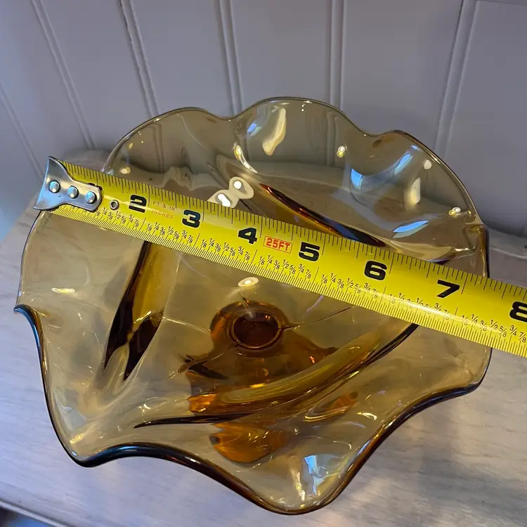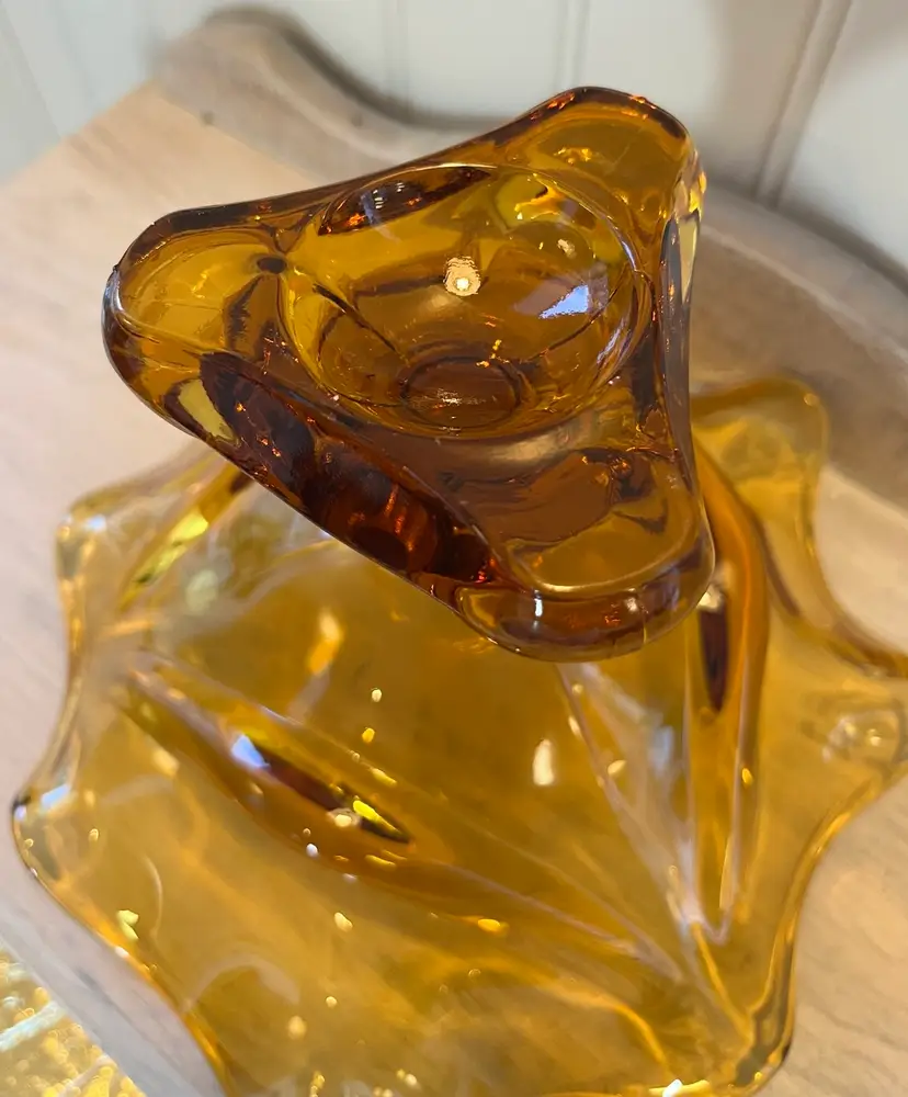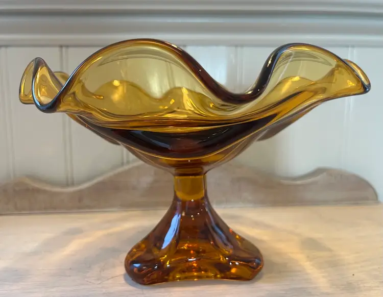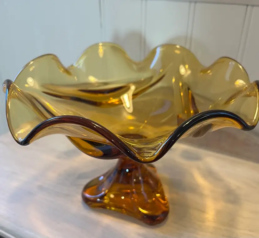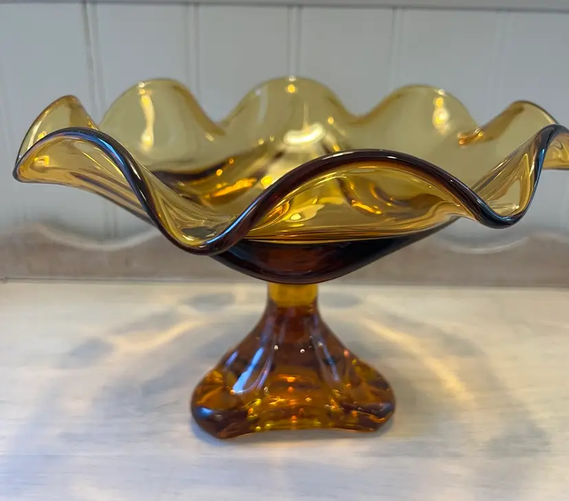 Beautiful vintage amber glass compote with a sculptural pedestal base and ruffled free-form rim. Heavy, quality art glass that makes a great centerpiece, candy dish, or décor accent.